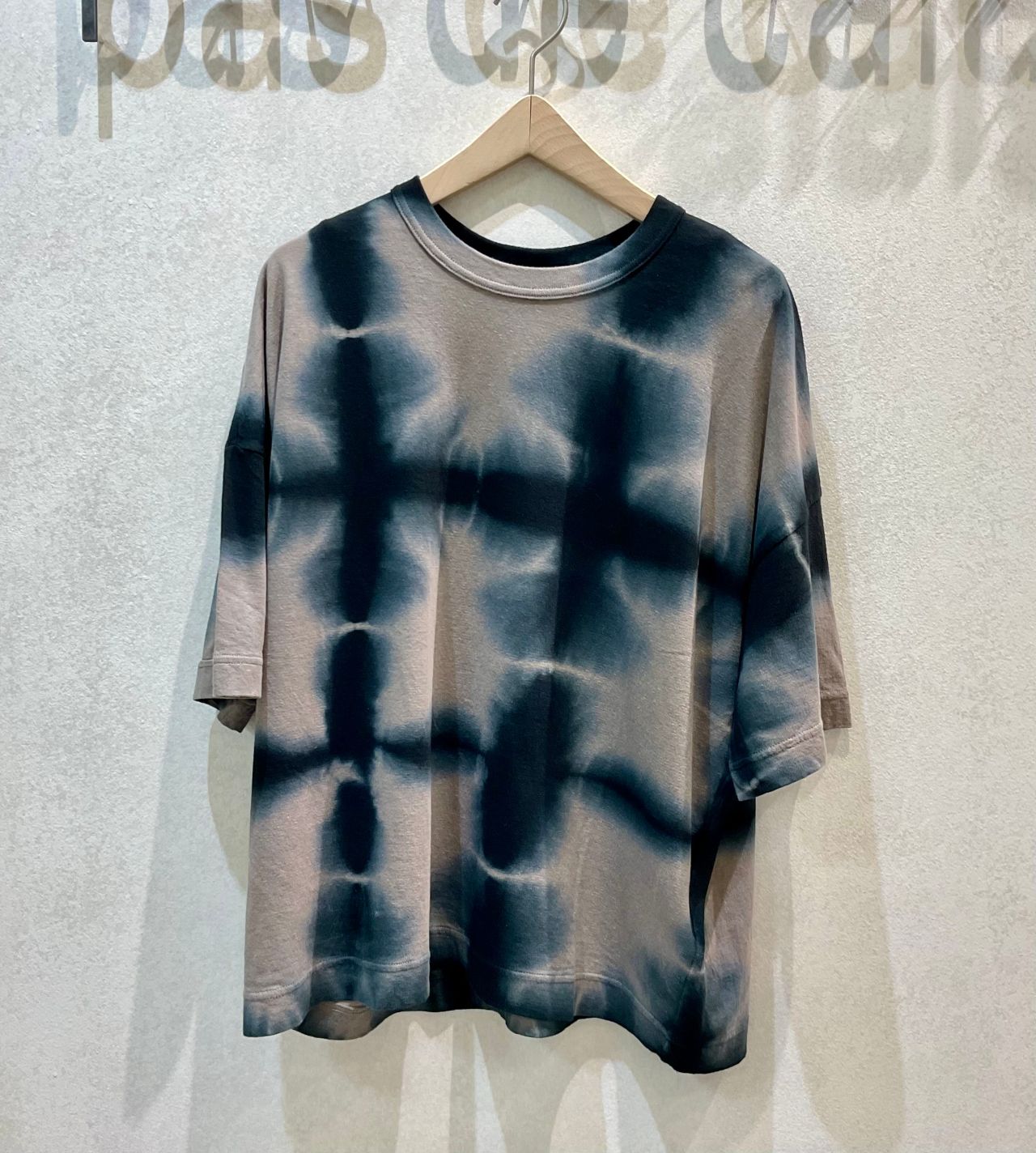 板締めの技法で手作業で丁寧に折りたたんだ品物を2枚の木の板で挟んでから染めていく染色技法の一つで、染料の浸透によって1点1点違った滲み具合に染上がり、ふたつと同じものがない特別な1着です。
