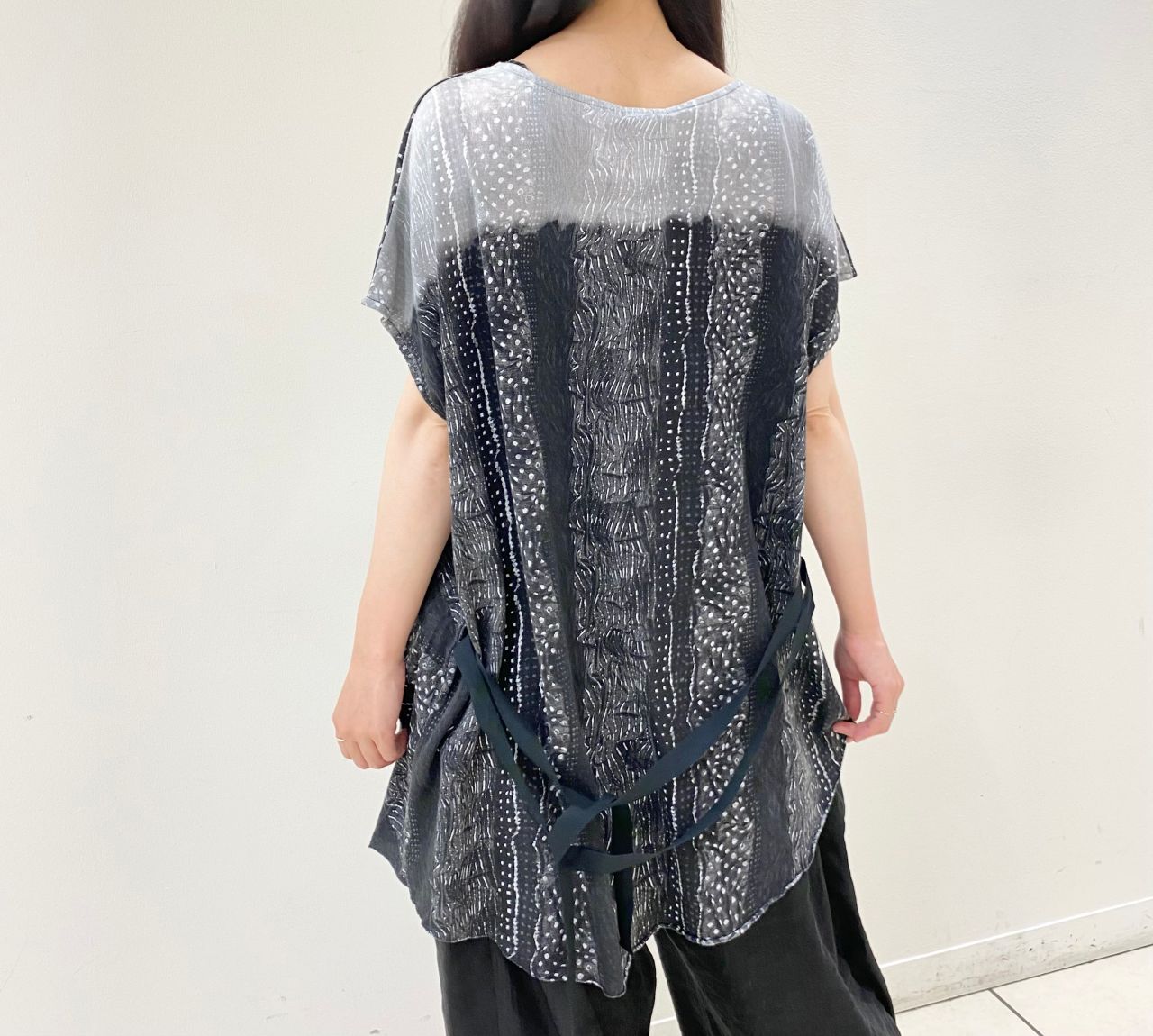 付属の紐ベルトでキュッとブラウジングさせたり、付けないで広がるシルエットをお楽しみいただいたりと、お好みで雰囲気を変えていただけます。