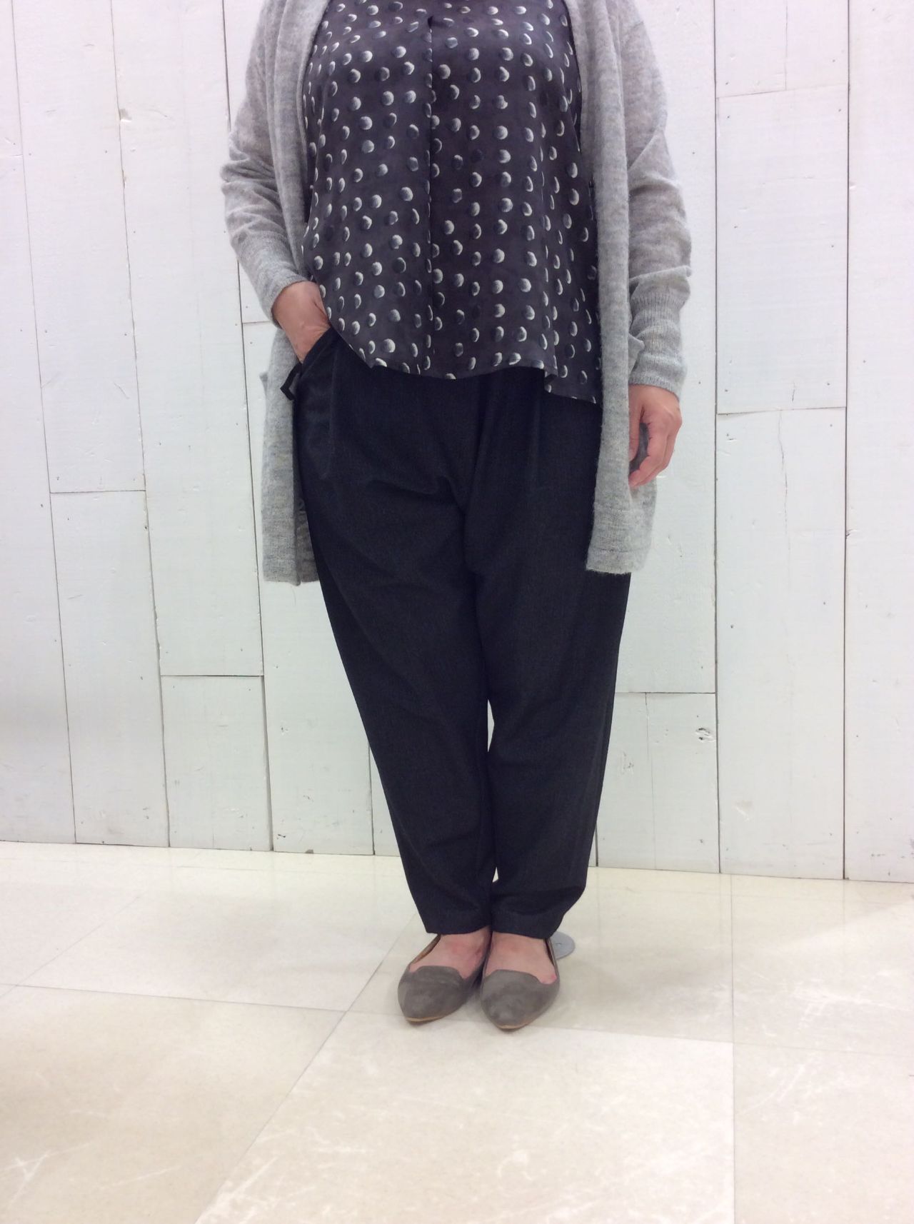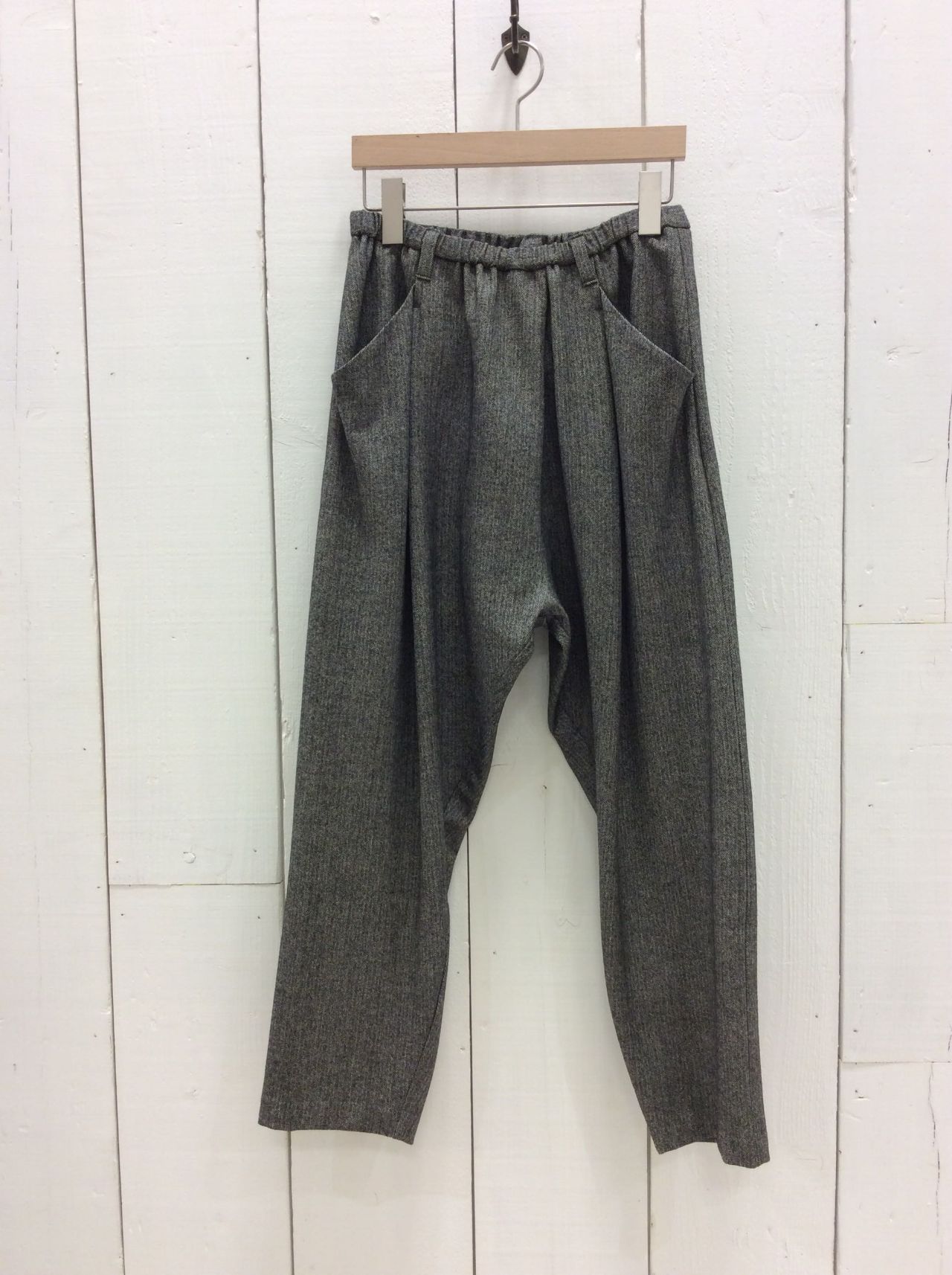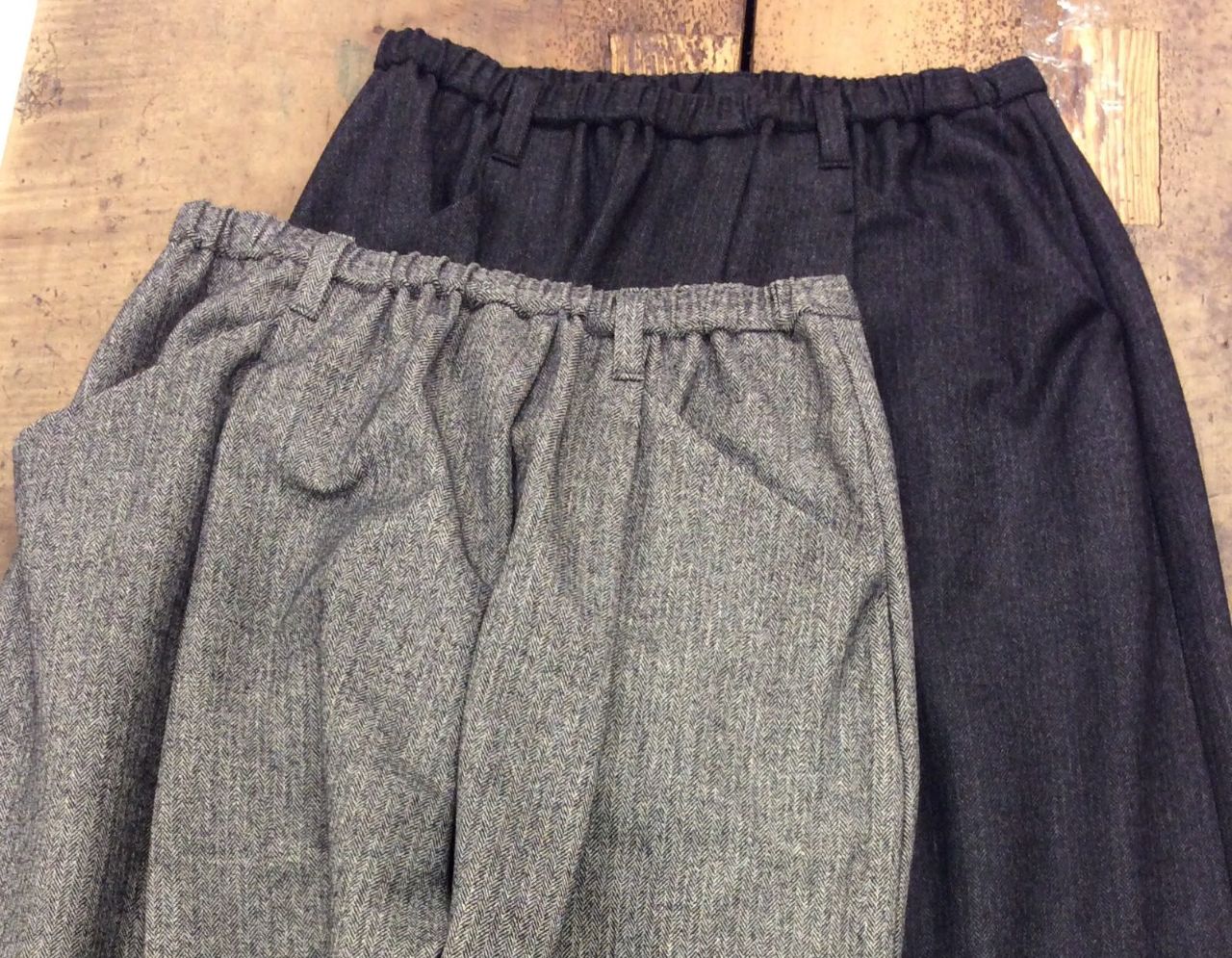 ヘリンボン柄のイージーパンツです。裾に向かって細くなっているので、スニーカーやショートブーツに合わせやすいです。