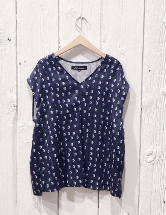 中のブラウスは光沢あるレーヨンサテンのプリントブラウスです。