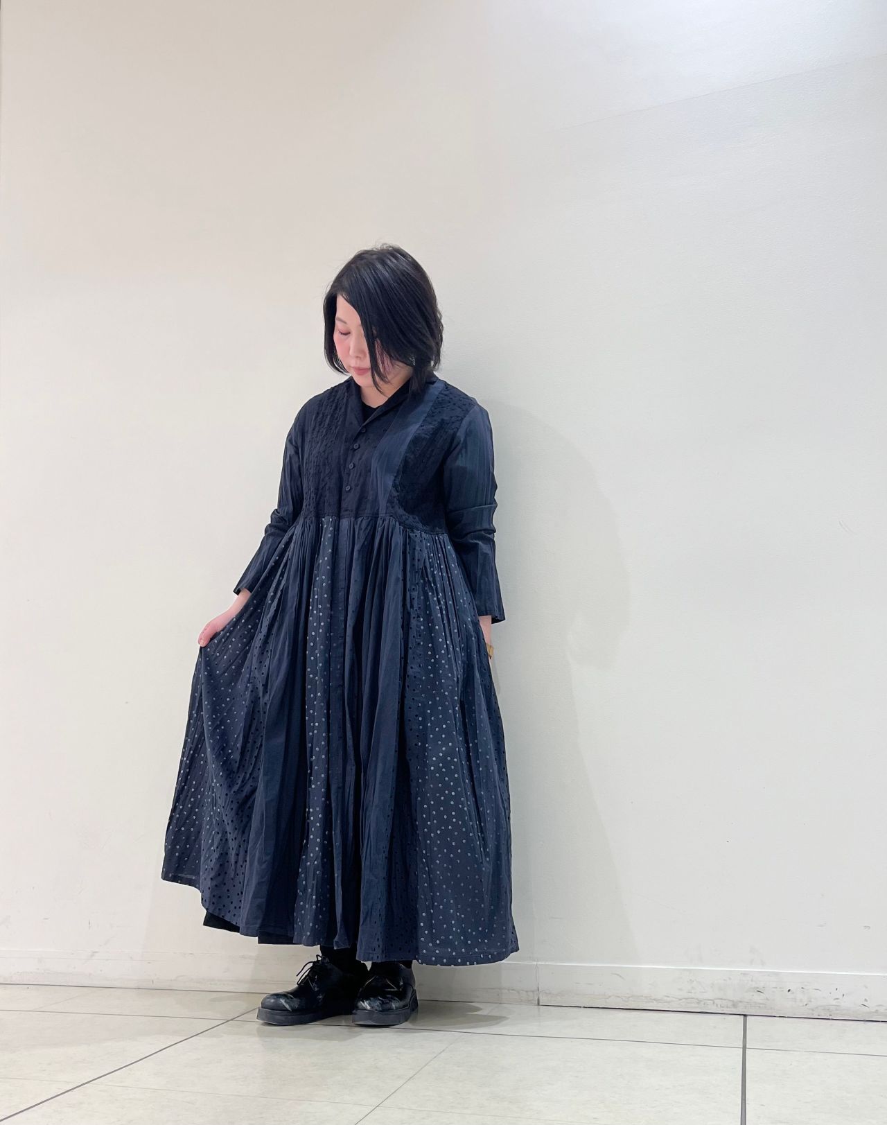 2素材のドットモチーフ刺繍生地、ドット柄フロッキープリント、インドコットンローン4素材のマテリアルミックス。