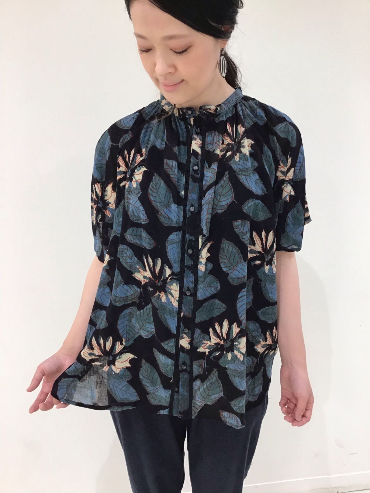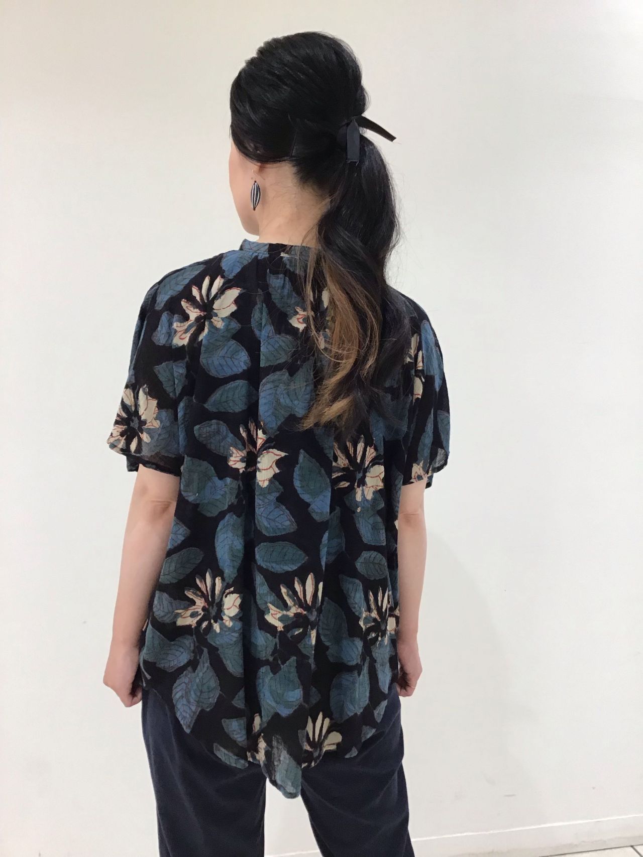 ダークカラーの中で咲く白い花が美しくパッと目に飛び込んでくるフラワープリントブラウス。