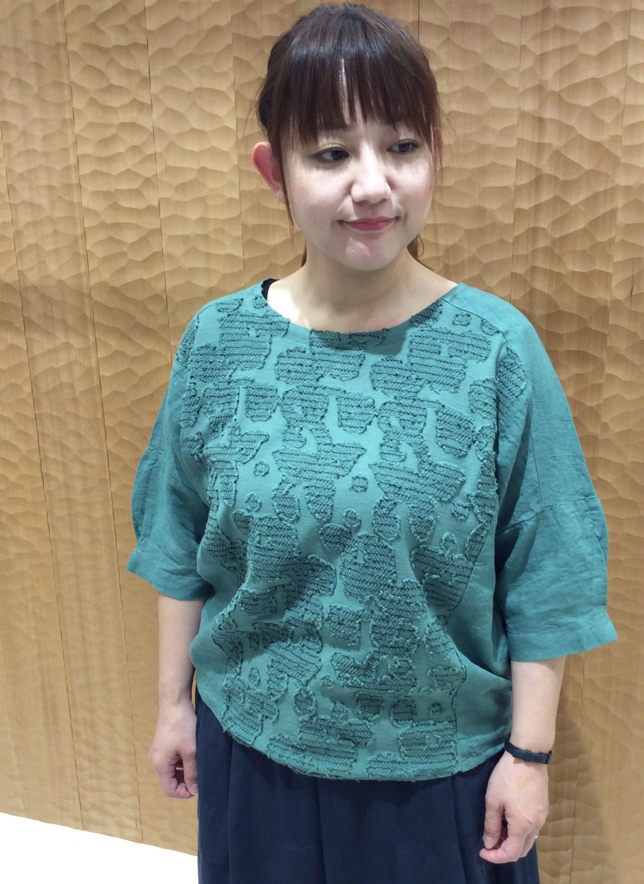 袖にタックが入っていてふんわりとしたシルエットが可愛いブラウスライクな一枚着です。