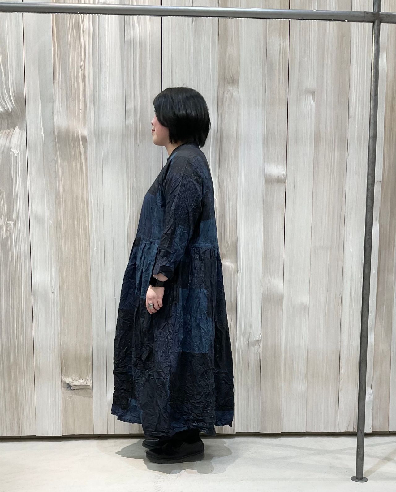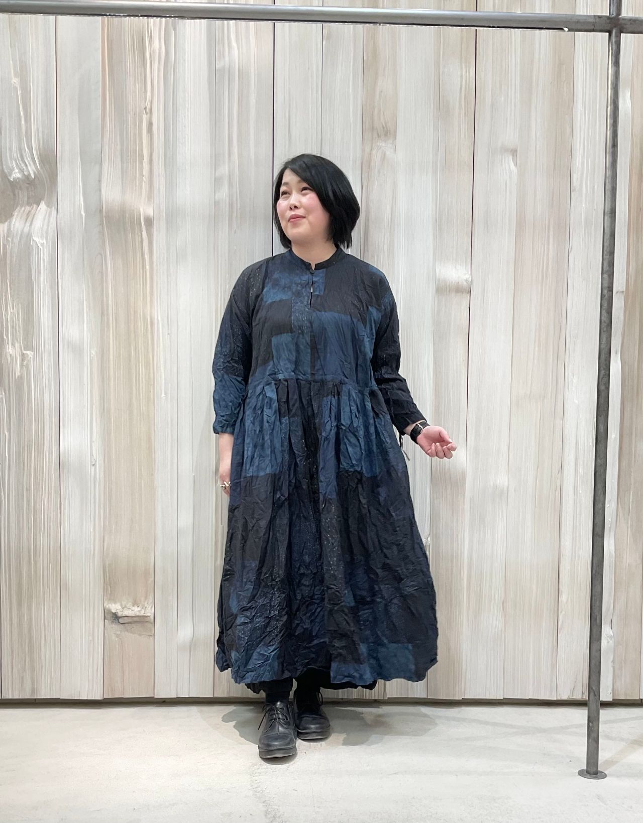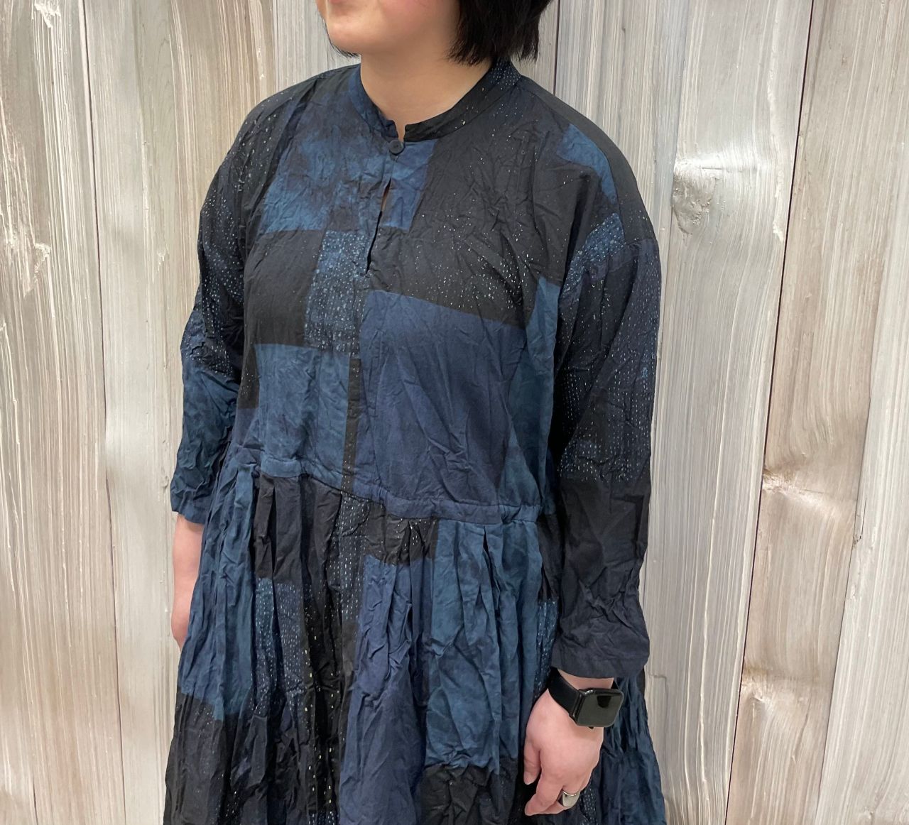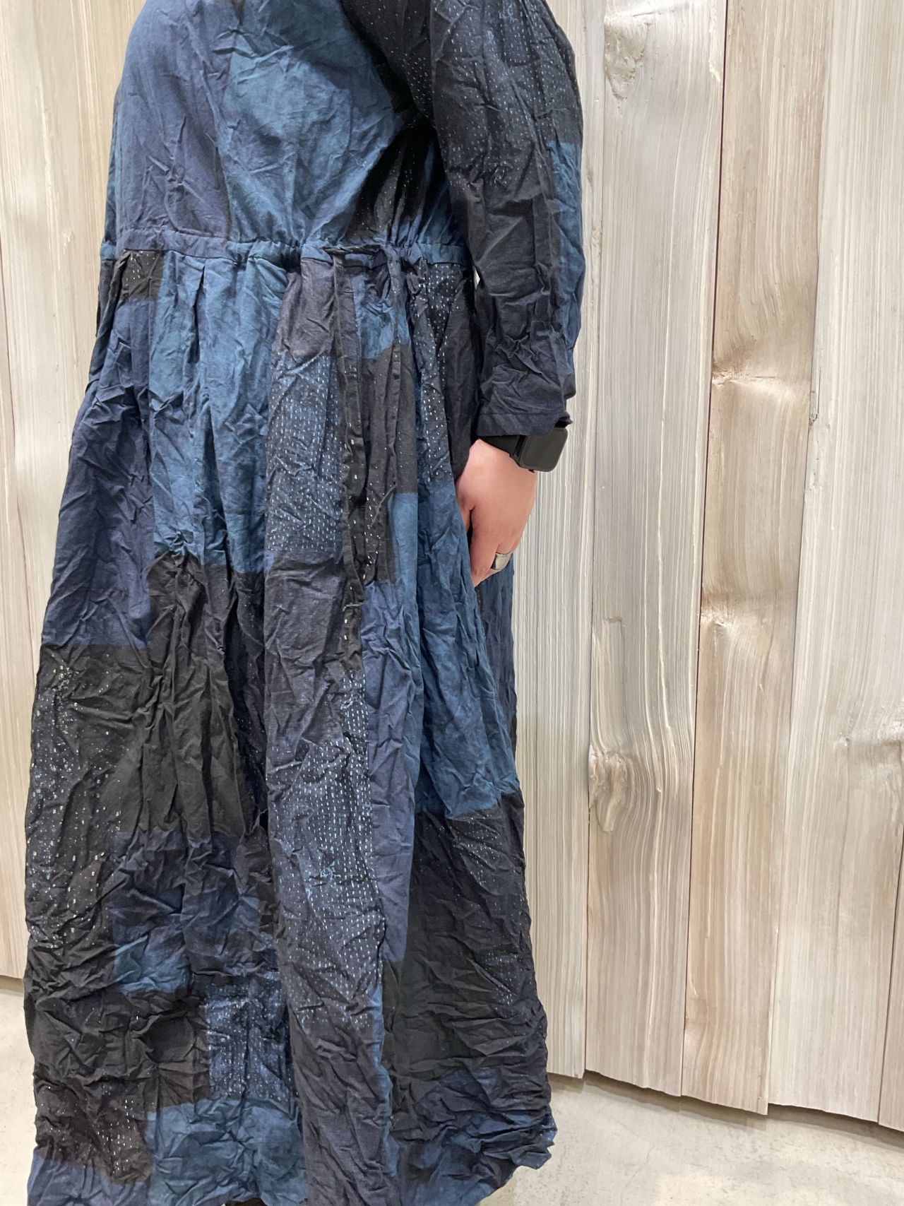 tsugihagiプリントボリュームワンピース。ウエストの切り替えにはテープを通して調節可能です。