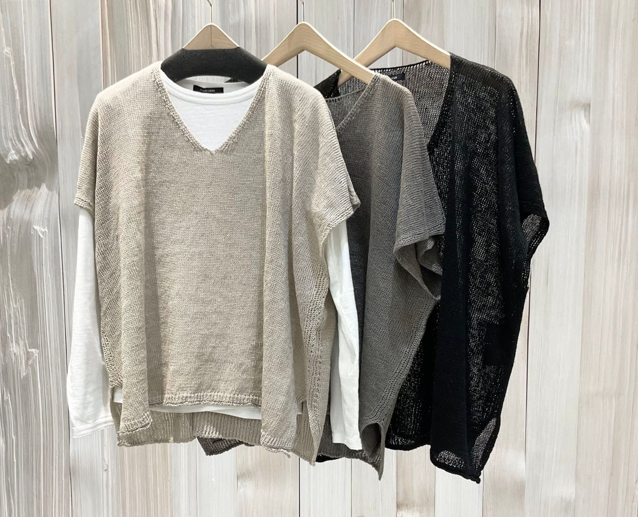 ベーシックなアイテムも、ノルマンディ・リネンでざっくり編むことで、ソフトで味のある1枚に。