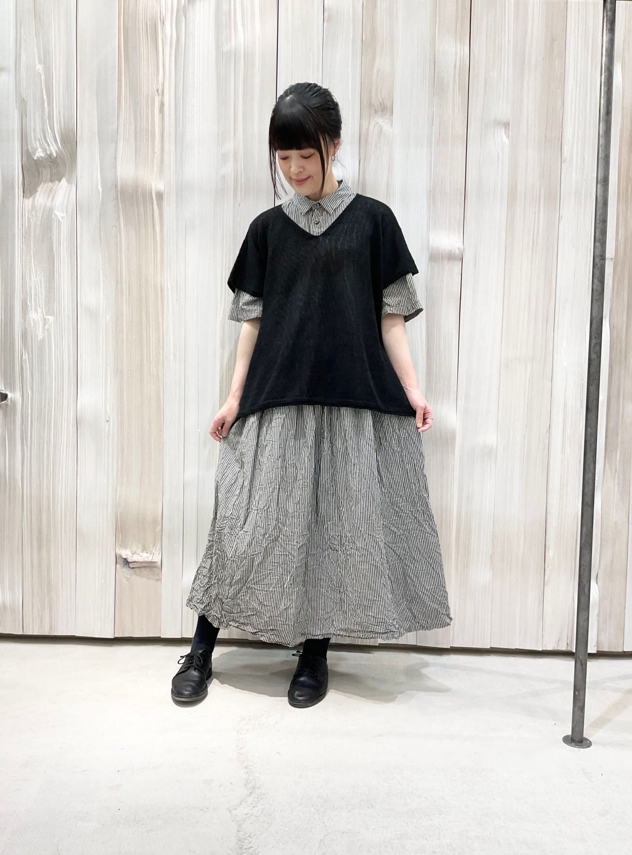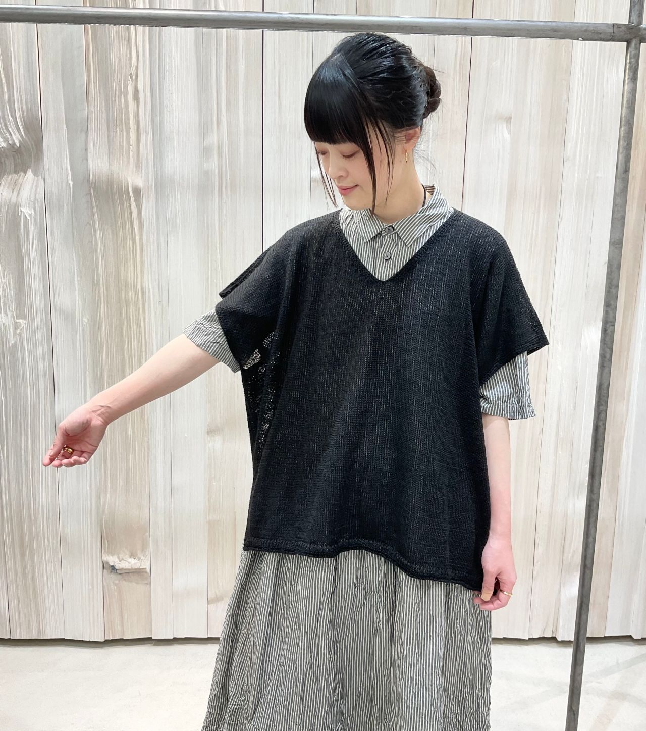 ゆったりしたシルエットとサイドスリットで、Tシャツやブラウスの上に重ねてポイントになります。