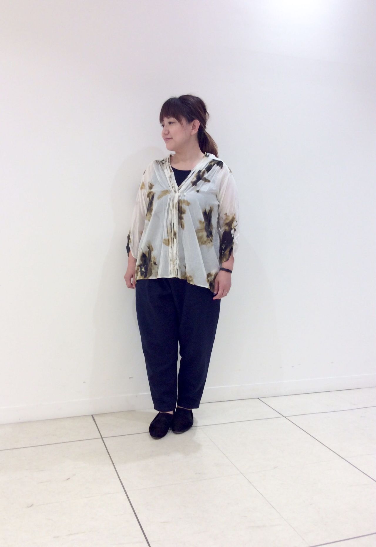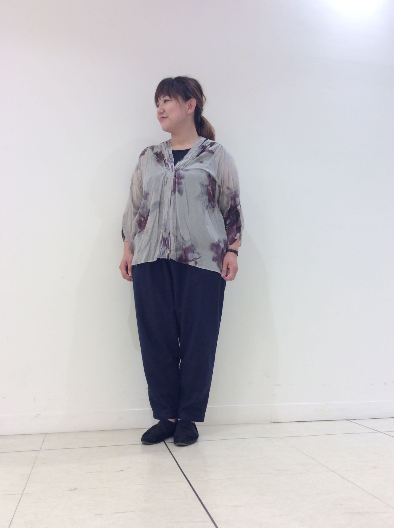 三者混ツイルパンツは、裾に向かって細くなるシルエットですがお尻周りはゆったりしていて履き心地◎。