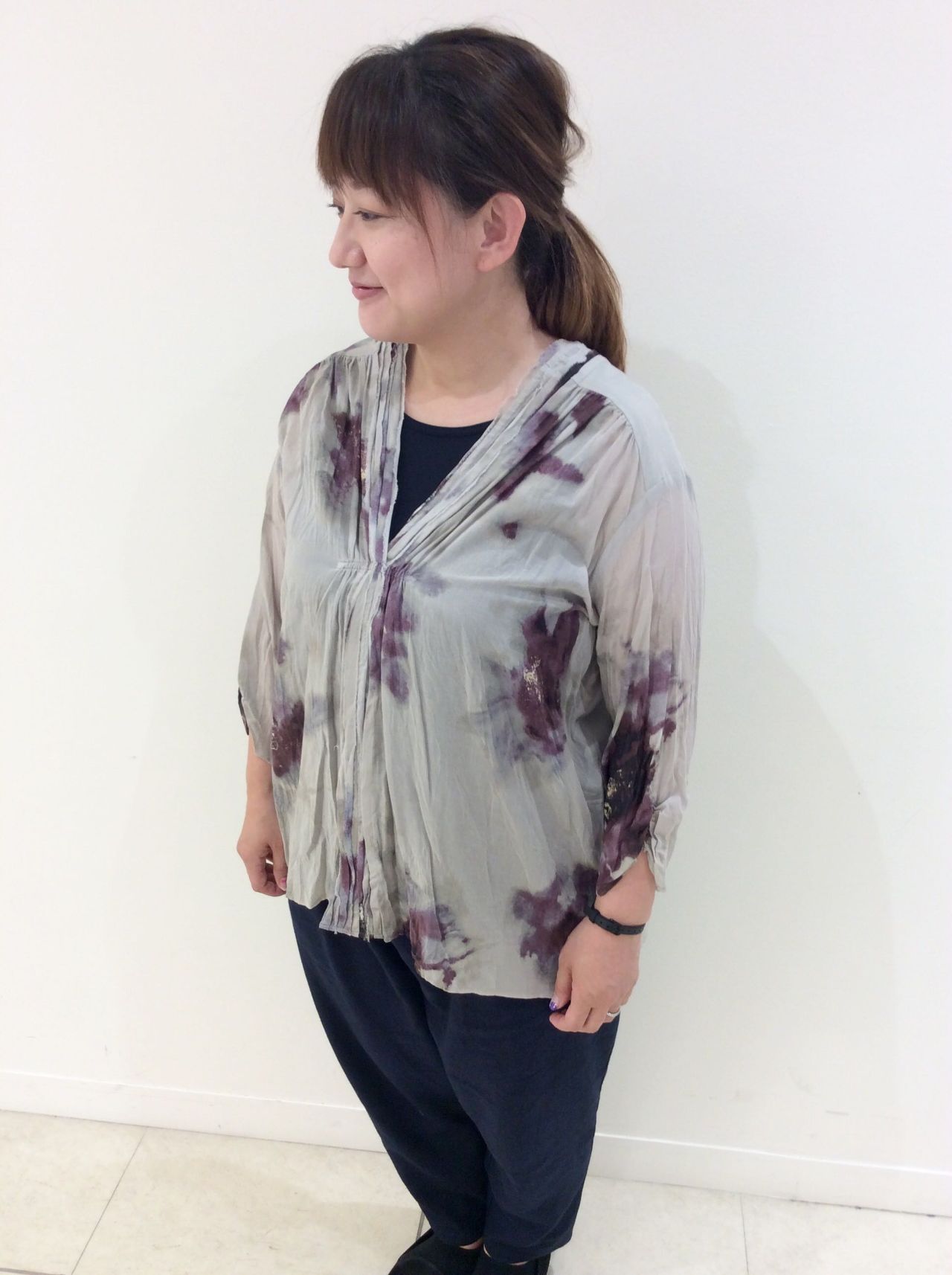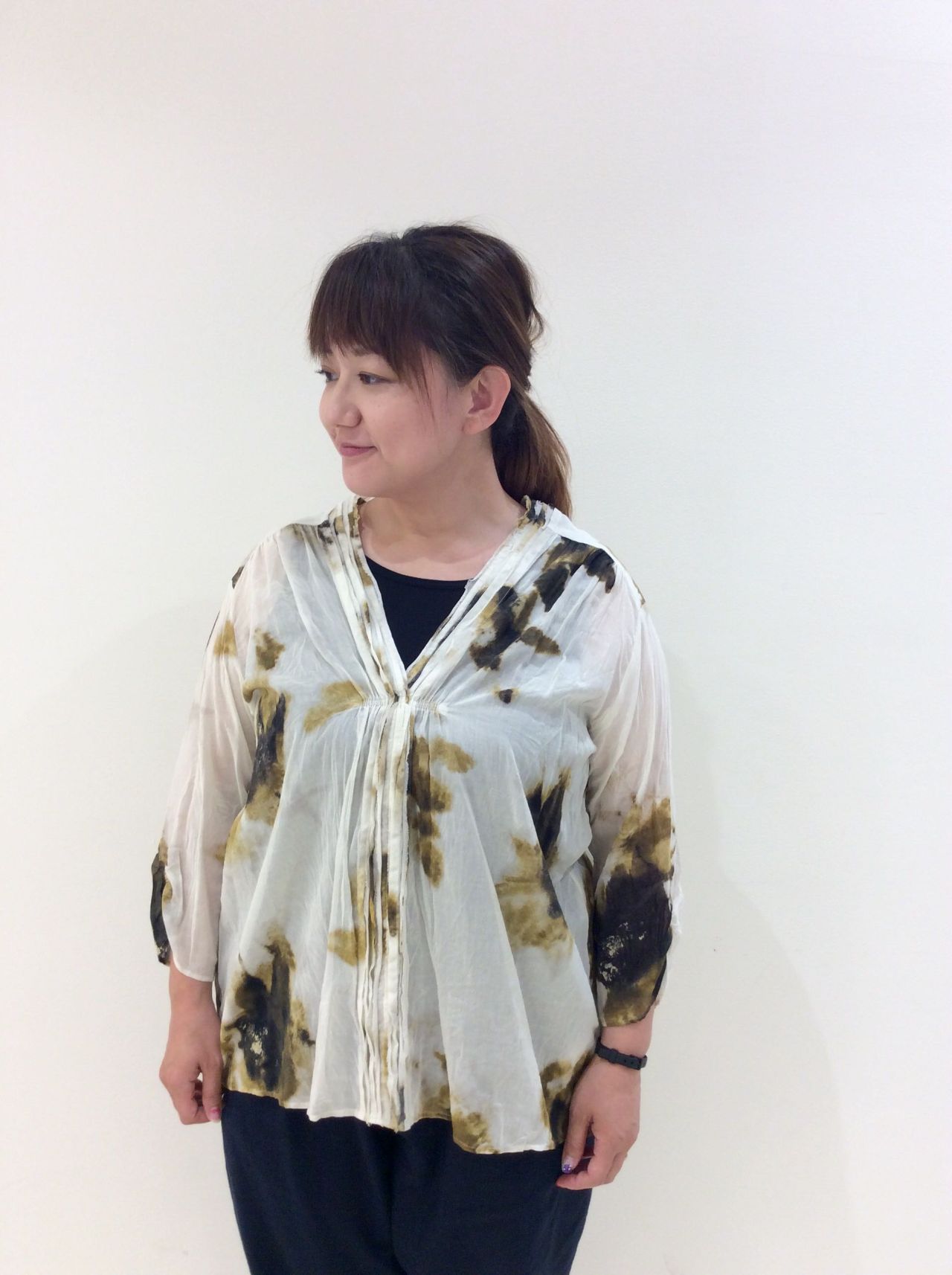 大胆なぼかしの花柄プリントが綺麗なVネックブラウスです。