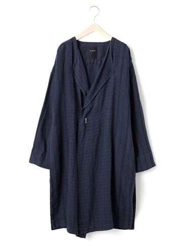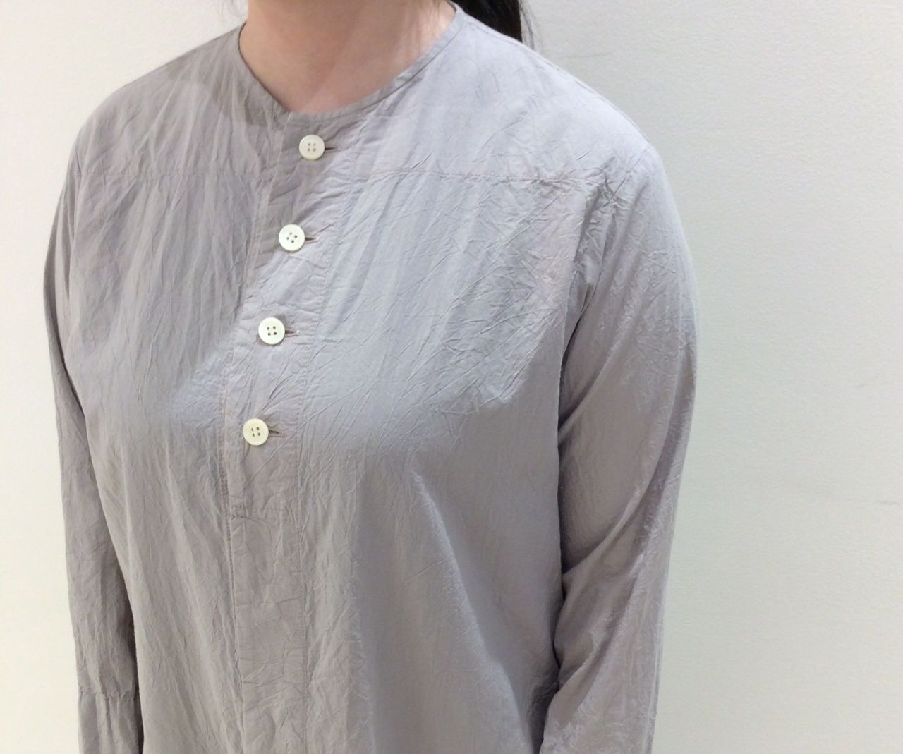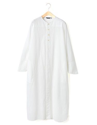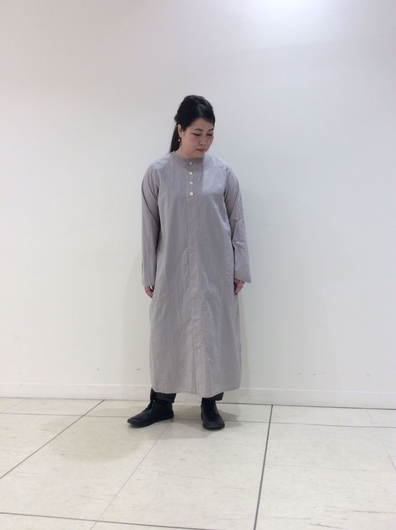 ノーカラーのロング丈ワンピースの両サイドにスリットを入れました。