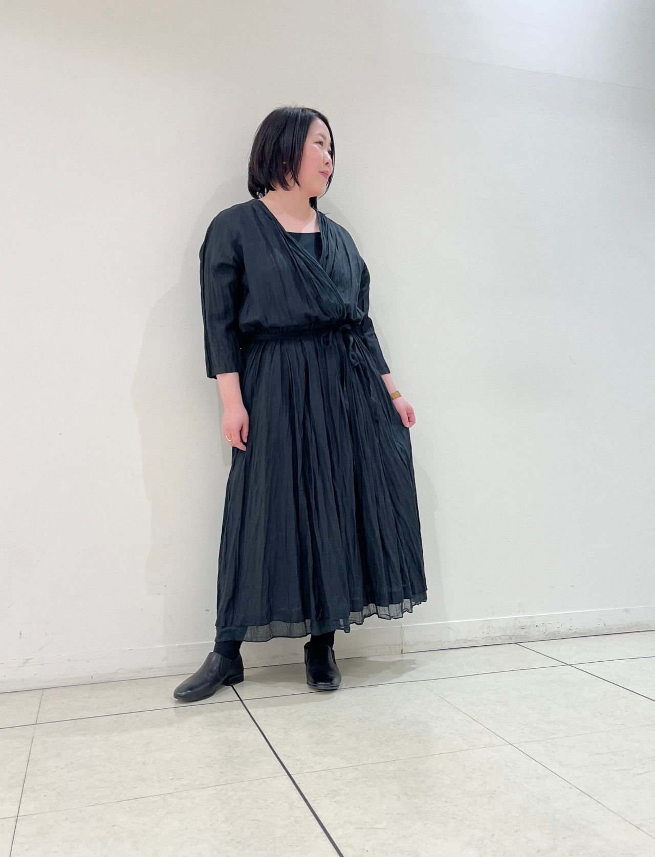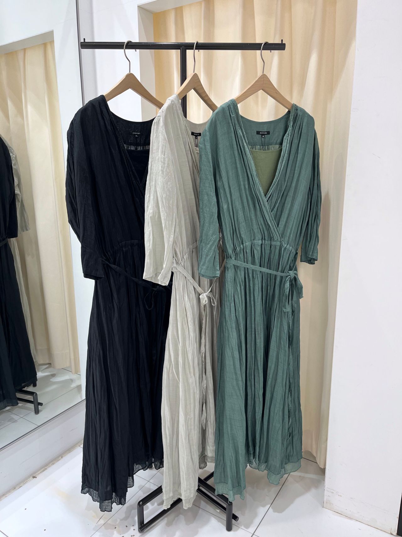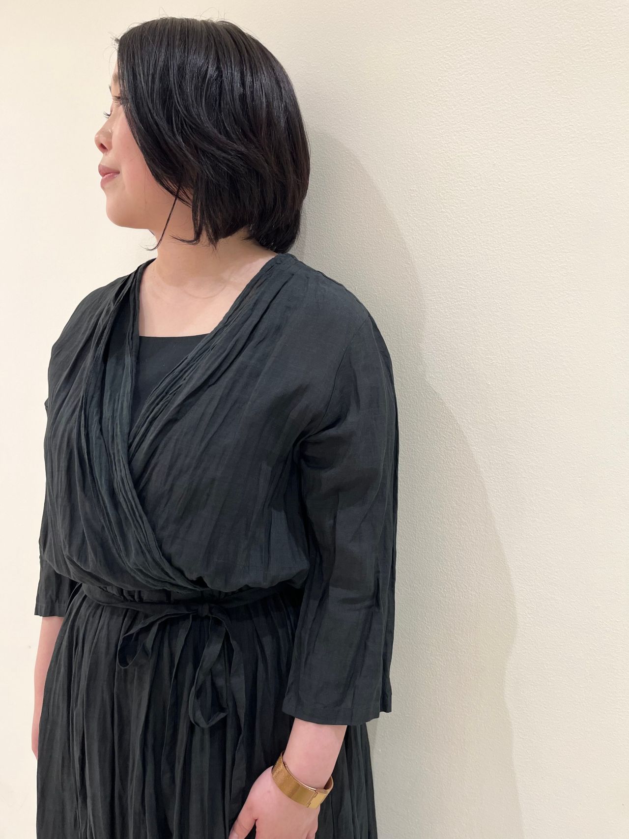 カシュクールドレス。前端と裾には別素材を使用し、レイヤー感を楽しめるディテール使い。