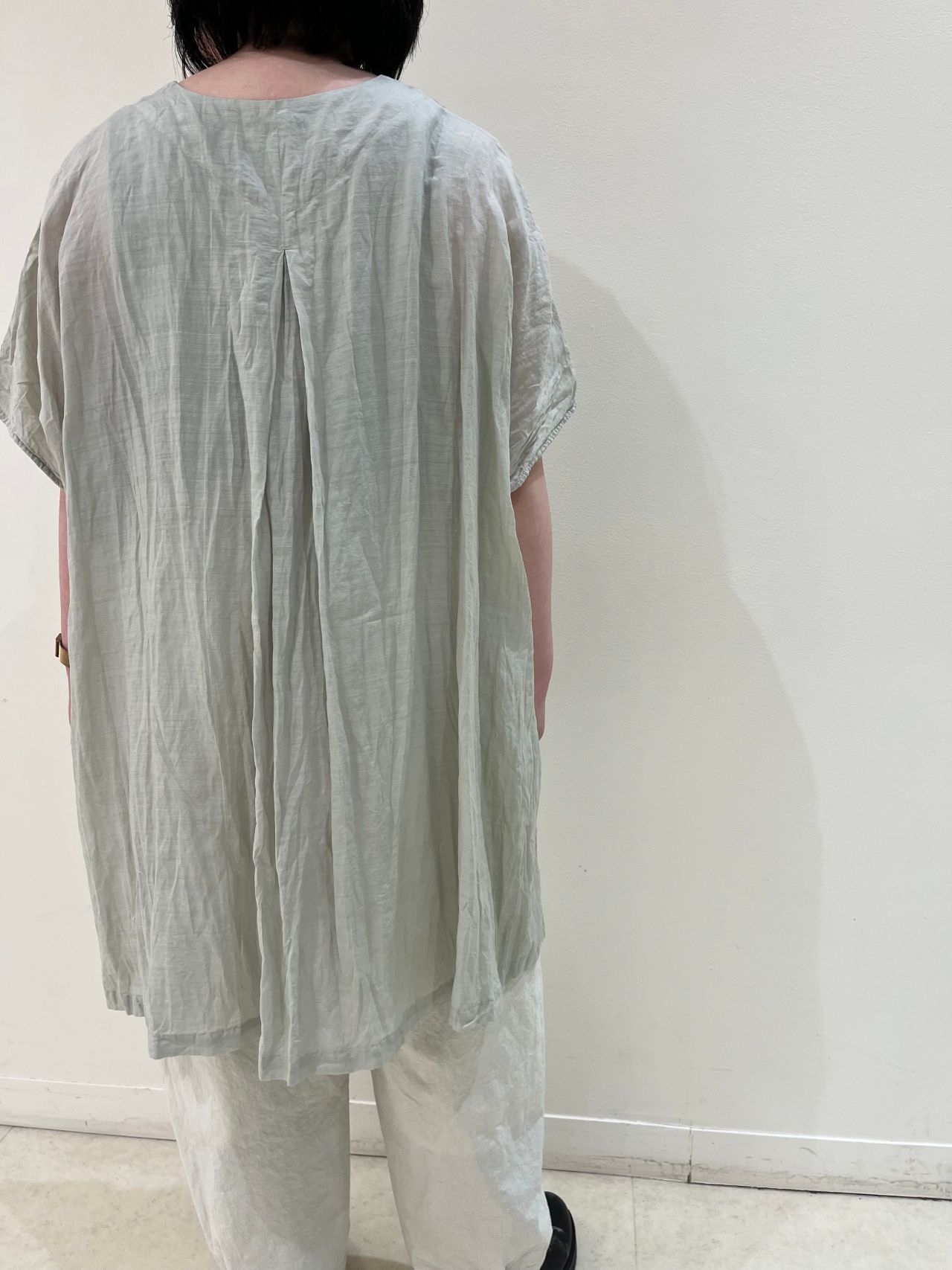 深めのインバーテッドタックが印象的なブラウス。