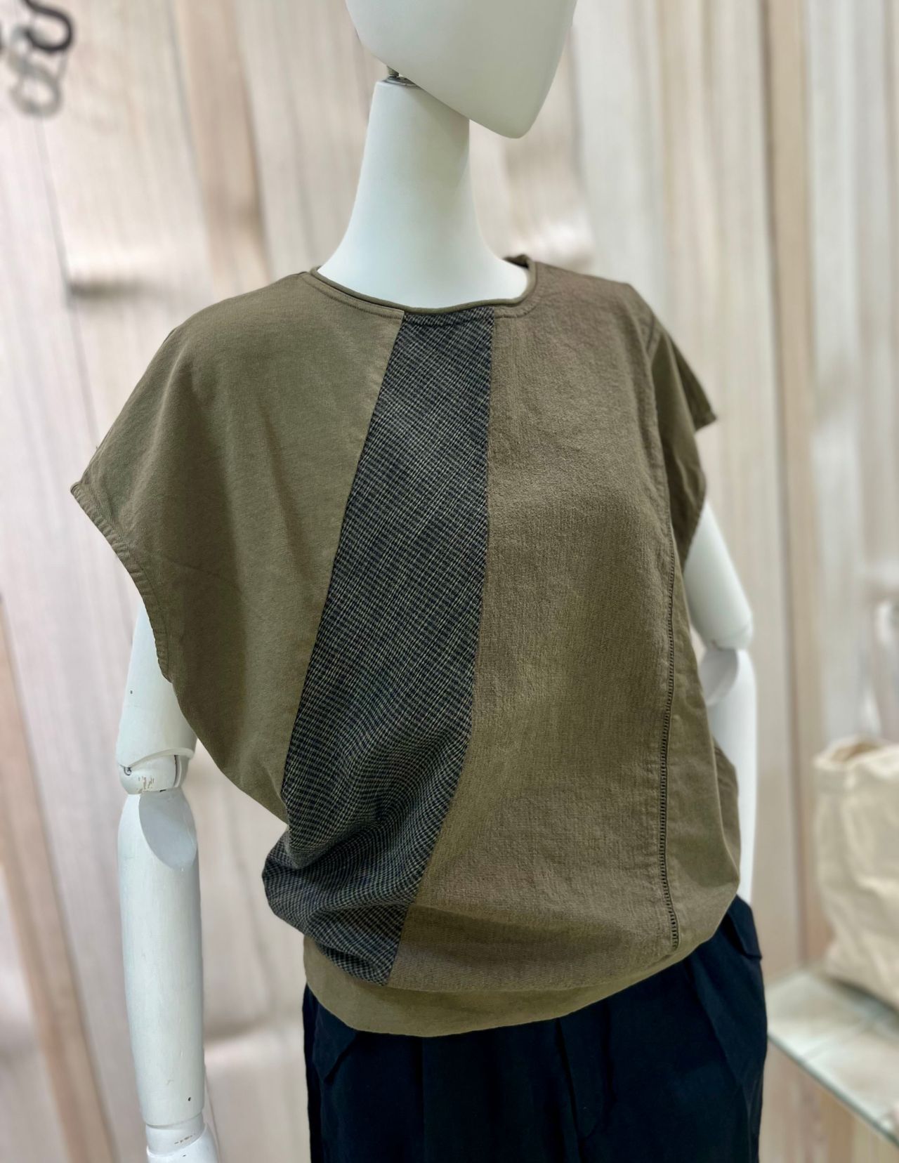 コットン天竺&和紙混先染めヨーリュー&綿先染めよろけのブルオーバー。長めのフレンチスリープで前身のパッチワークデザインが特徴です。
