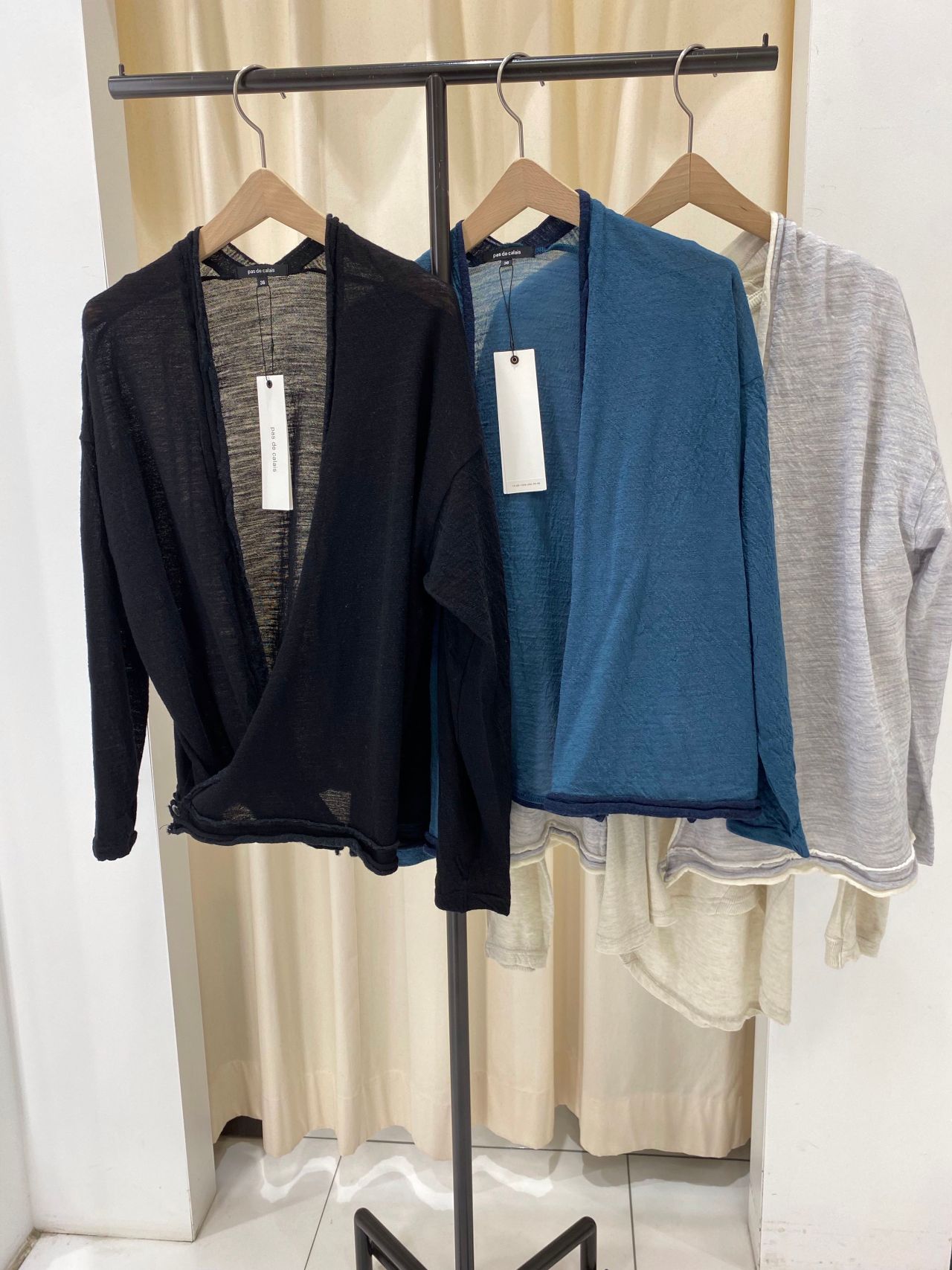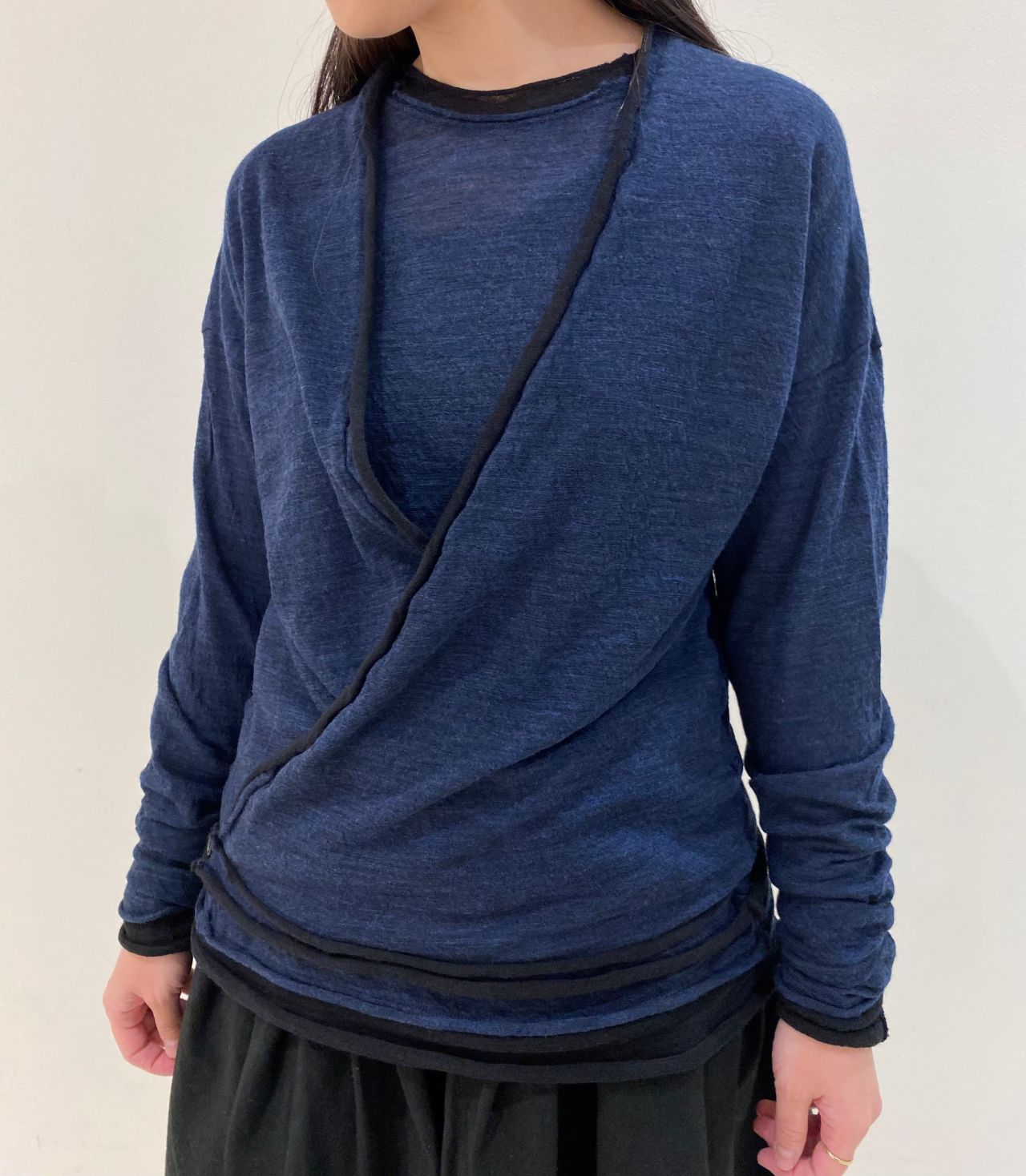 中にある釦を留めるとコンパクトなカシュクールに、前を開ければカーディガンとしてお使いいただける2WAYデザインです。その日の気分でコーディネートしてみて下さいませ。