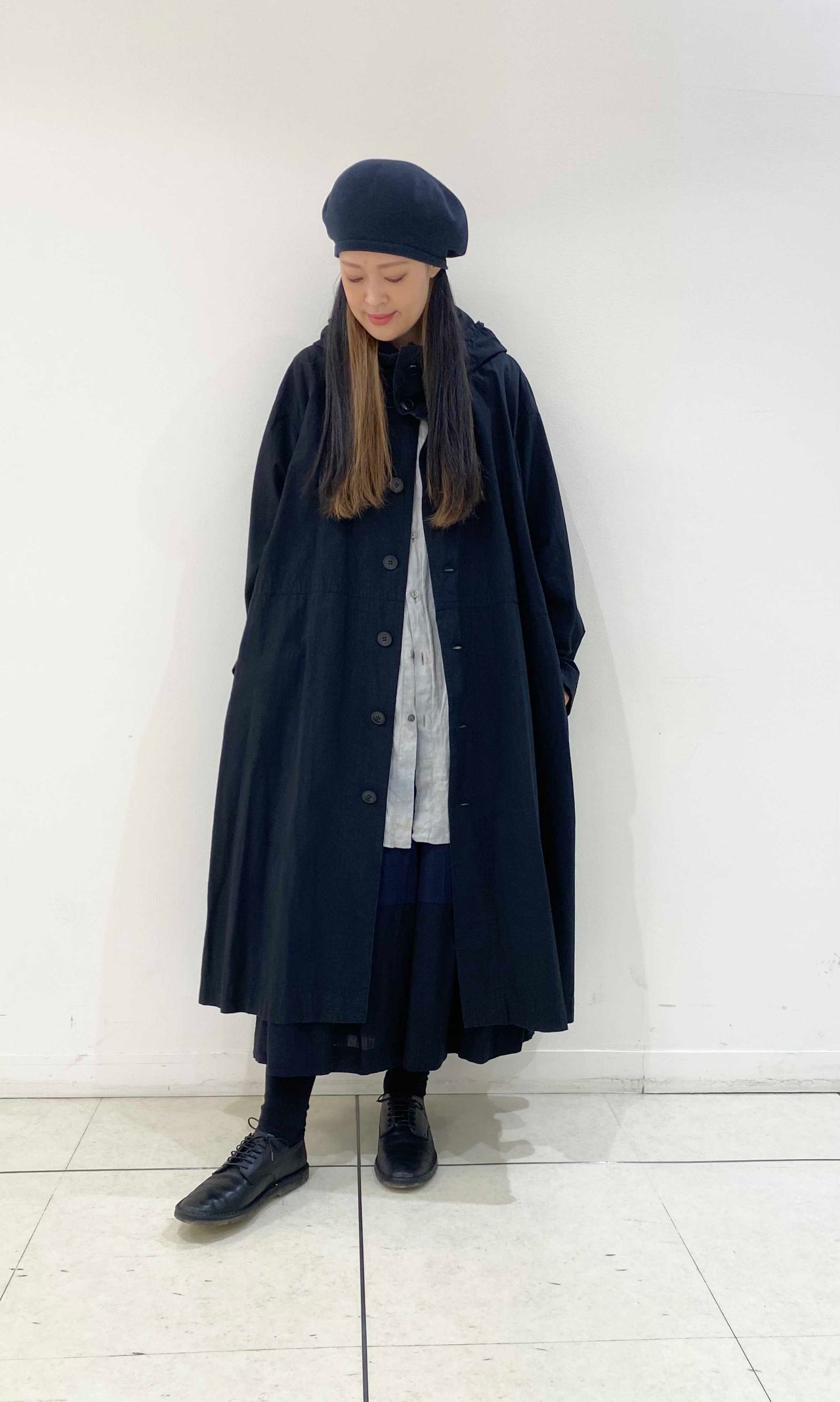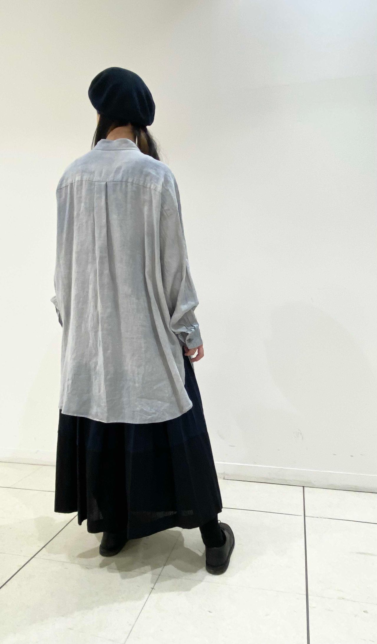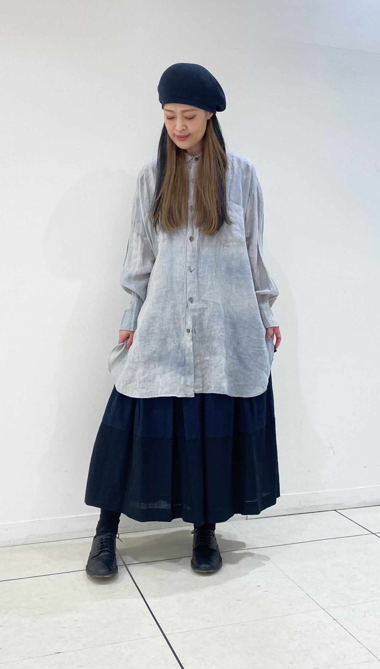 お尻が隠れるロング丈が、細身のパンツやワイドパンツなど、ボリュームあるボトムスにはウエストインした着こなしもおススメです。