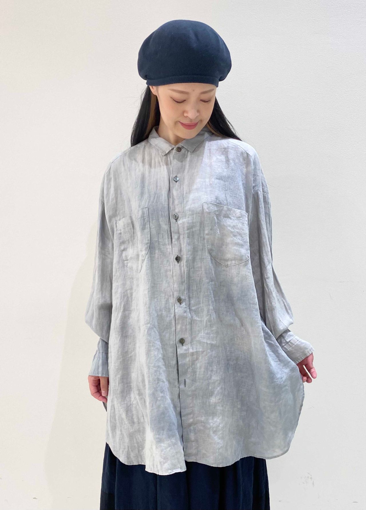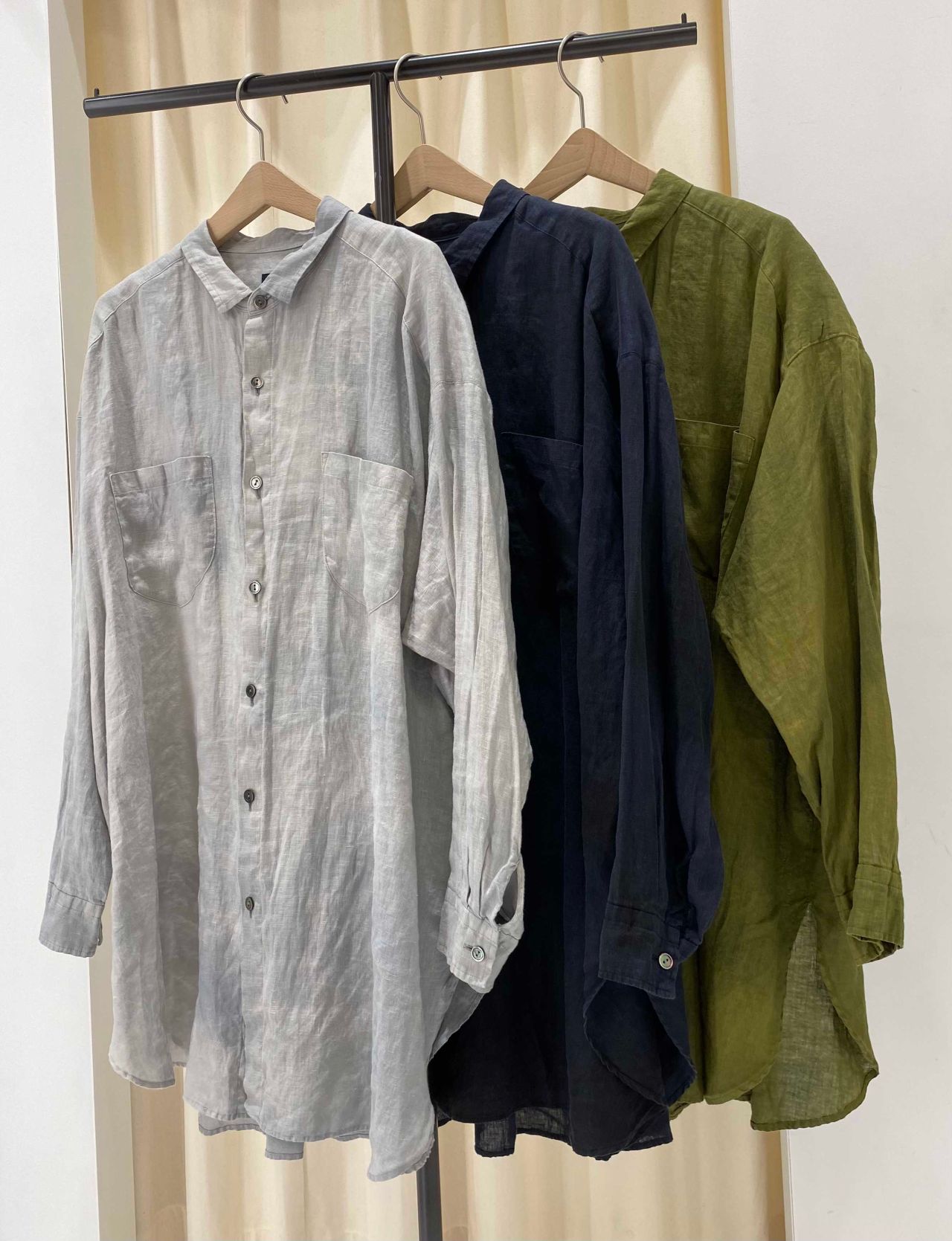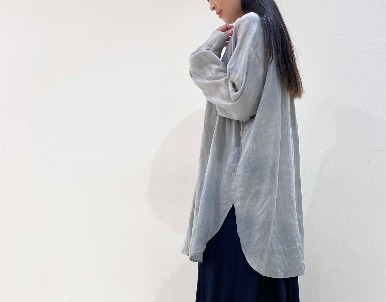 お尻が隠れるロング丈が、細身のパンツやワイドパンツなど、ボリュームあるボトムスにはウエストインした着こなしもおススメです。