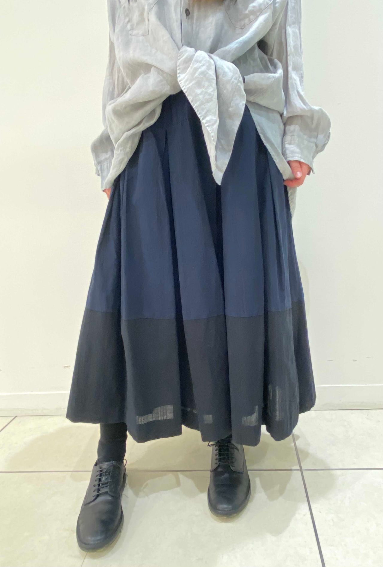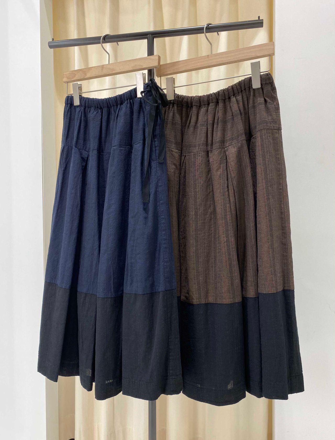 秋冬らしい色使いの、バイカラーのロングスカート。