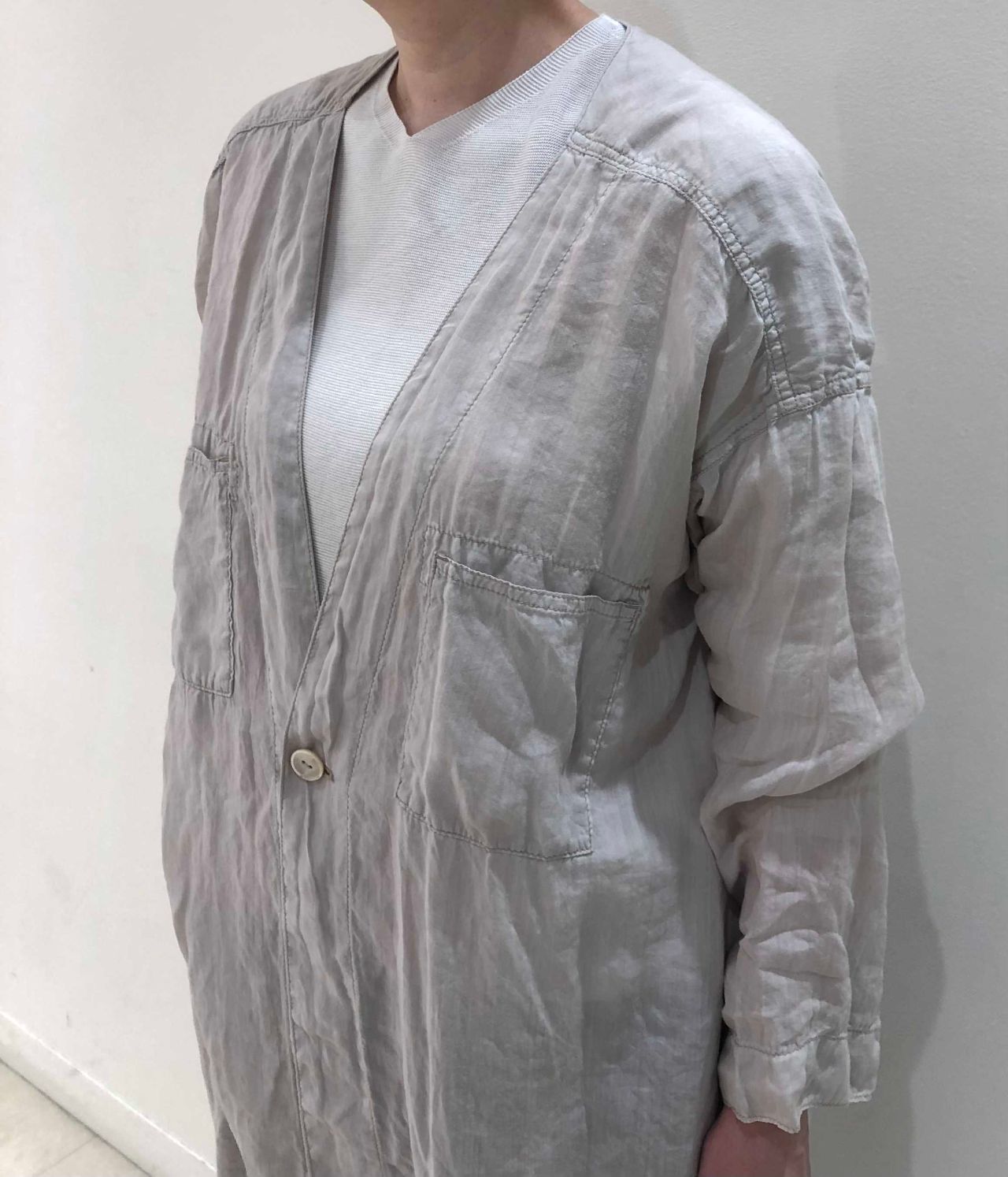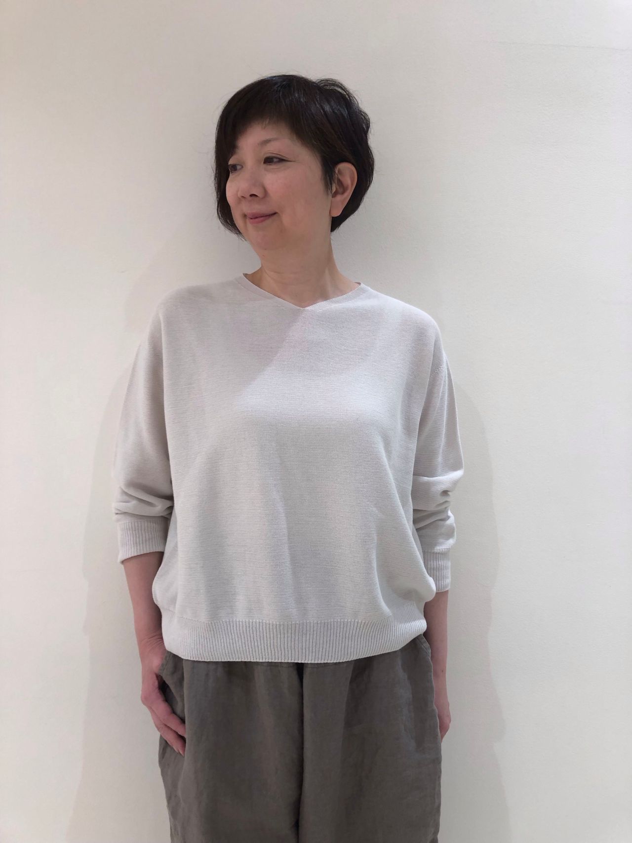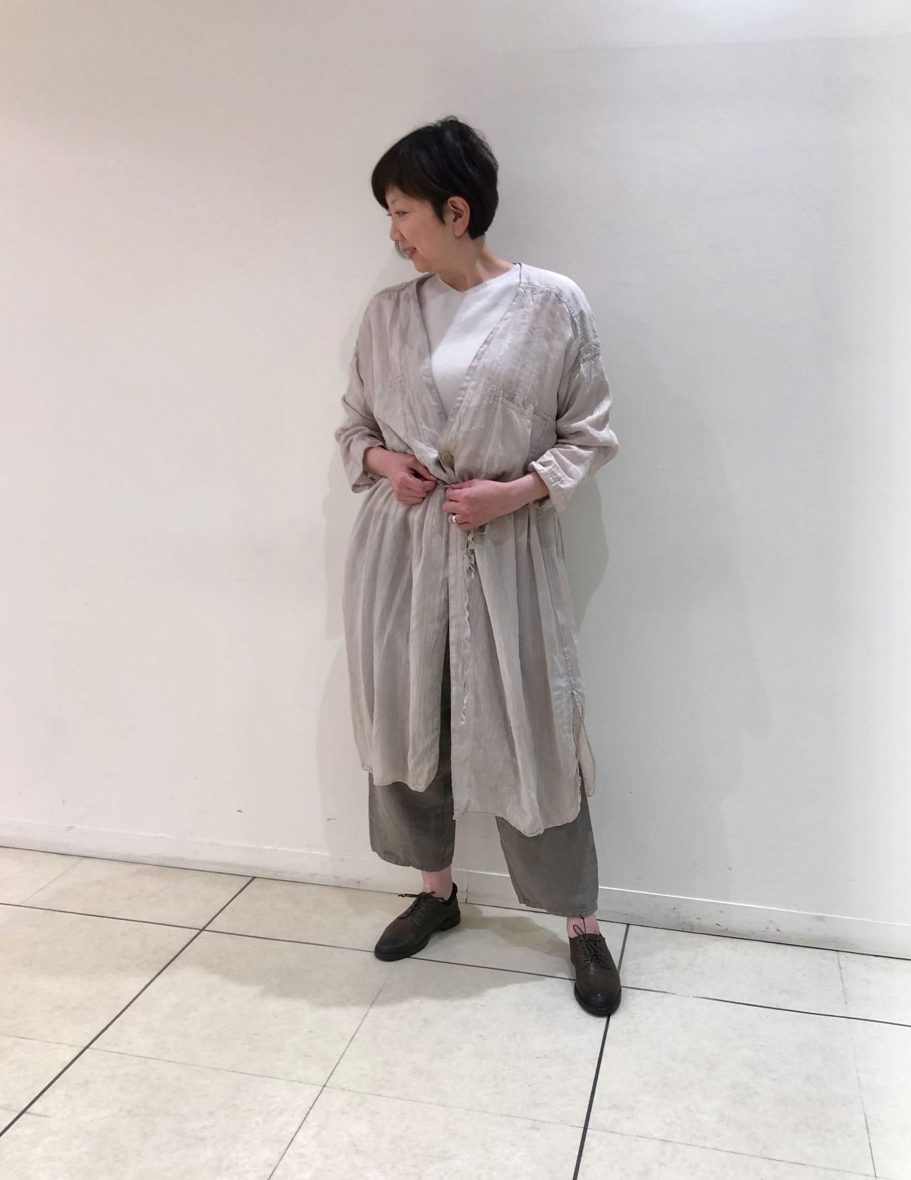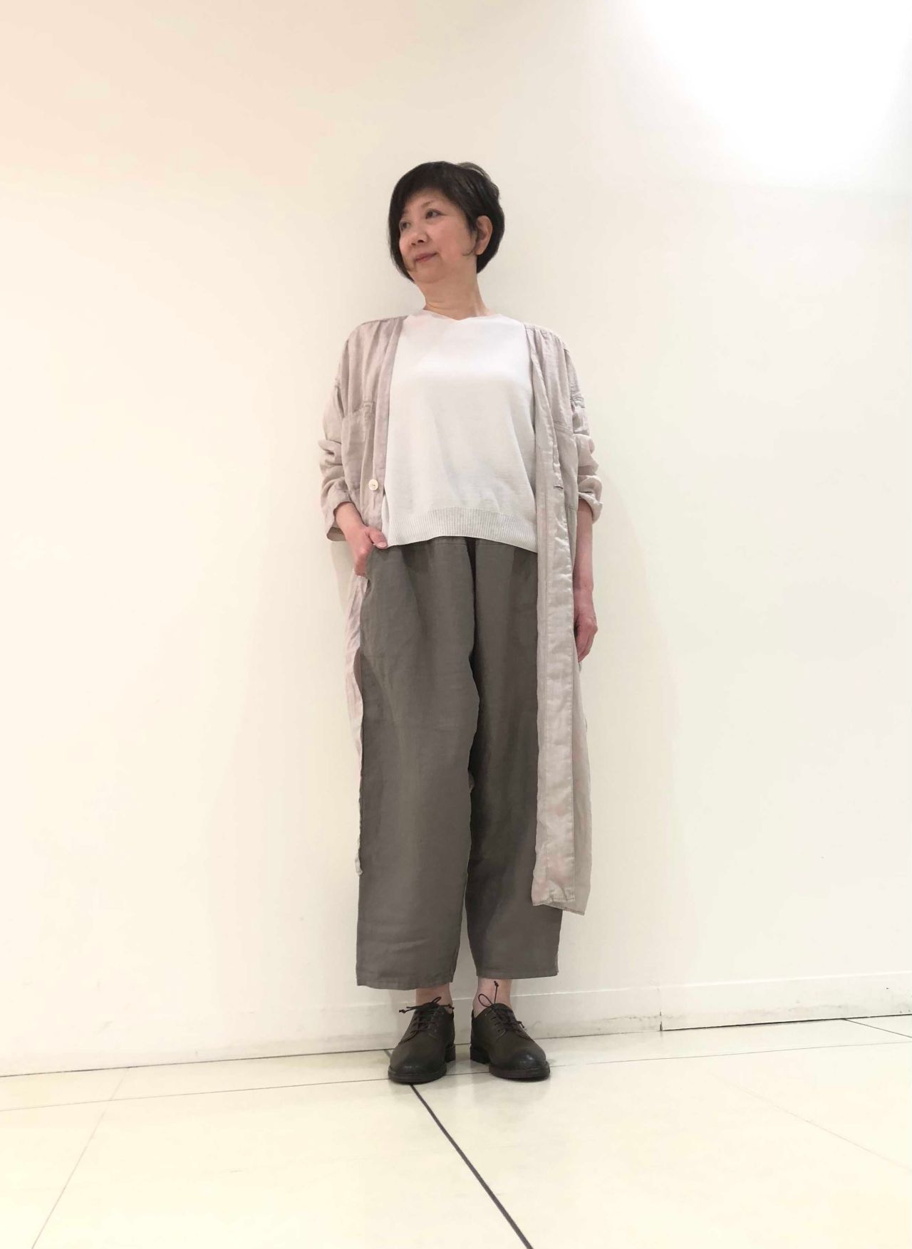 軽いコートとご自分で洗えるニットのコーディネートです。