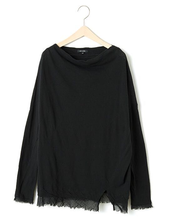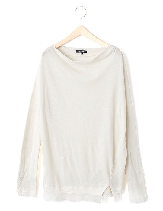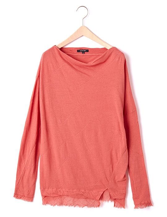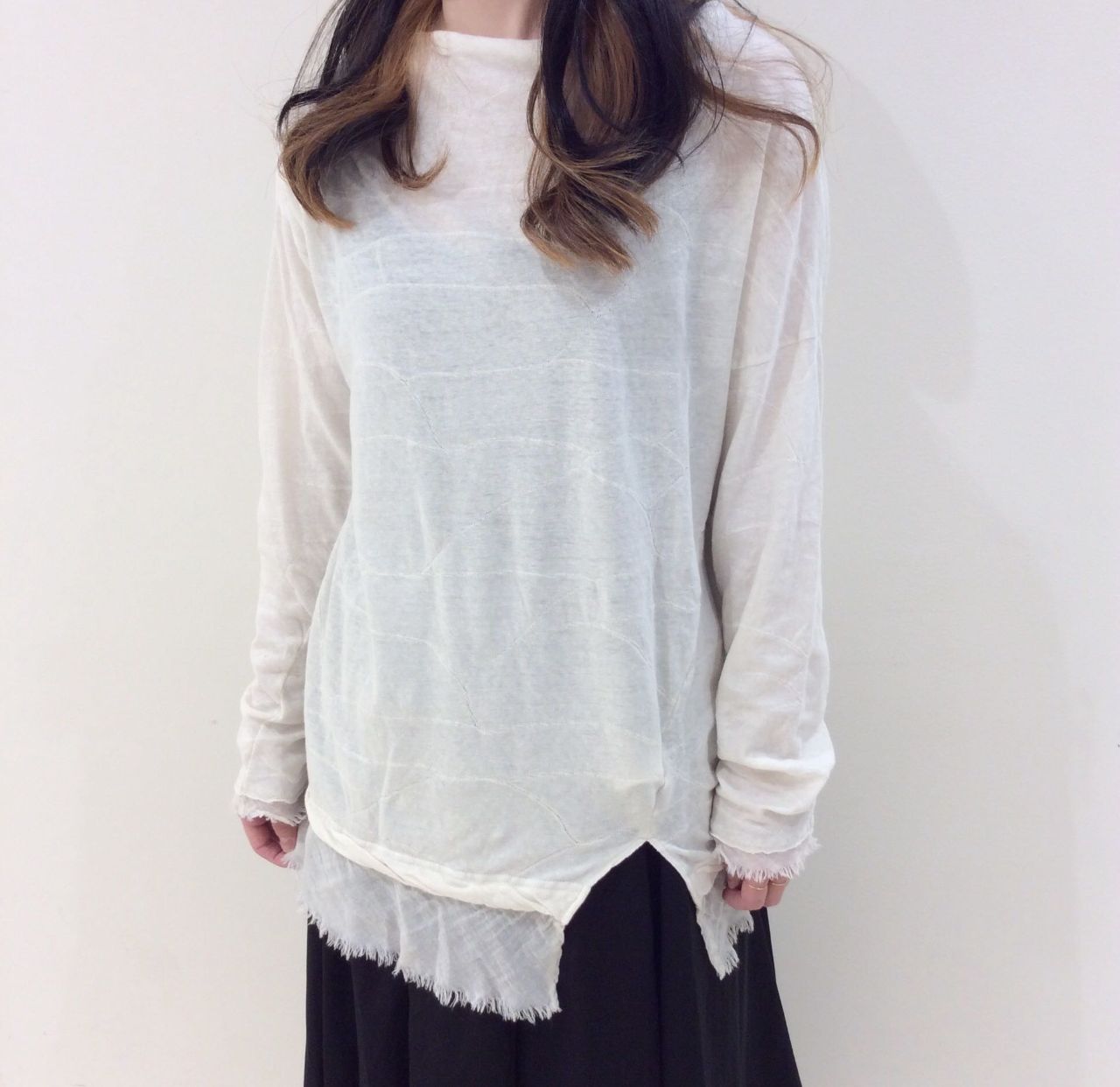 クシャッとしたゆるい衿ぐりラインに、袖口と裾に布帛を断ち切りで付けました。