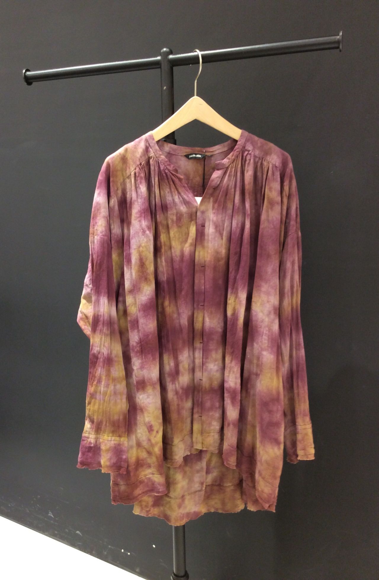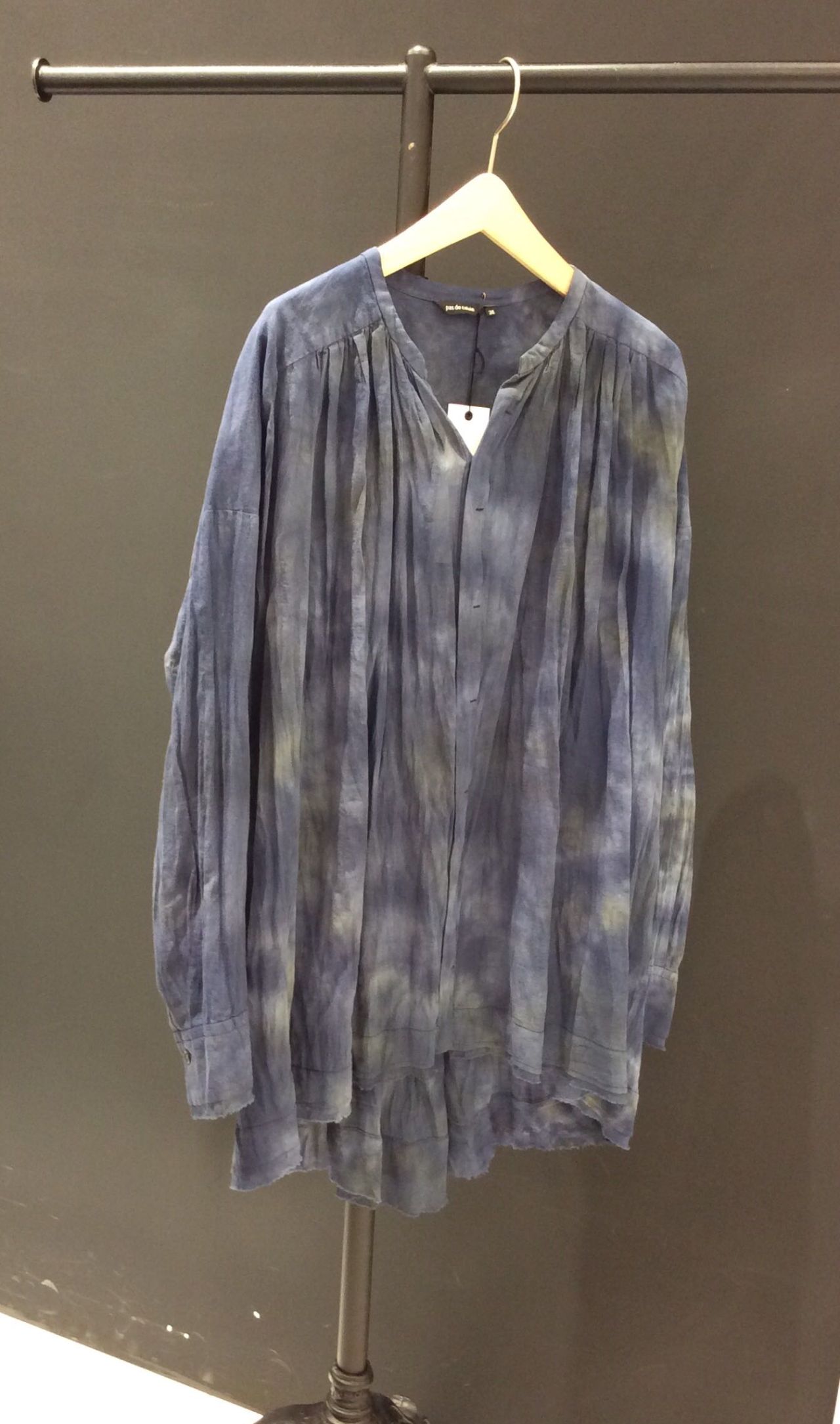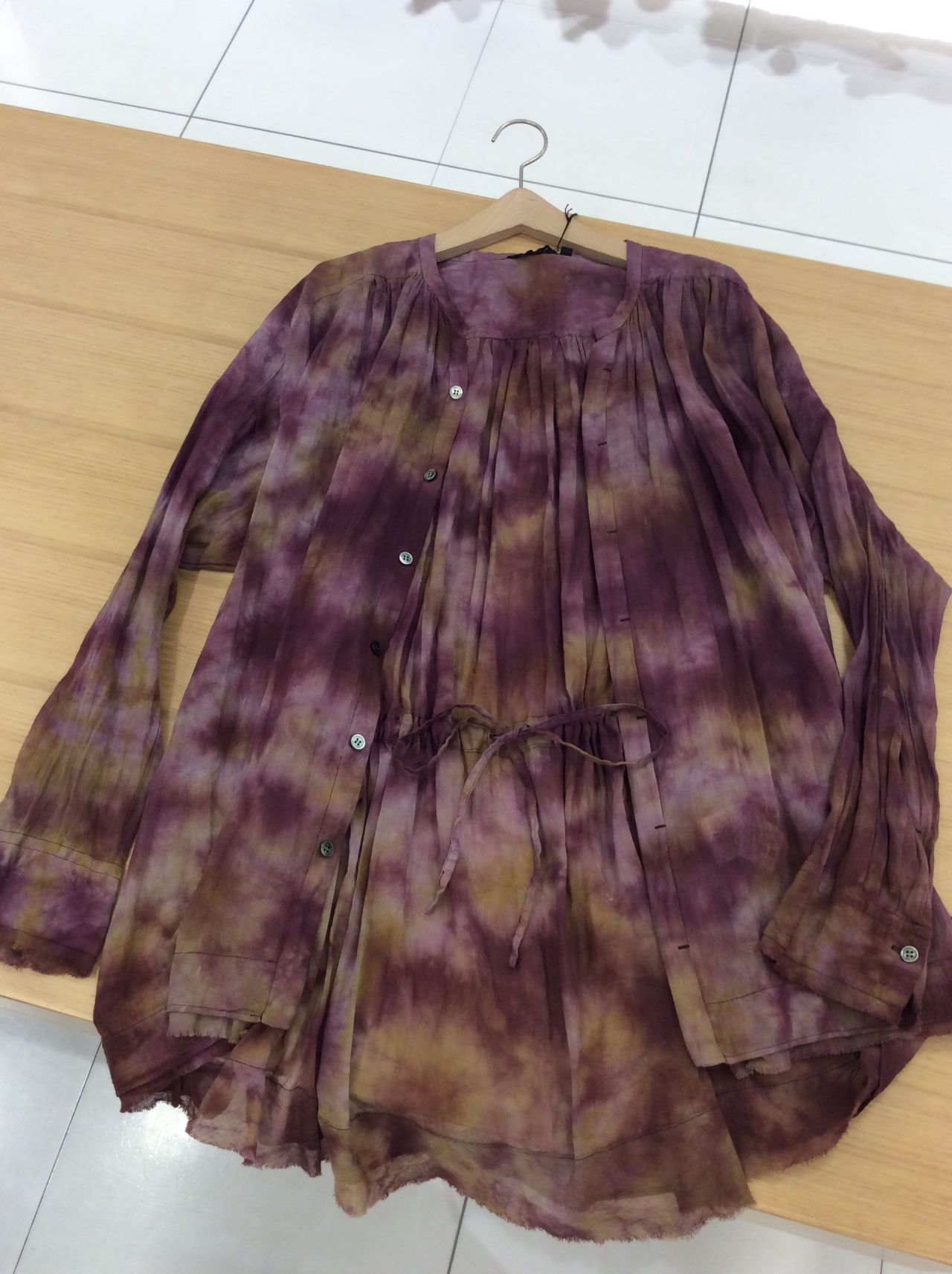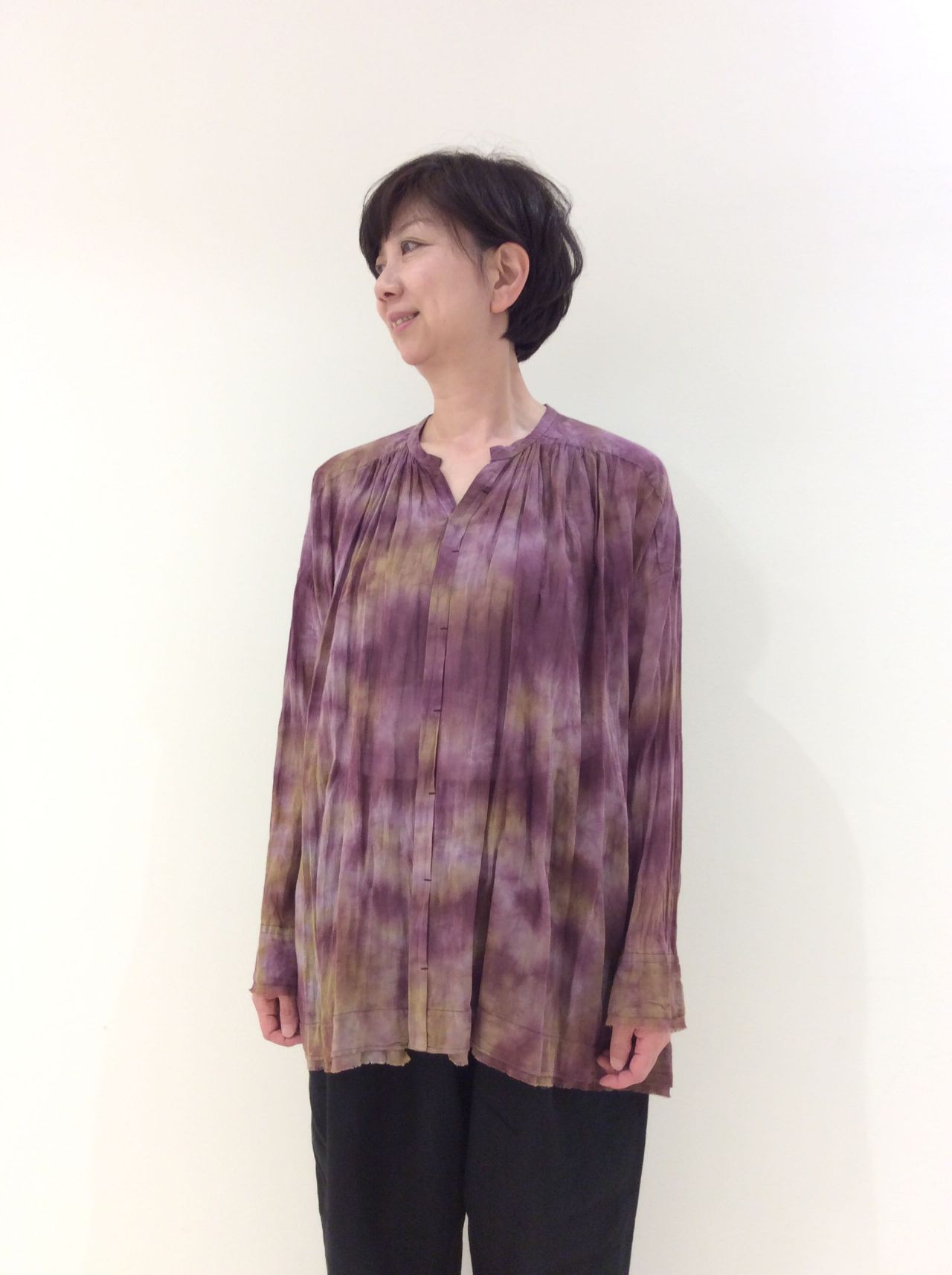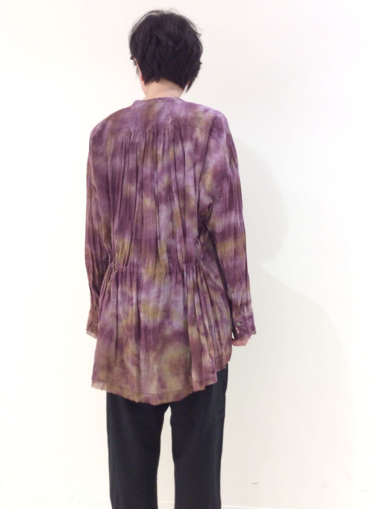 籠染めを施した比翼開きのブラウスです。