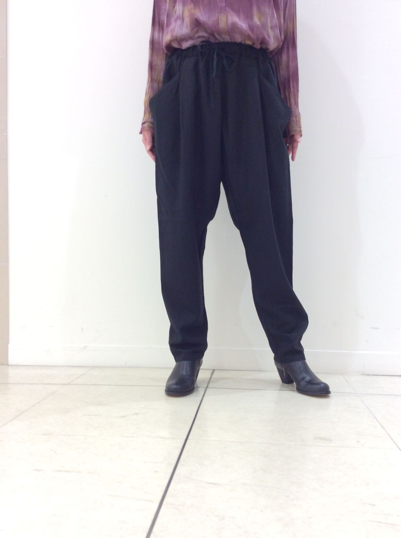 ウエストヒモのイージーパンツで落ち感があります。