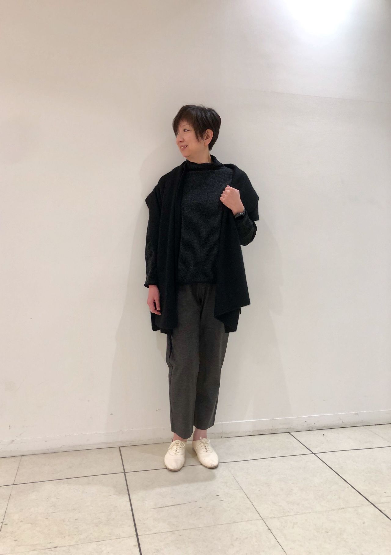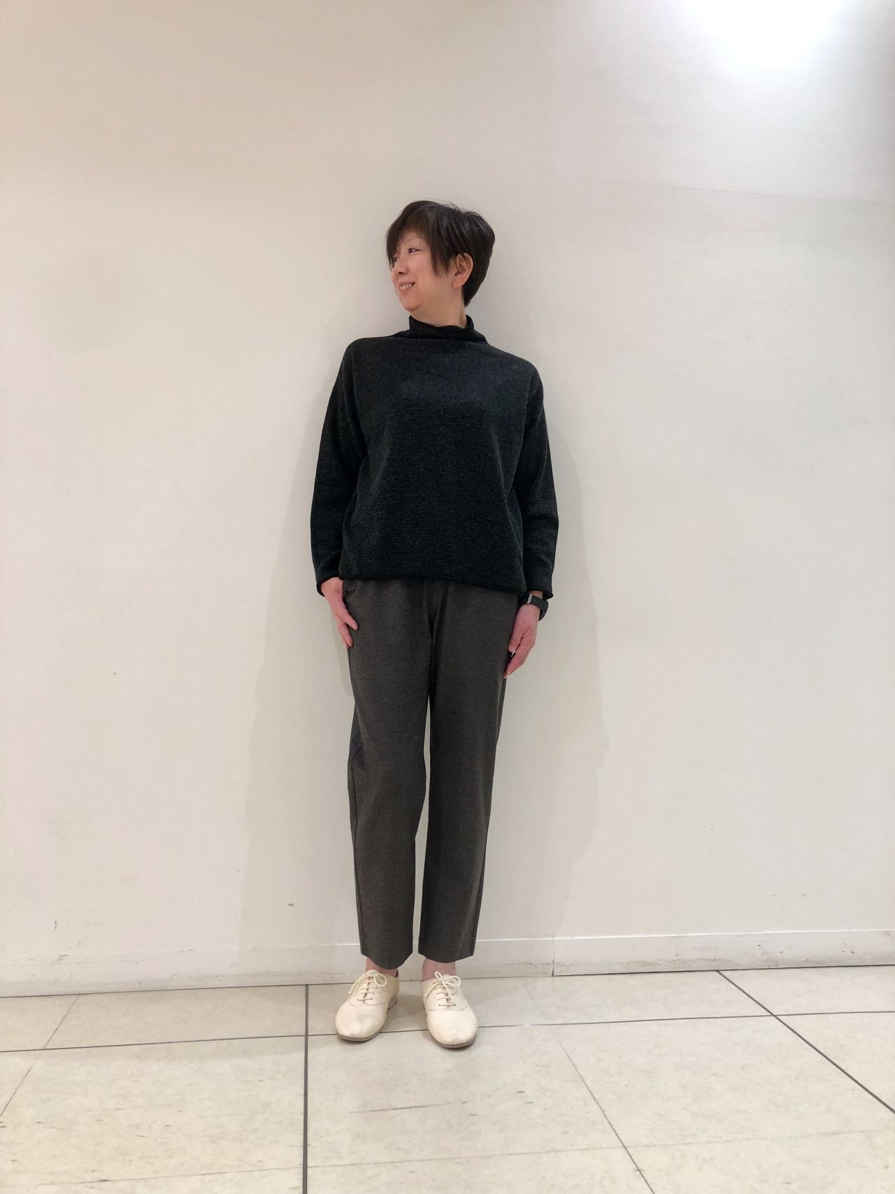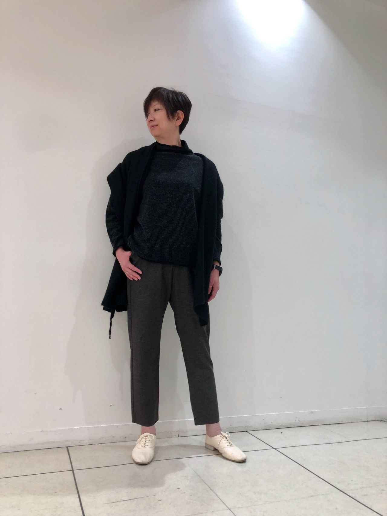 アイボリーは足元軽やかに見えるので、上にボリュームのコーディネートにはオススメです。