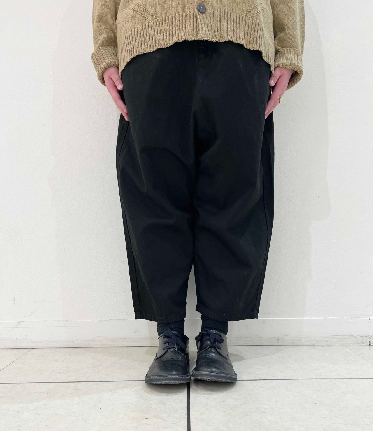 リラックス感のあるワイドテーパードパンツ。