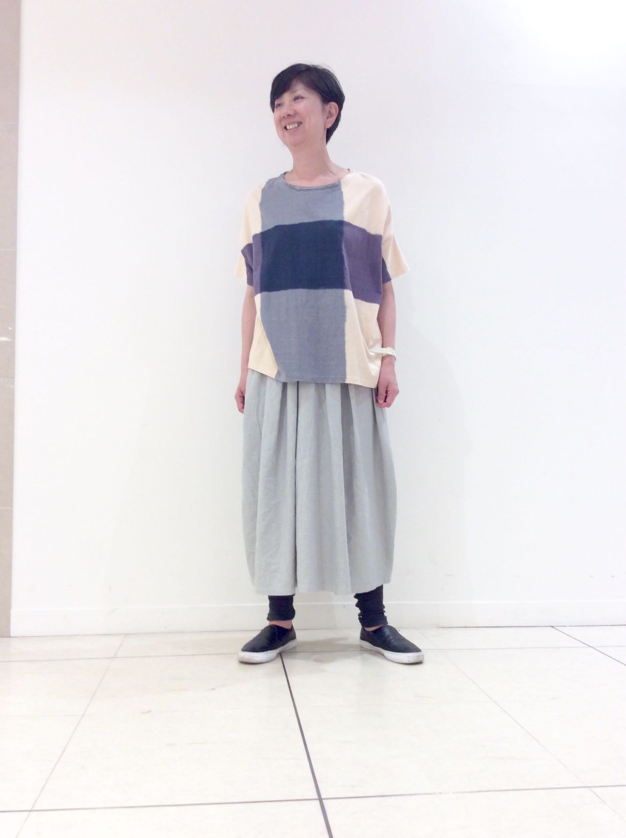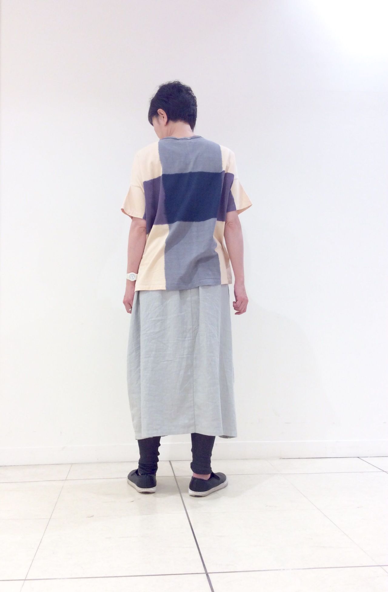 前身頃に入ったタックが入り、裾巾が広がり過ぎない縦長デザインです。