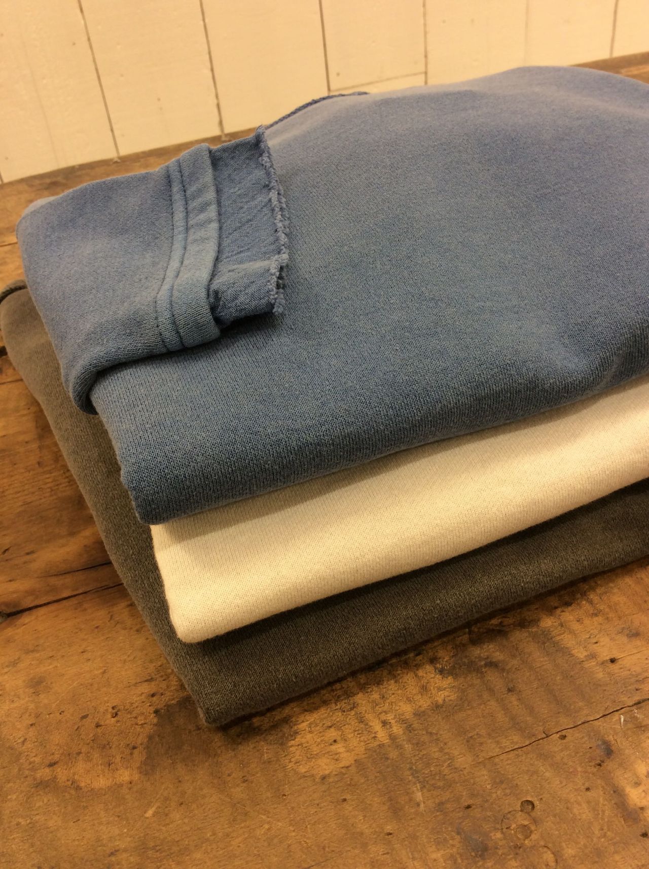 表糸が40番手、中糸が40番手、裏糸が16番手の無撚糸(糸の撚りを極力弱めて作られた糸、撚りが弱いためソフトな風合い)で作られた裏毛に、製品顔料染めを施した。