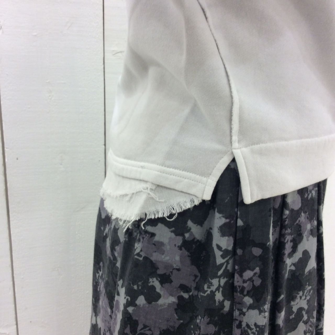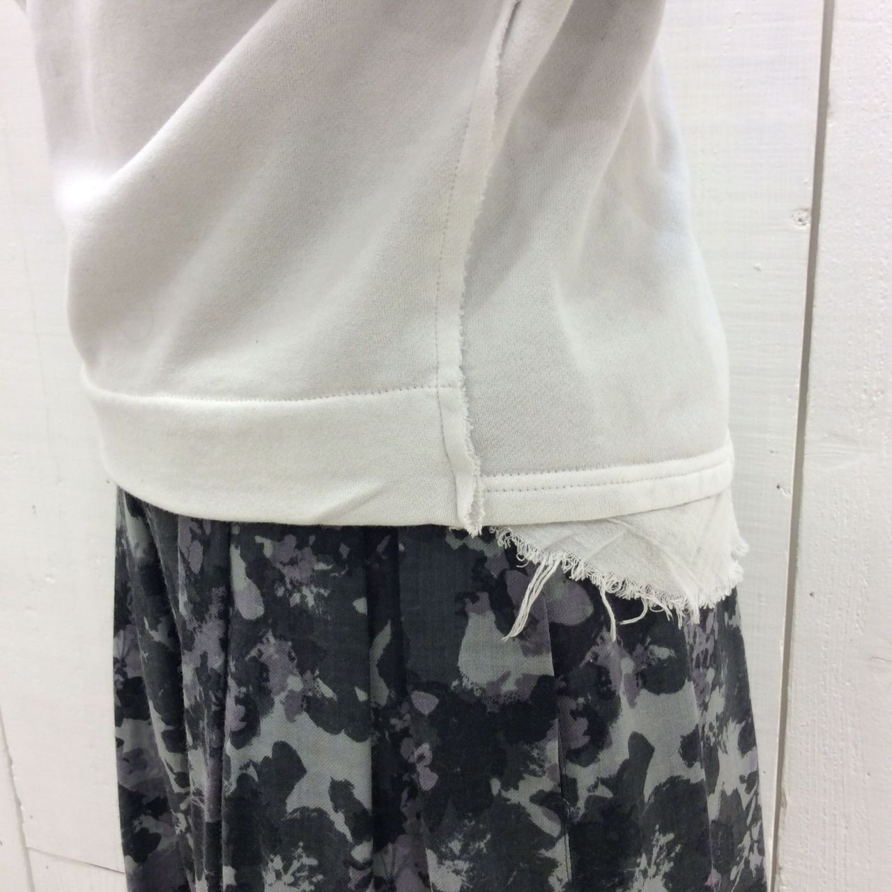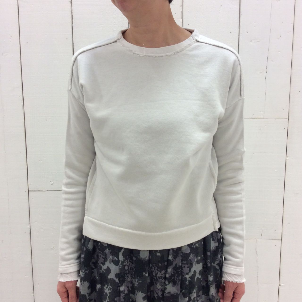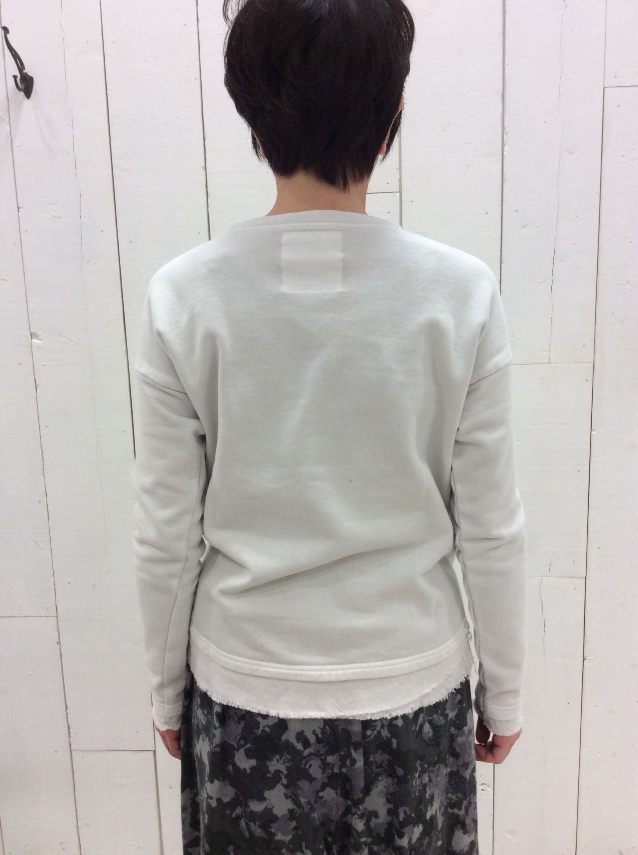 定番アイテムであるスウェットに、袖口のやや長めのリブや、後裾に付けたフリルのような別地、断ち切り等のディティールにパドカレらしさを散りばめました。