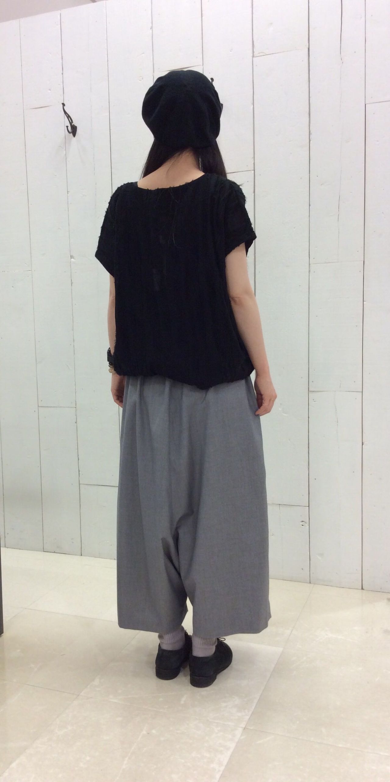 ウエストはゴムで履きやすく、前のタックをポケット仕様にしています。
