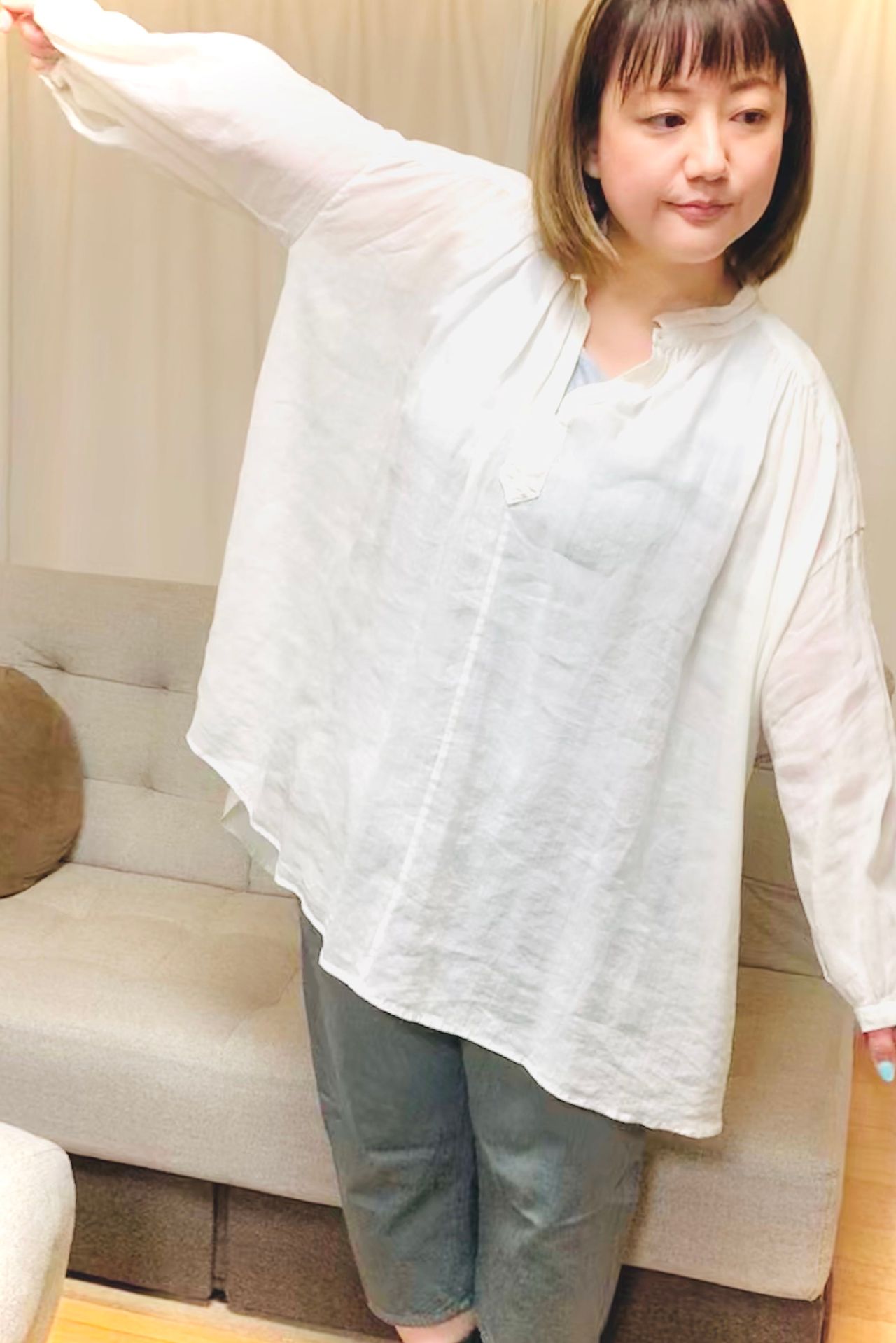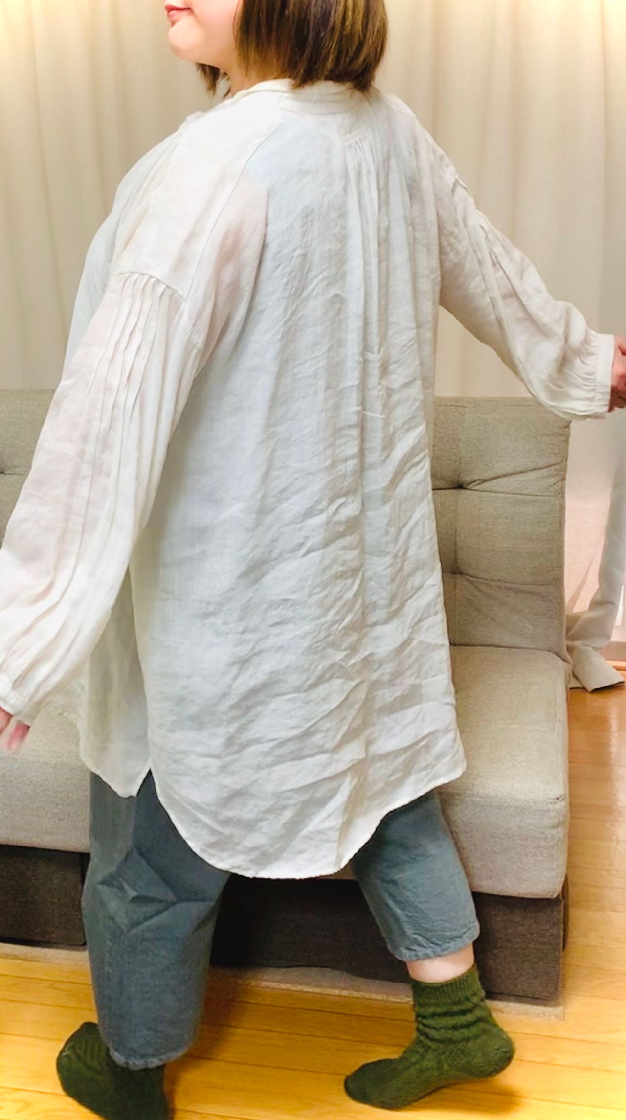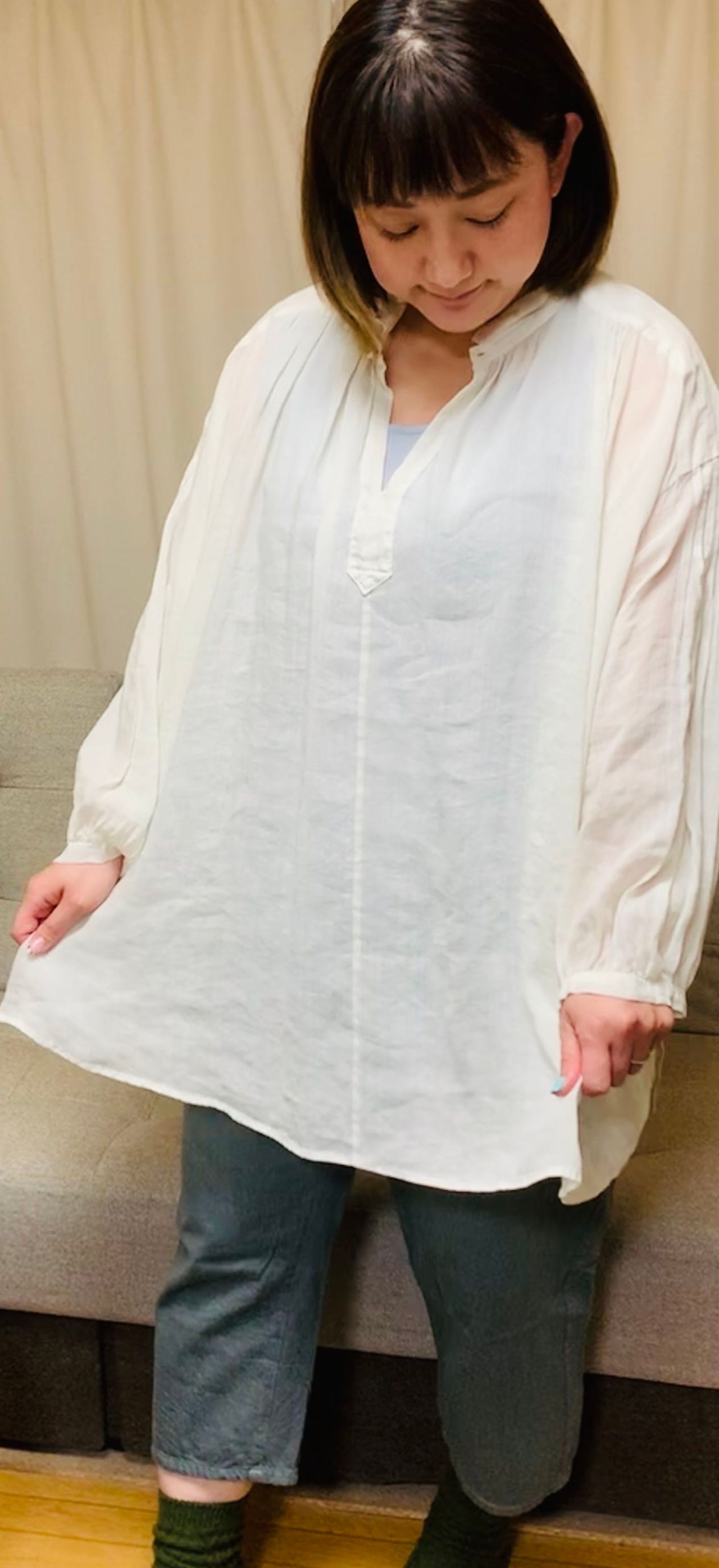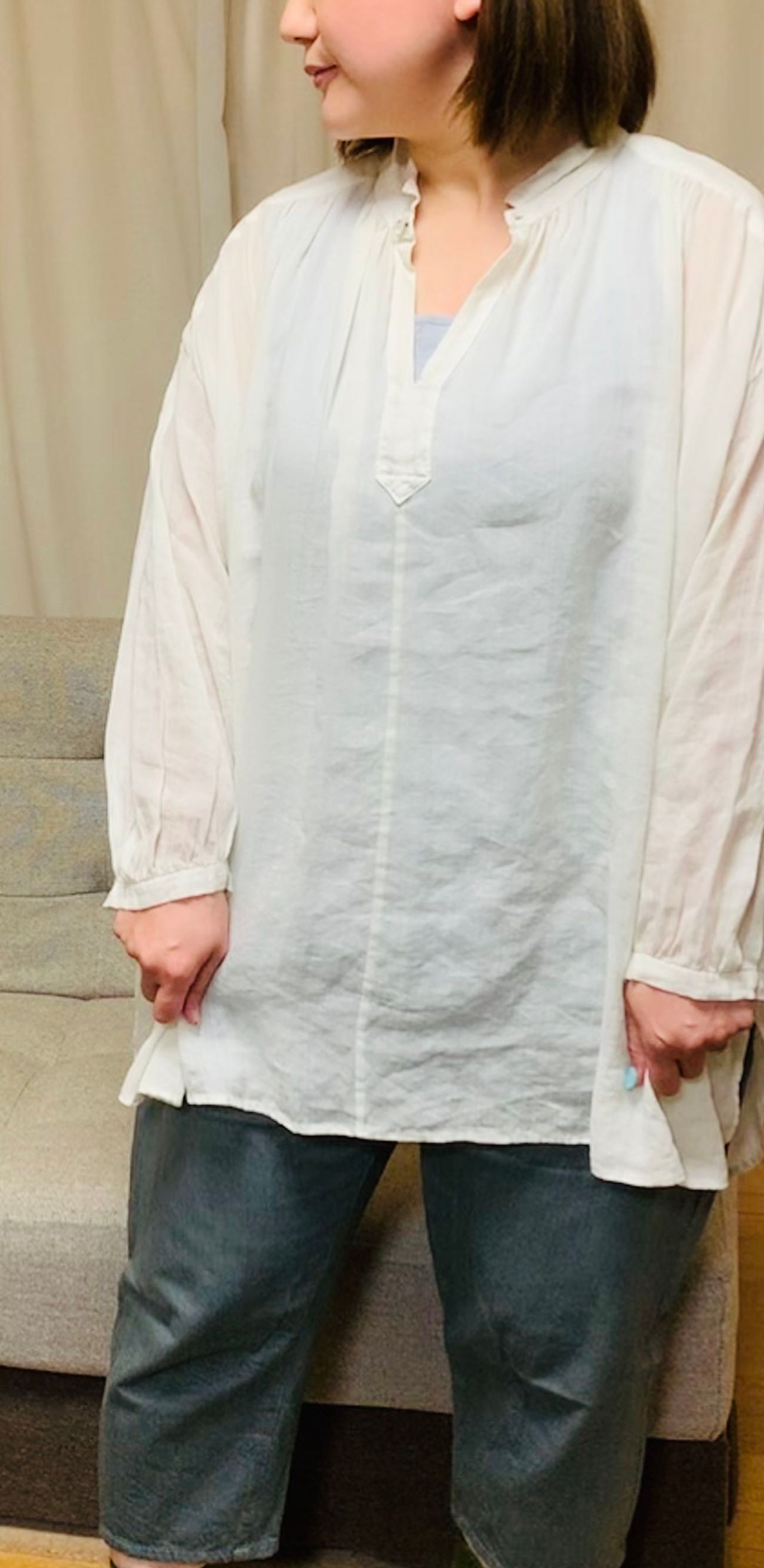 おしりがすっぽり隠れる長さのゆったりブラウスです。