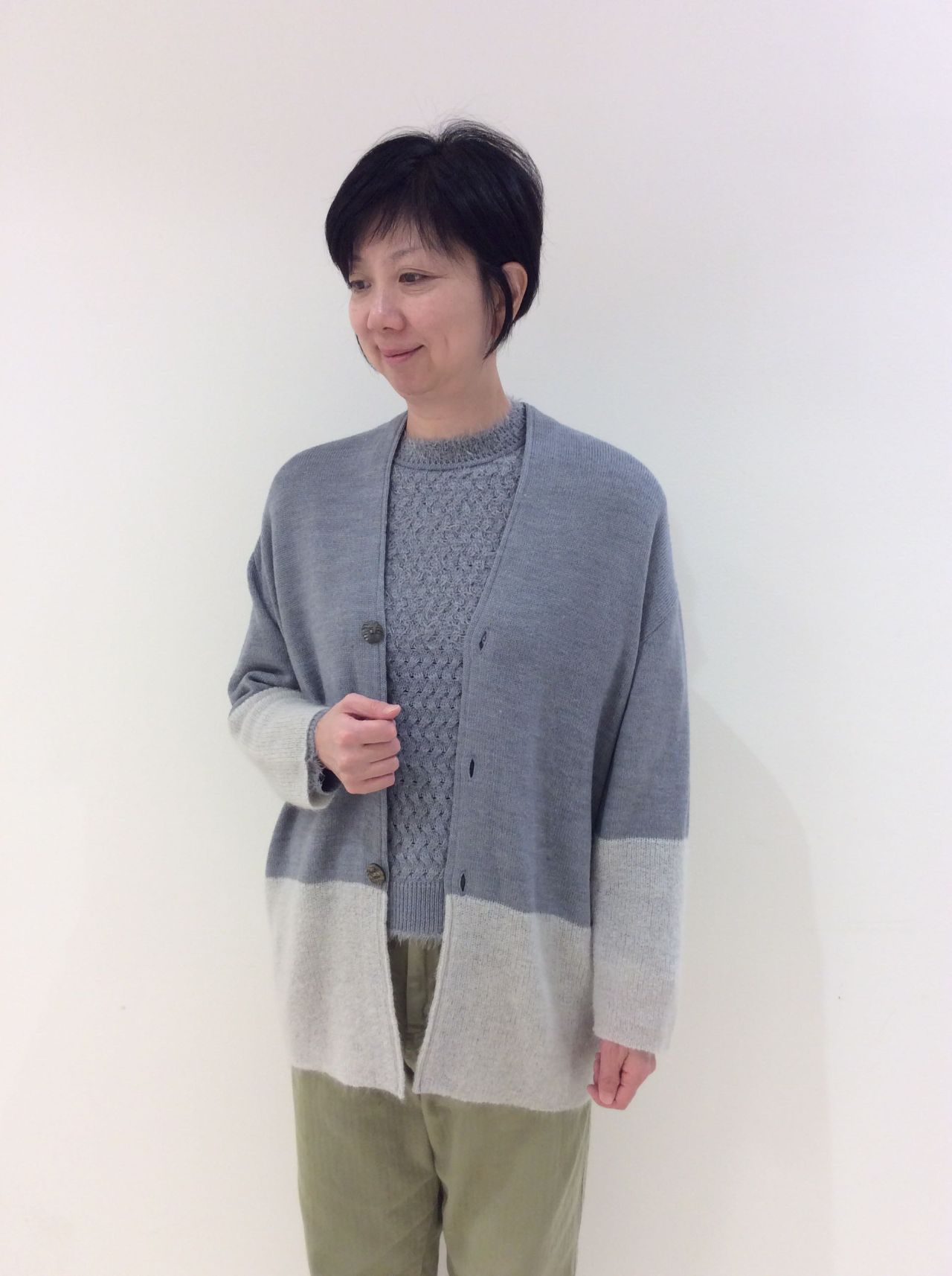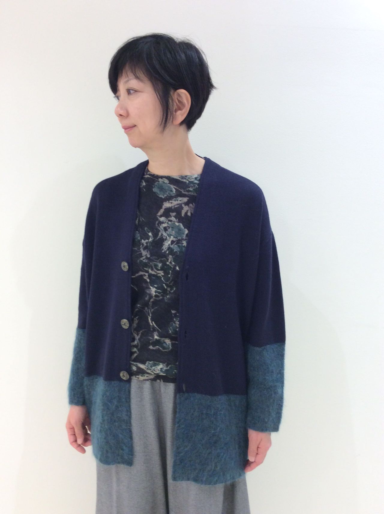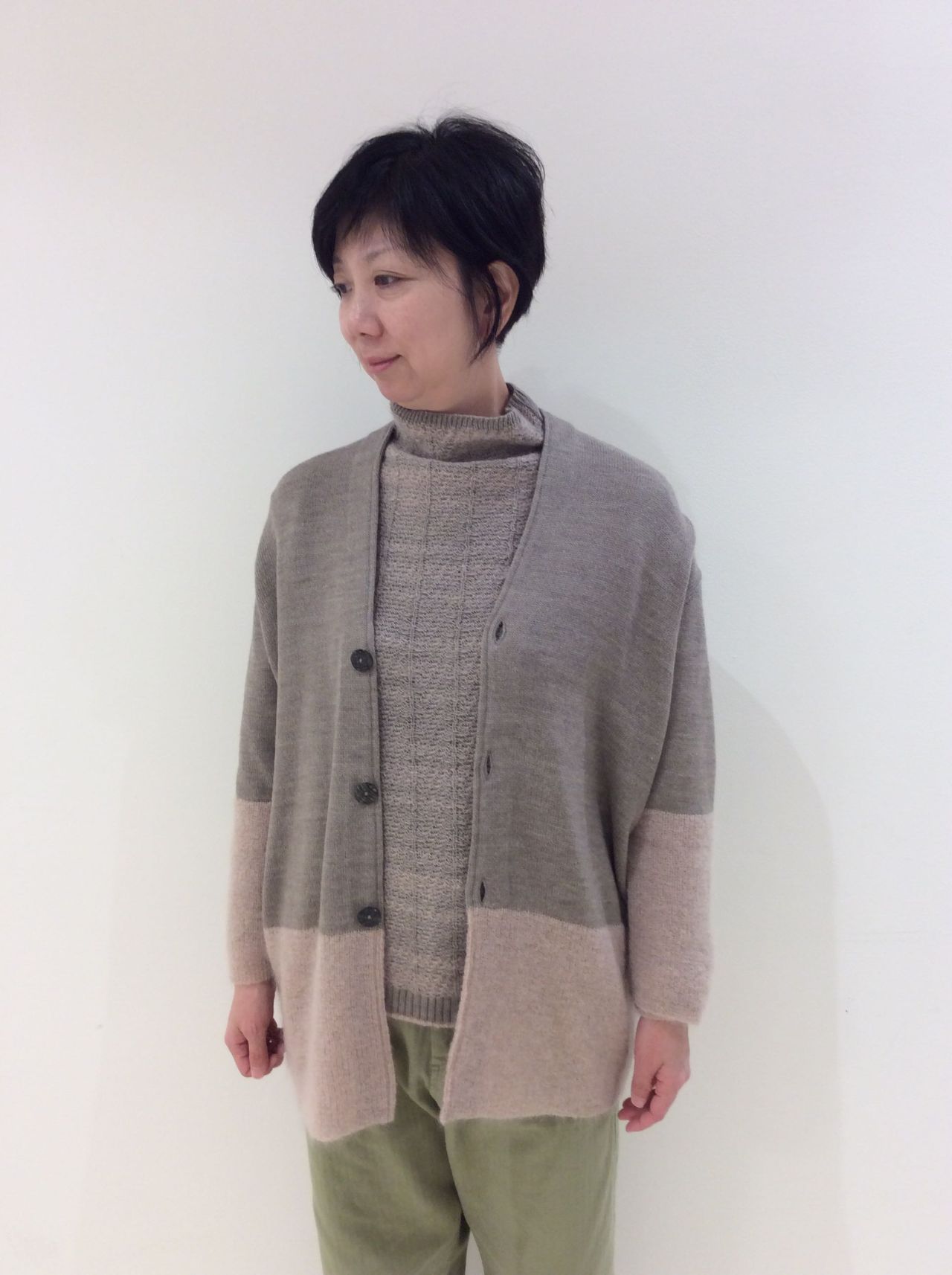 同じモヘアで作ったプルオーバーニットとあわせても、たっぷりしたサイズ感の為アンサンブルとしても着用出来ます。