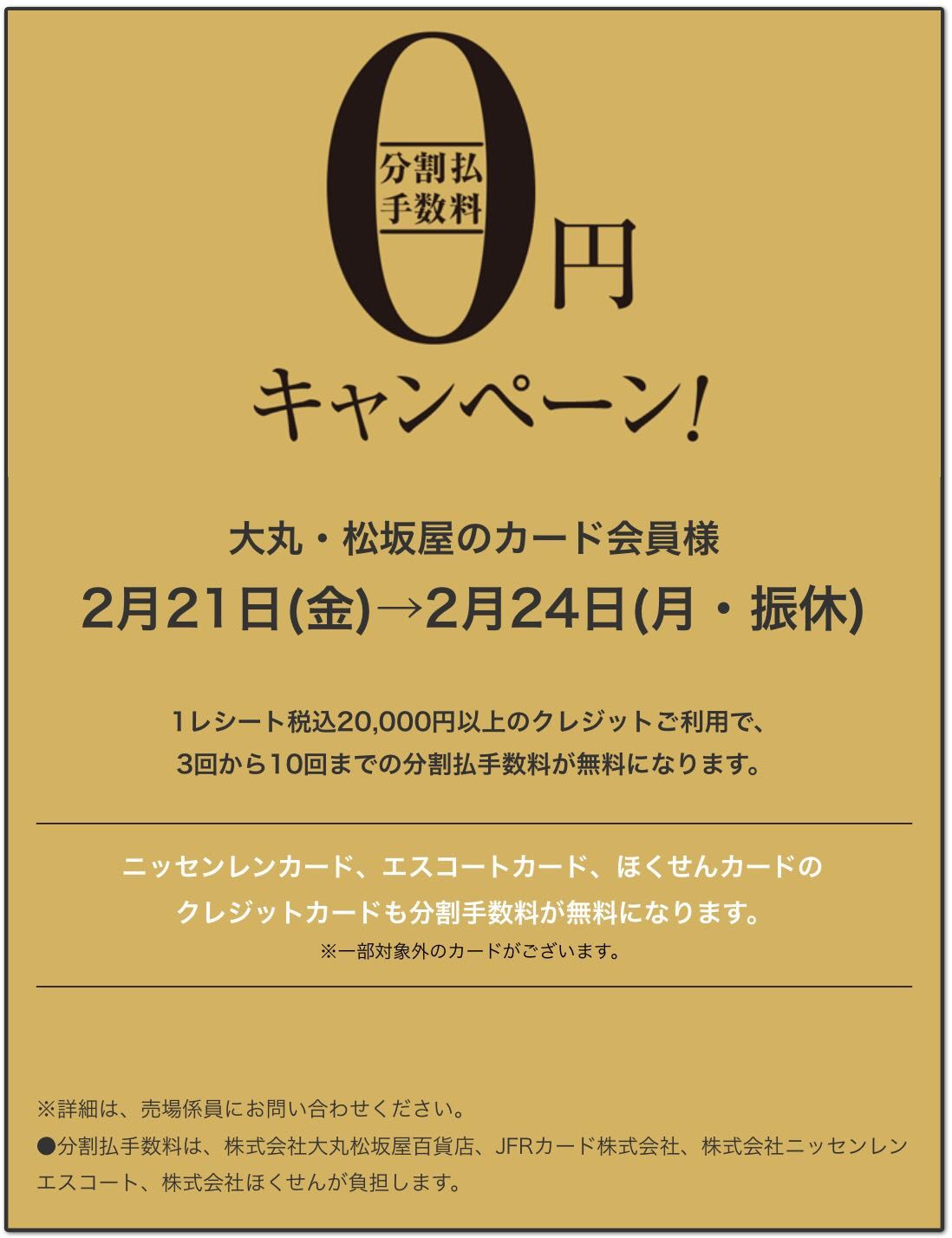 大丸・松坂屋のクレジット会員様、およびニッセンレンカード、エスコートカード、ほくせんカード会員様限定。1レシート20,000円以上(税込)のクレジットご利用で、3回から10回までの分割払手数料が無料になります。※一部対象外のカードがございます。
