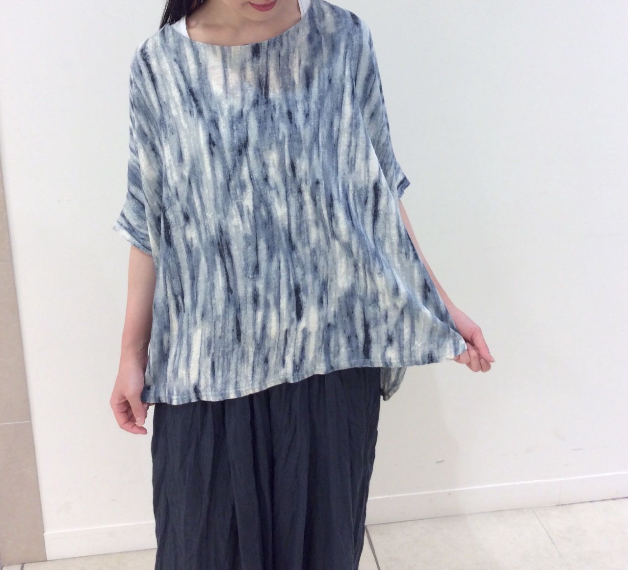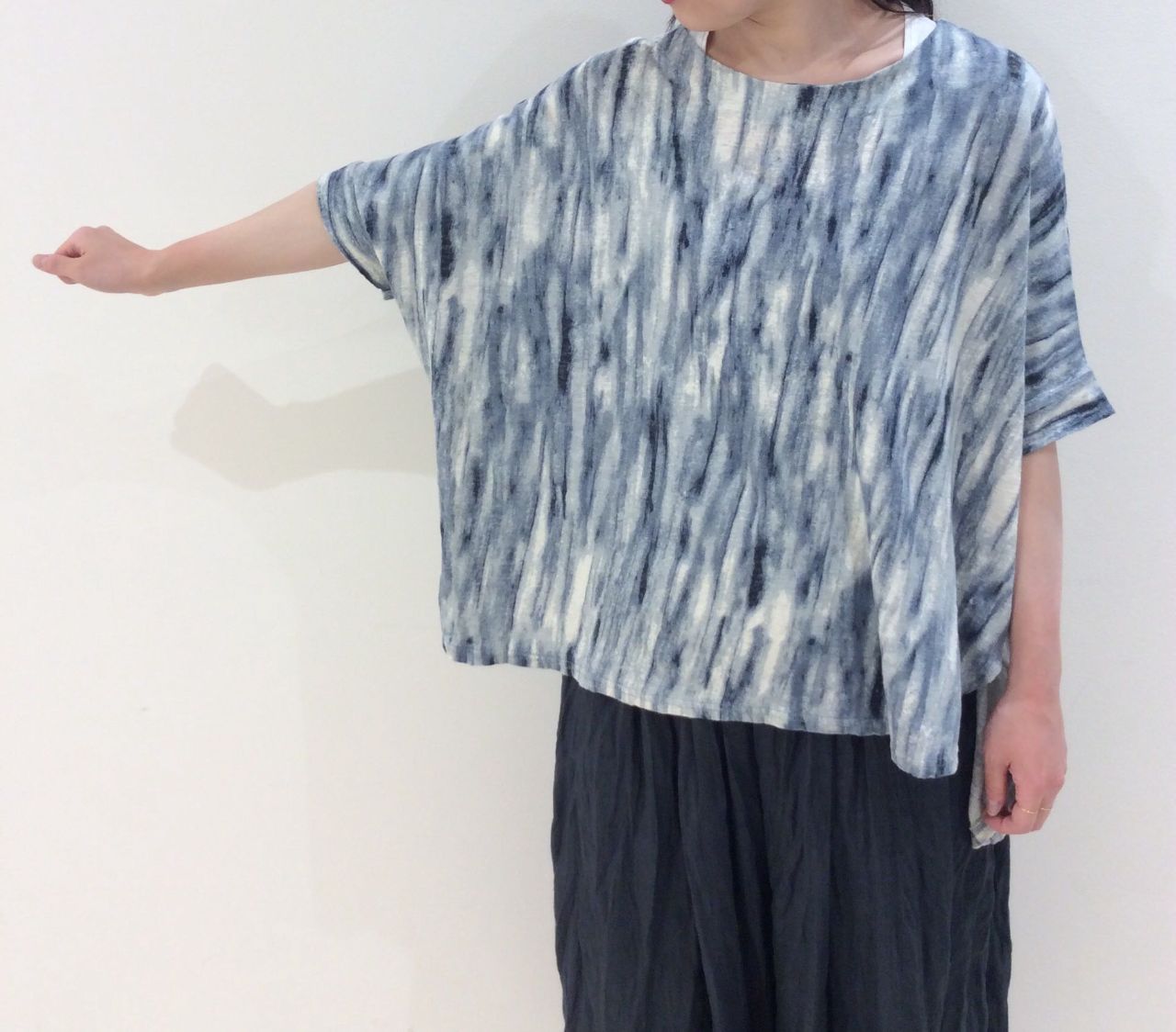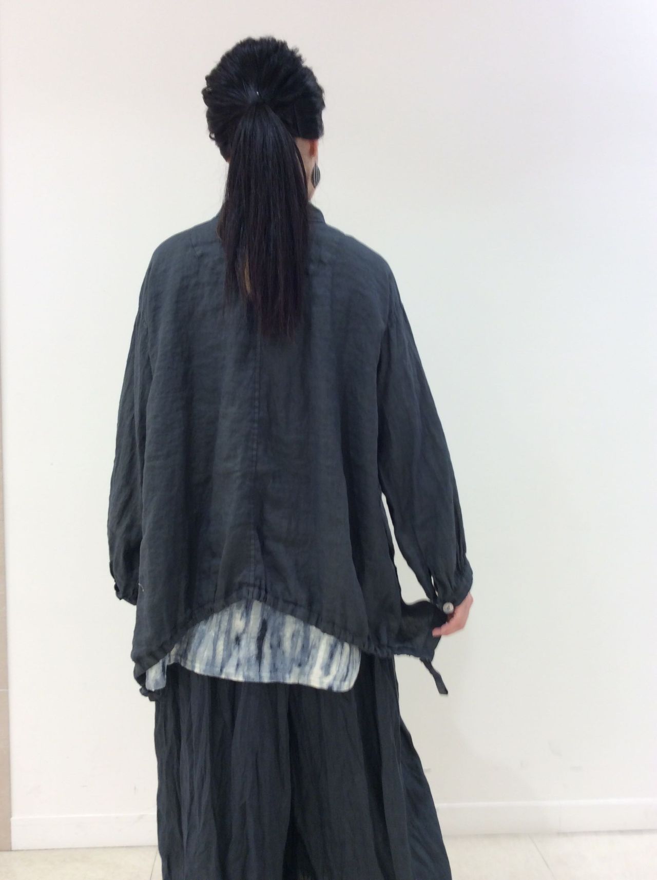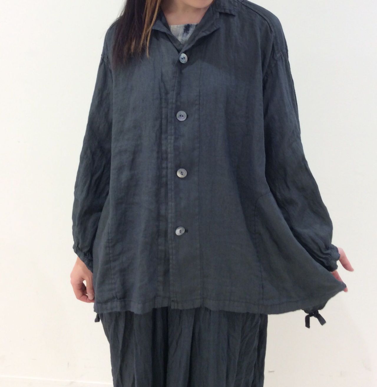 横幅がゆったりしていますが、着ていただくとリネンの自然な落ち感ですっきり見えるシルエットです。