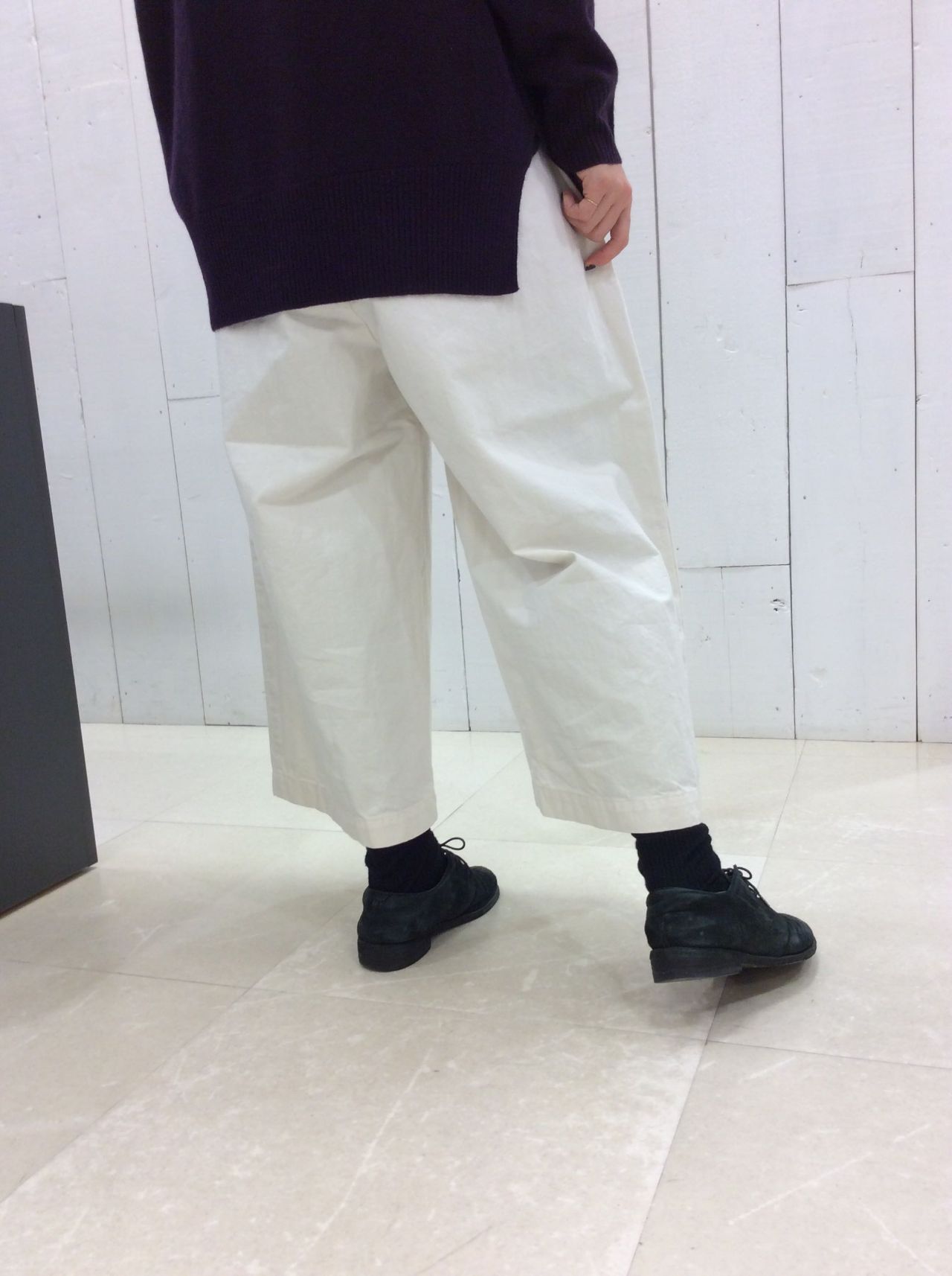 ウエストゴム仕様のクロップドパンツです。