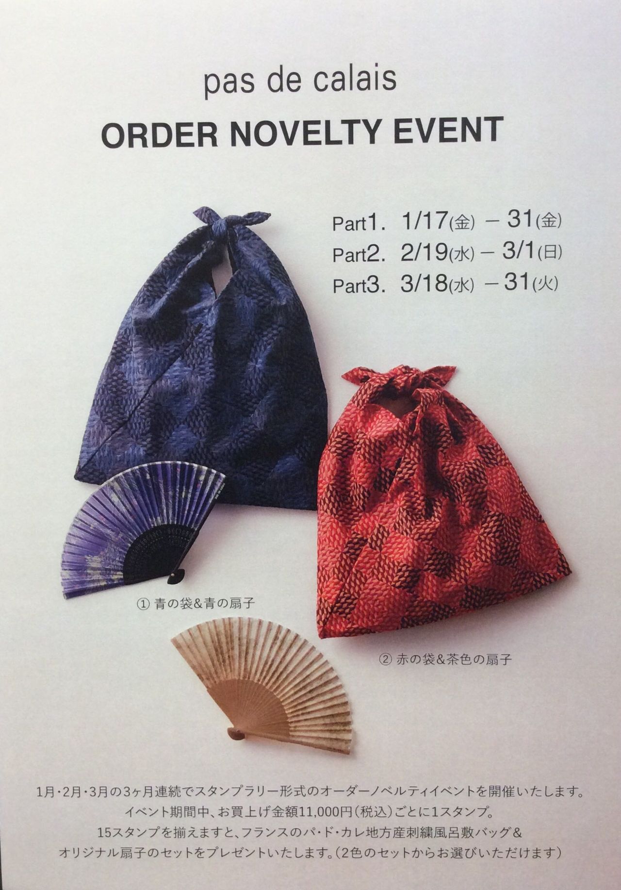 15スタンプを揃うますと、フランスノベルティーパドカレ地方産刺繍風呂敷バック&オリジナル扇子のセットをプレゼントいたします。(2色のセットからお選びいただけます。)