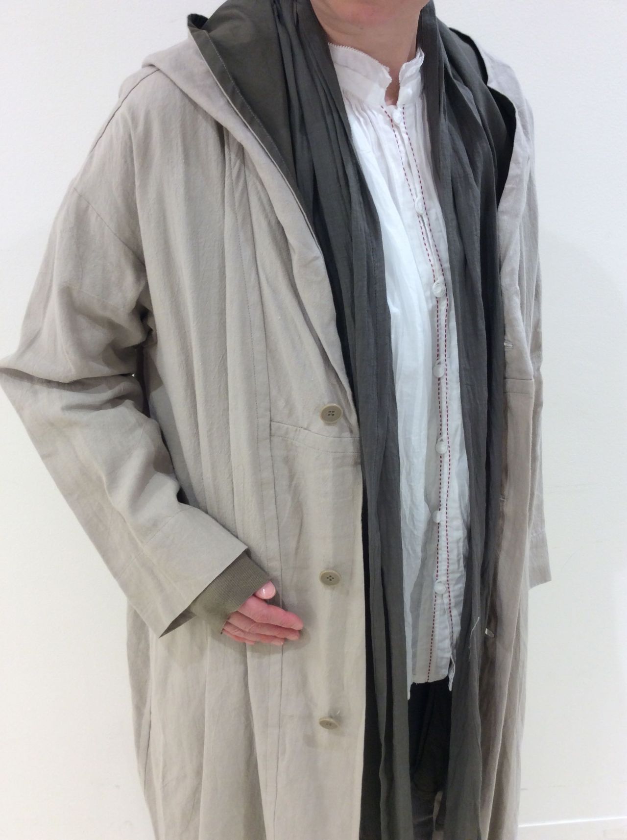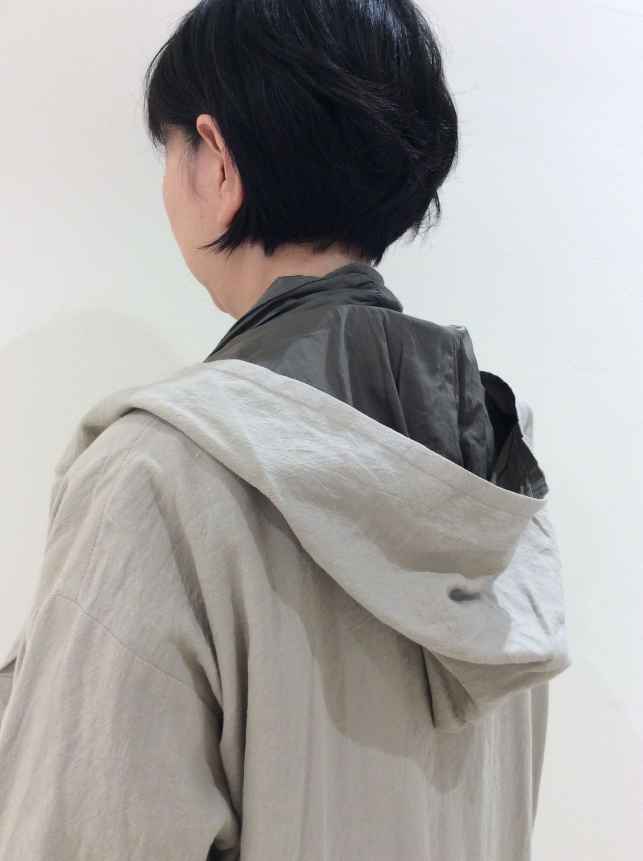 表コートはフード付き、ライナーにストールの様なボリューム衿がありセット着用でも表だけでも楽しめる。