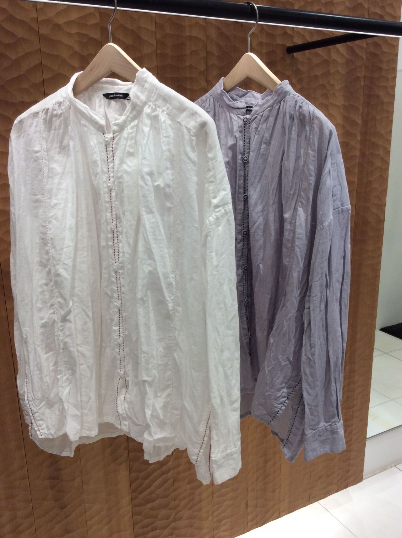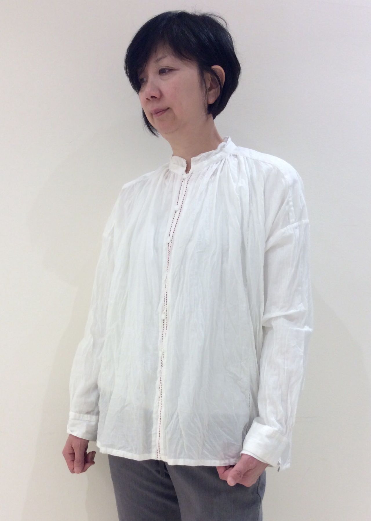 配色ピンポイント.ステッチを前端と脇スリットに施した綿/麻/ラミーボイルのブラウスです。