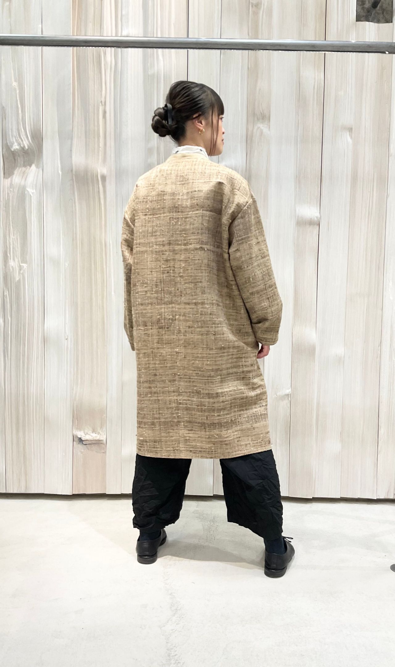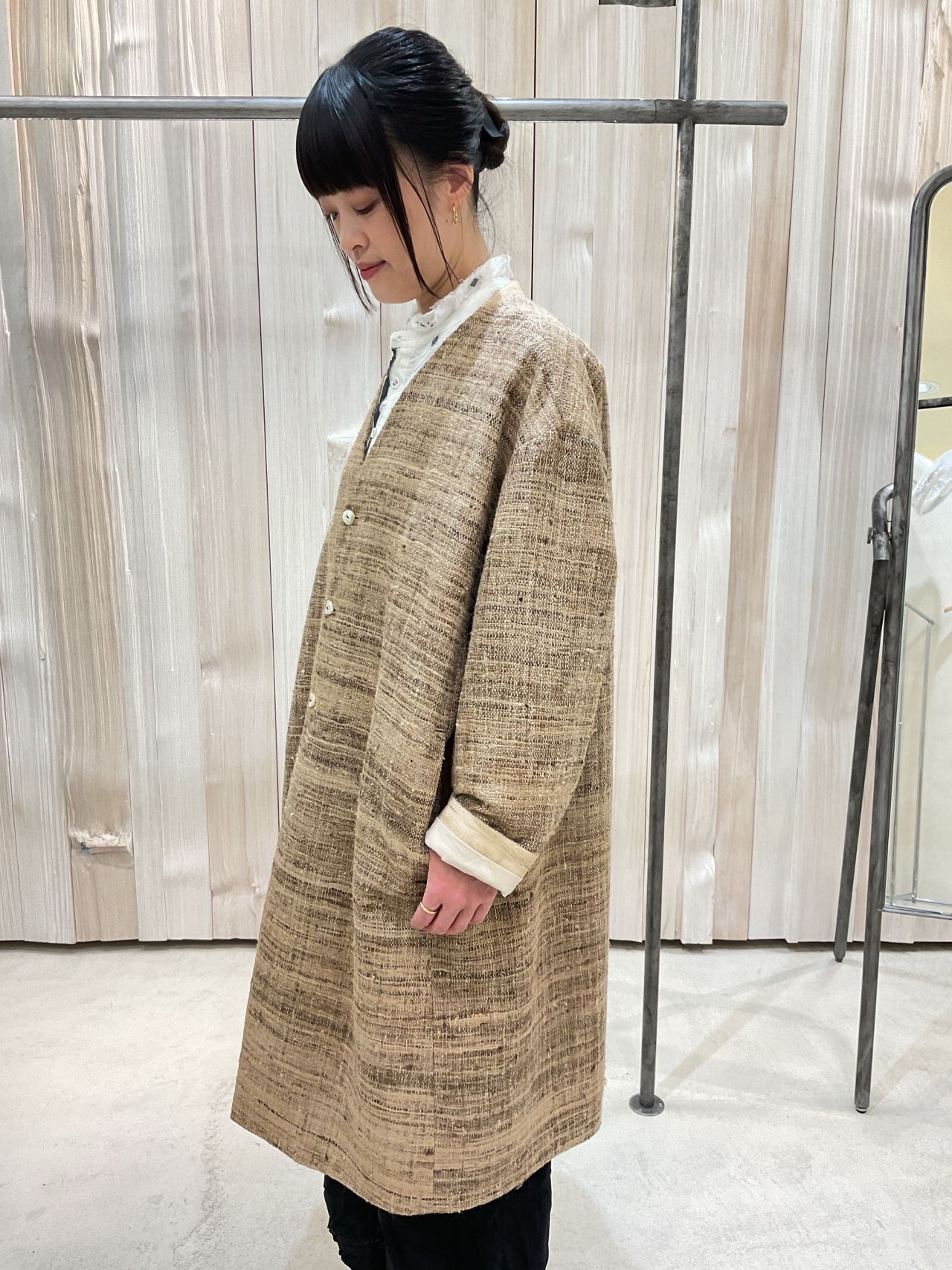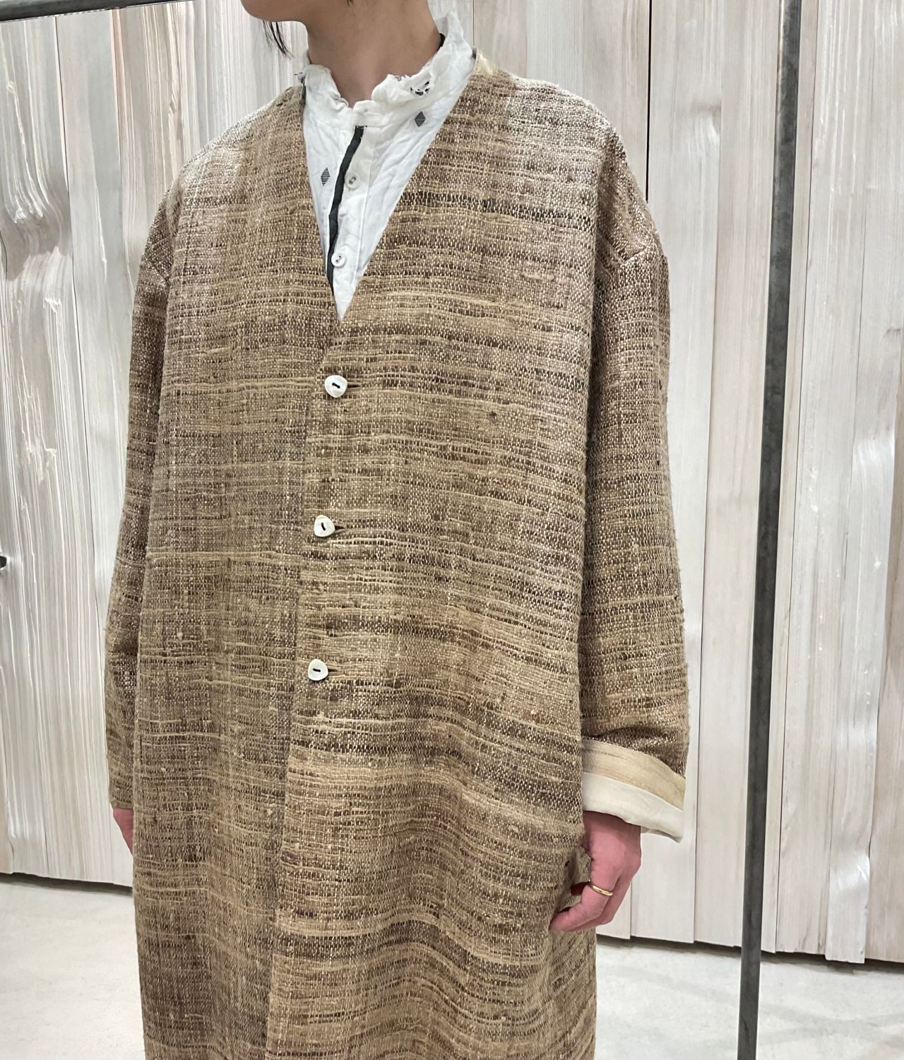 Vネックのハーフ文コート。後ろ様はタッサーシルクの別地使用。小さなスタンドになっており、周りには黒糸の記色飾りステッチを施しています。裏地付き。部分的にコットンシルクのドッド柄カットドビーを施した裏地も魅力。