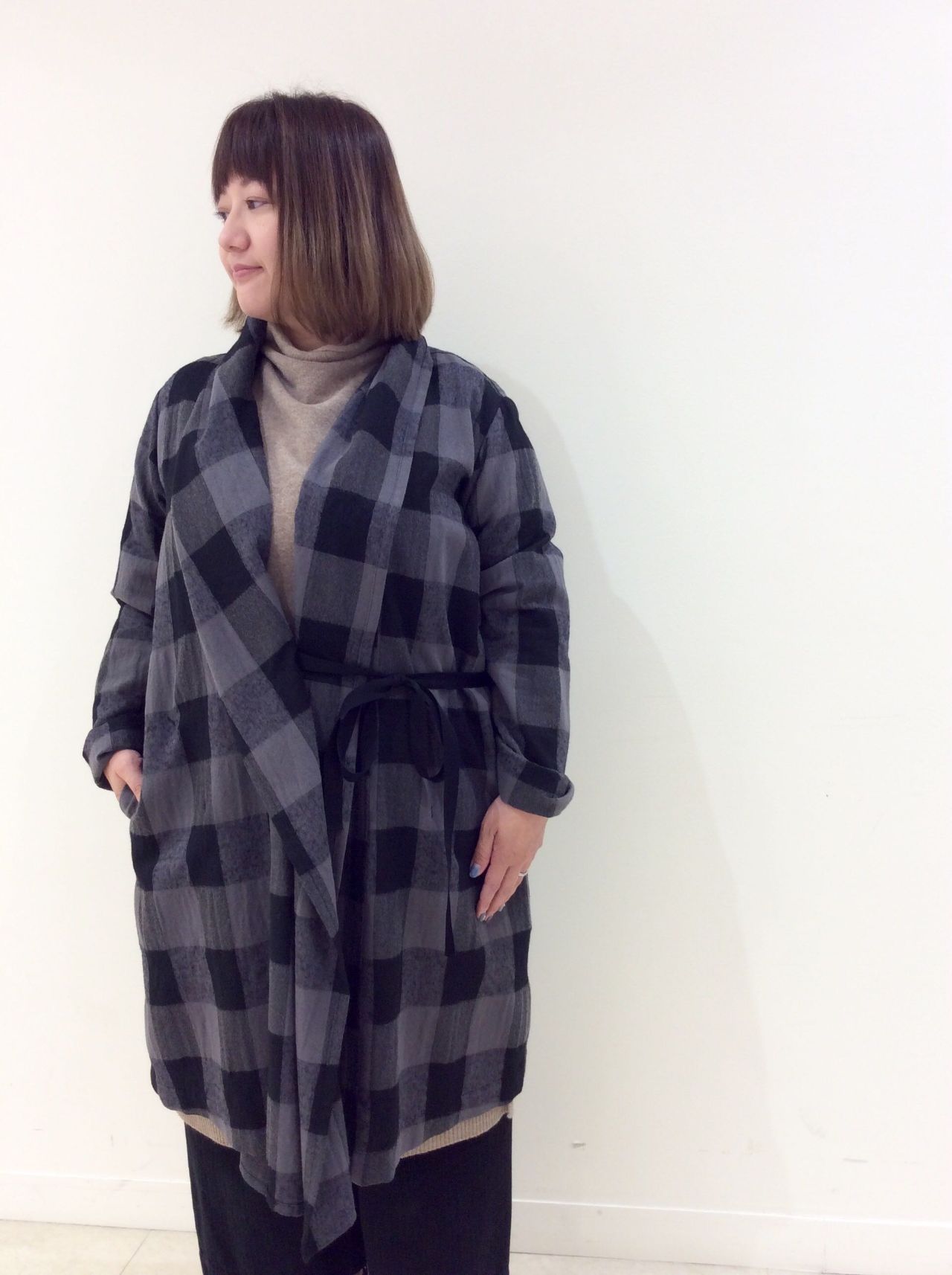 ベルトをしめても、前を開けてもかっこよく着こなせるコートです。