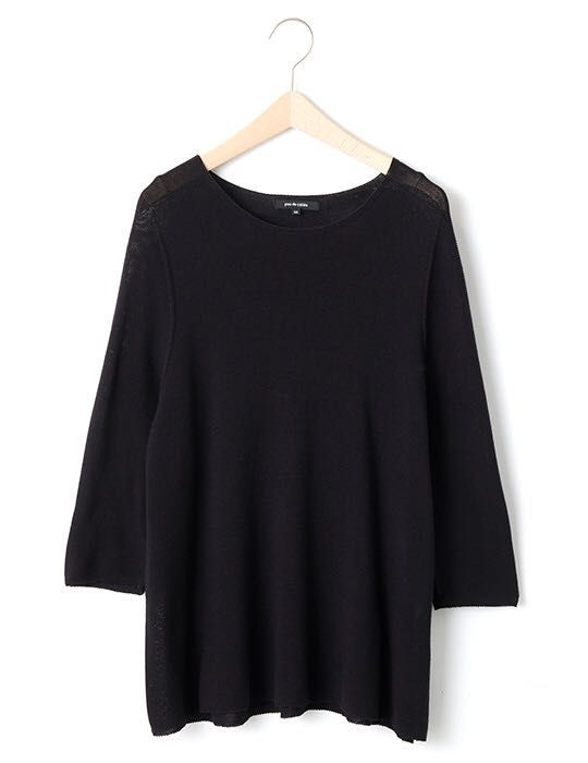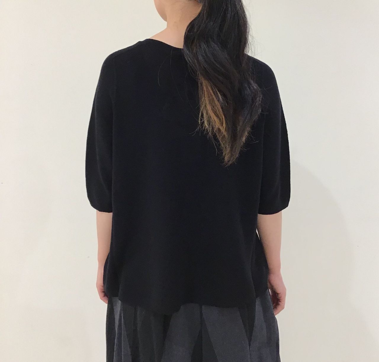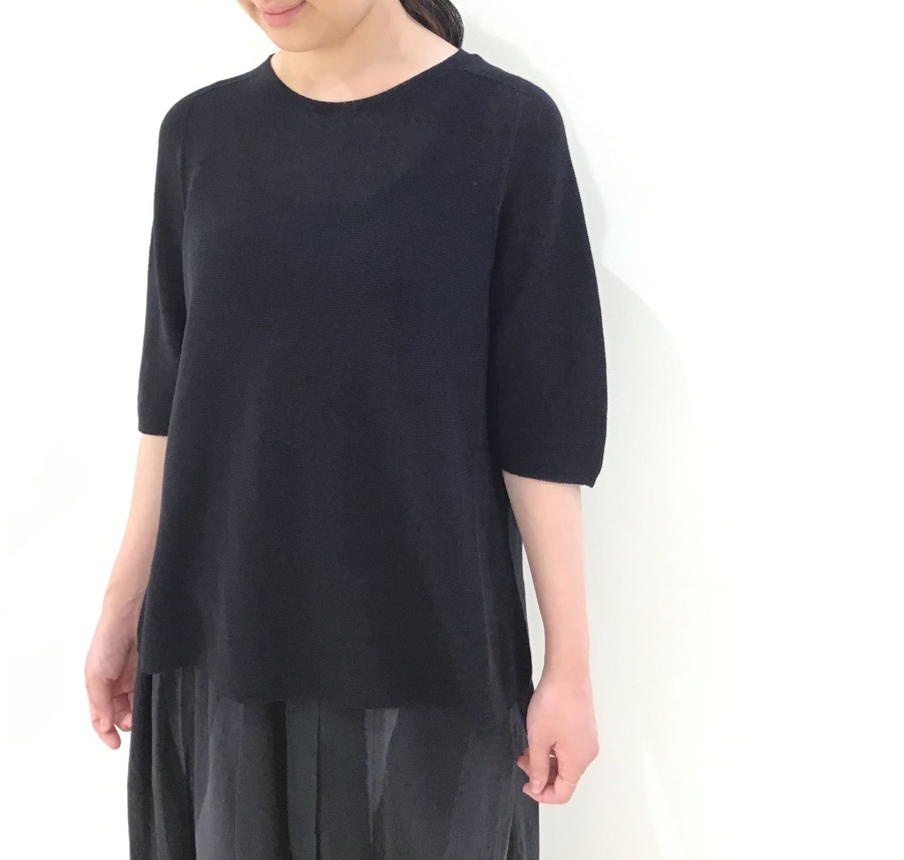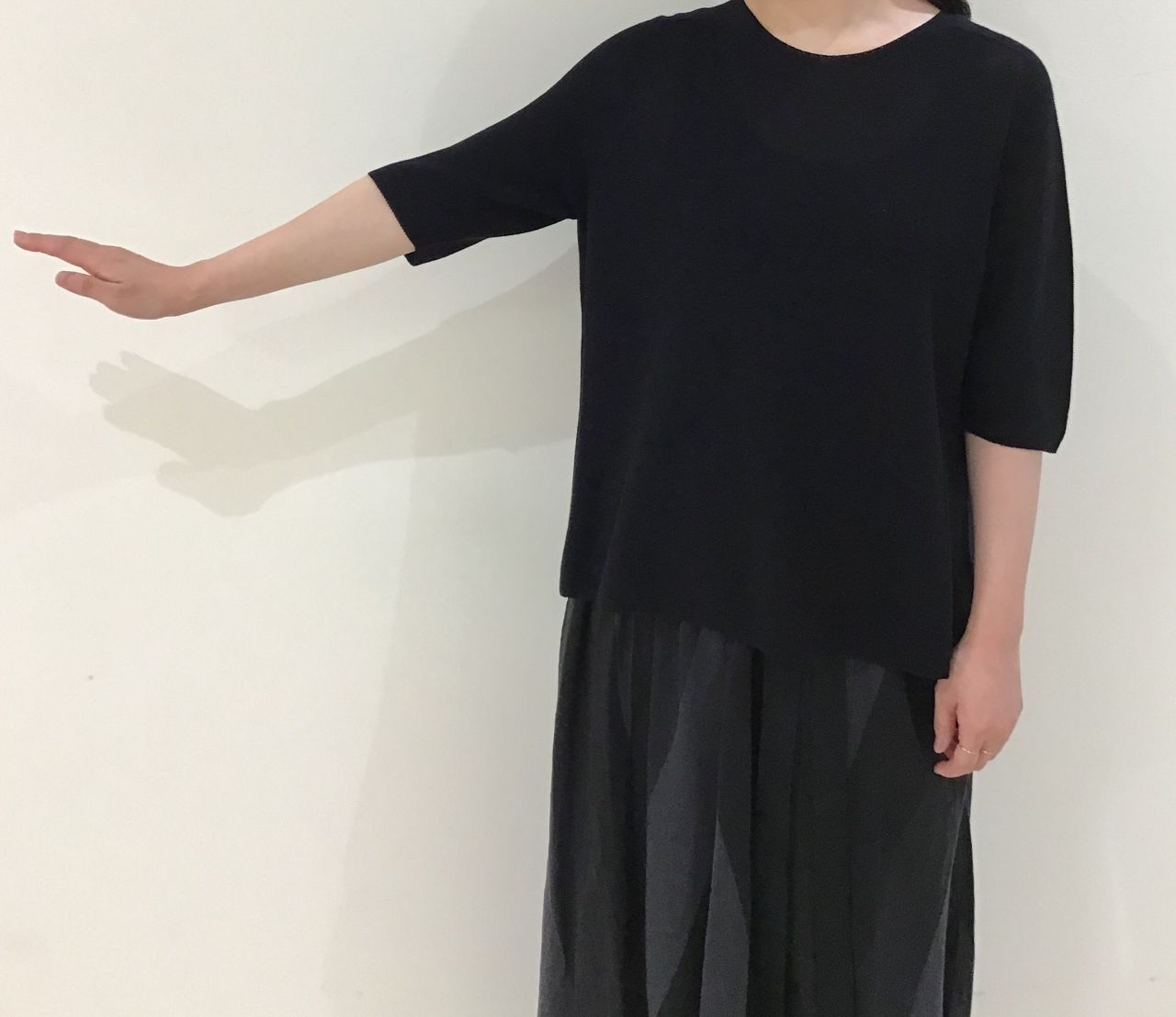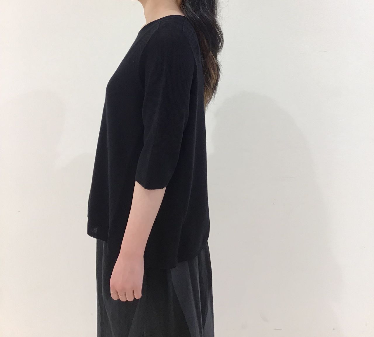 シンプルな五分袖のニットプルオーバー。肘が隠れる長さが着やすいです。