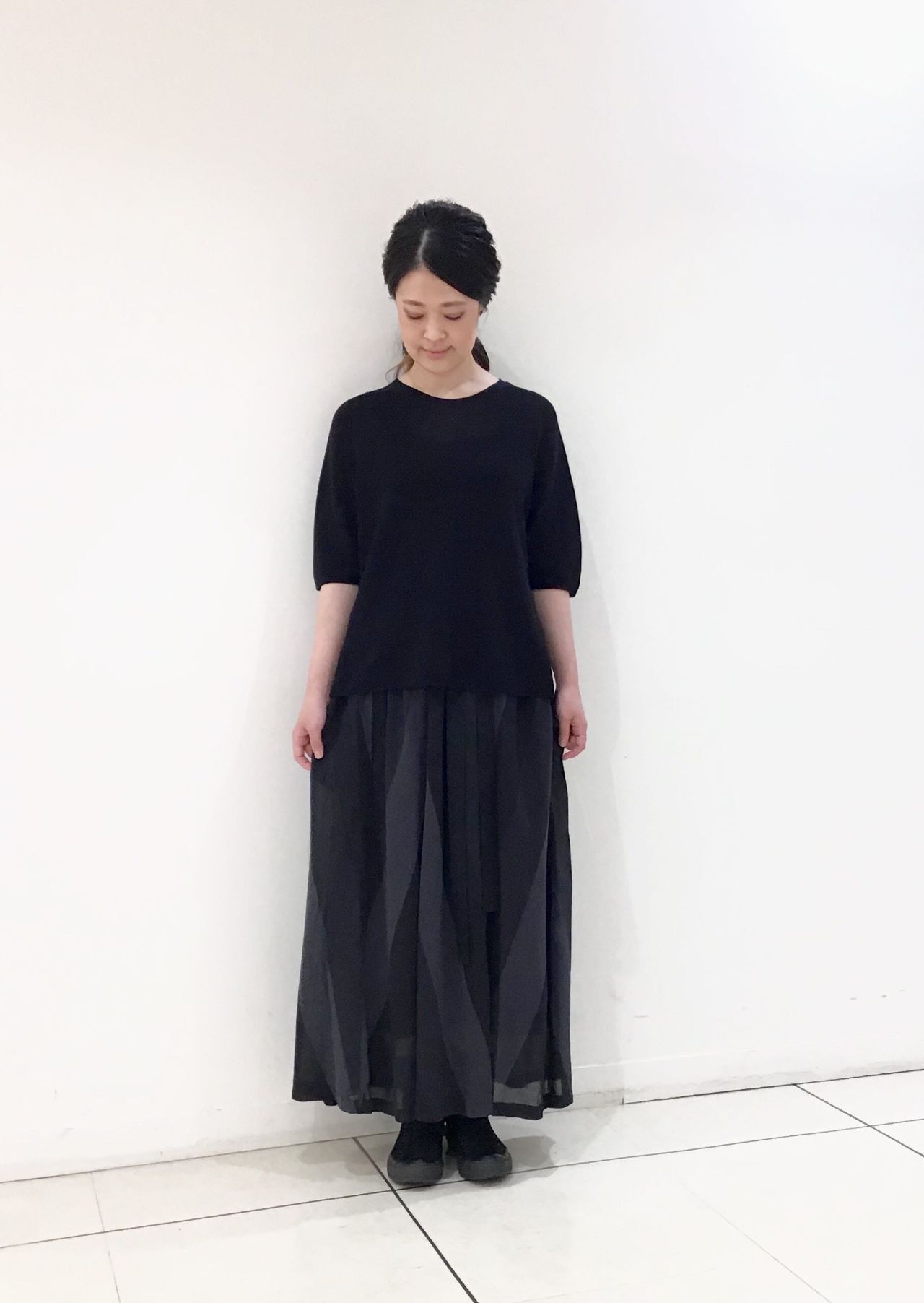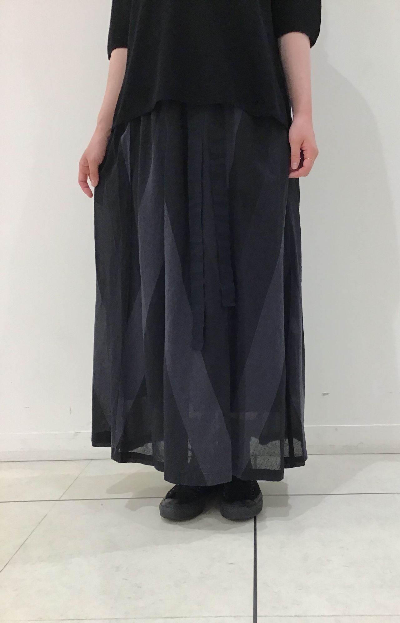 裾に向かって広がるボリューミーさと、斜めに出るボーダー柄がポイントになります。