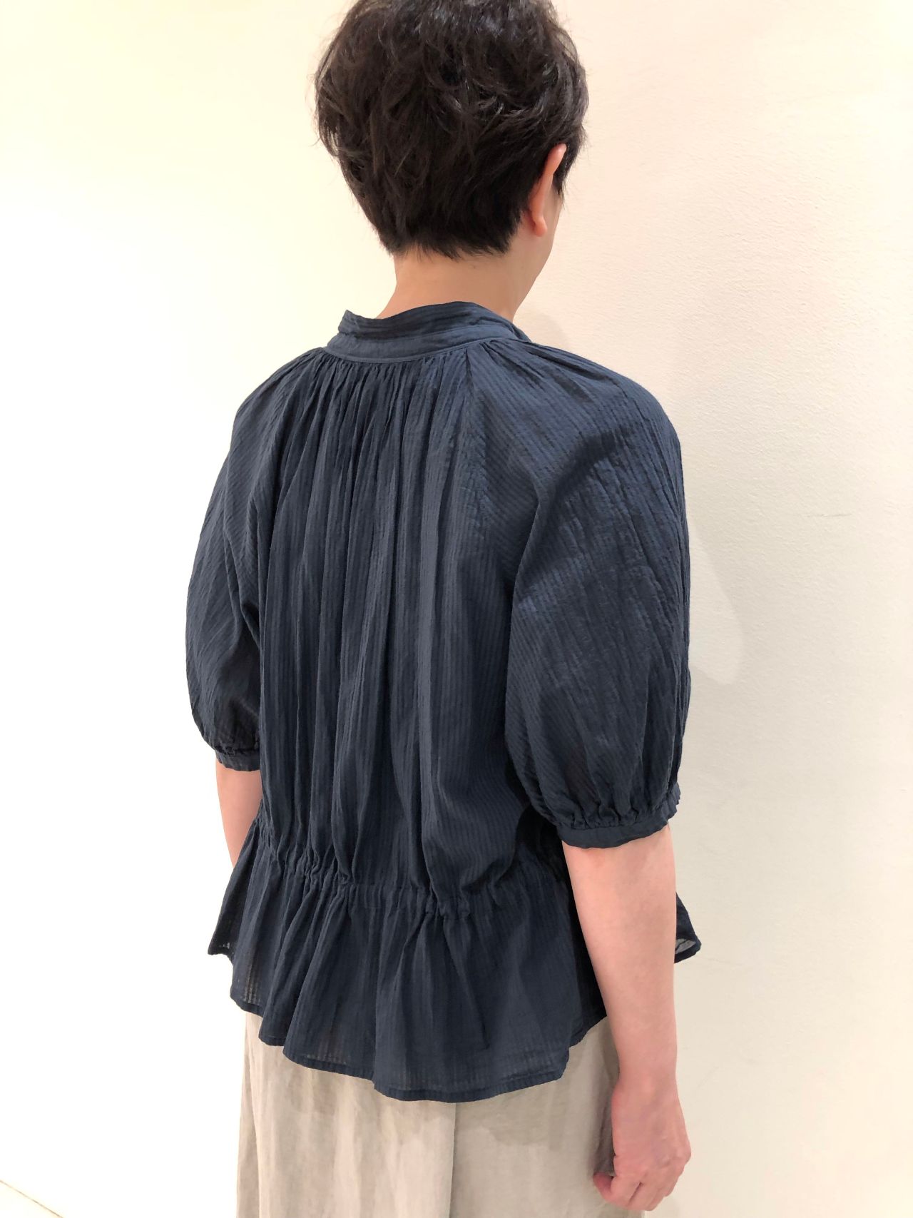 前は無地、袖~後ろにかけてストライプ生地で切り替えたデザインです。