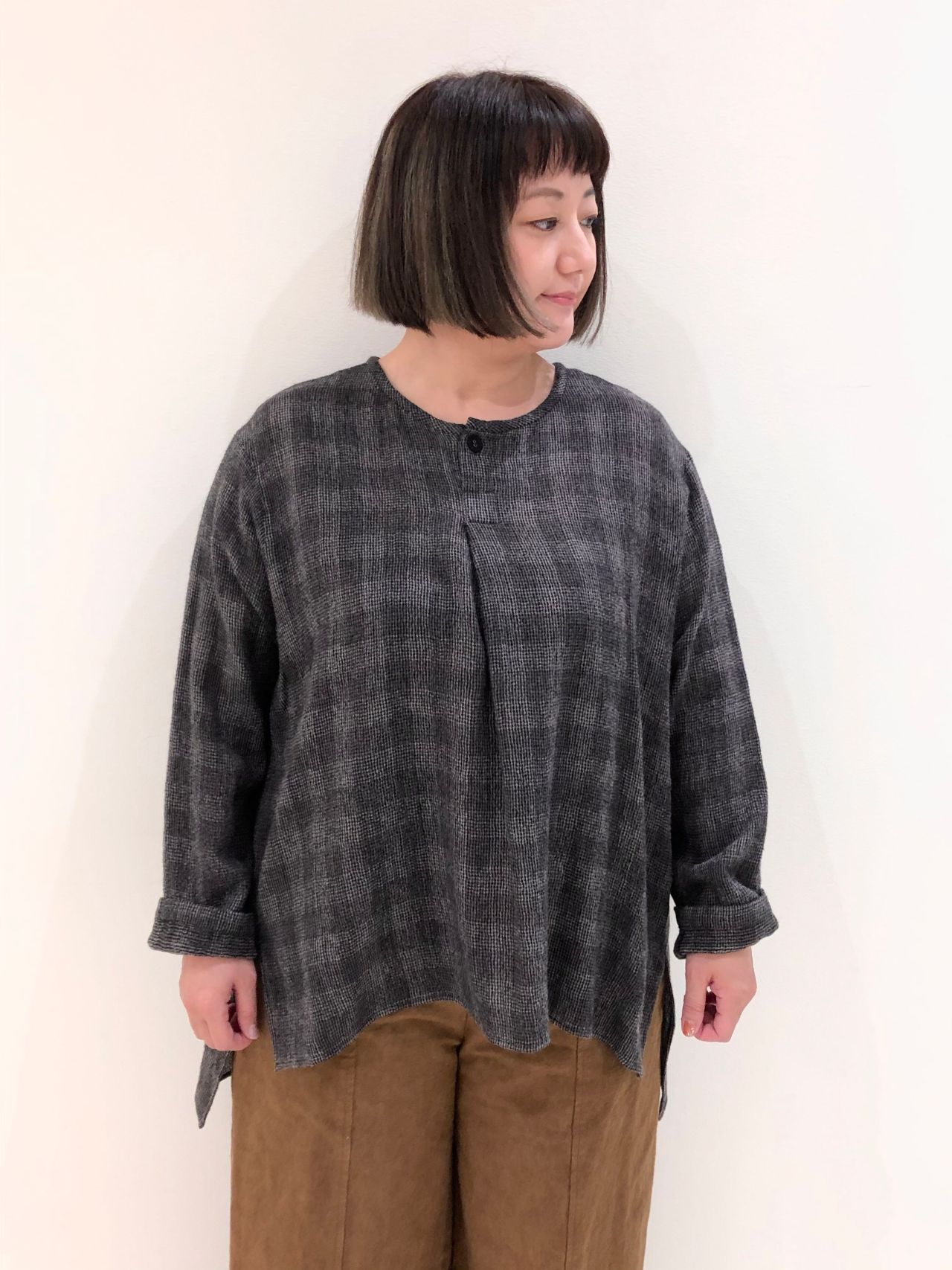 中に着たのはヘンリーネックブラウス。