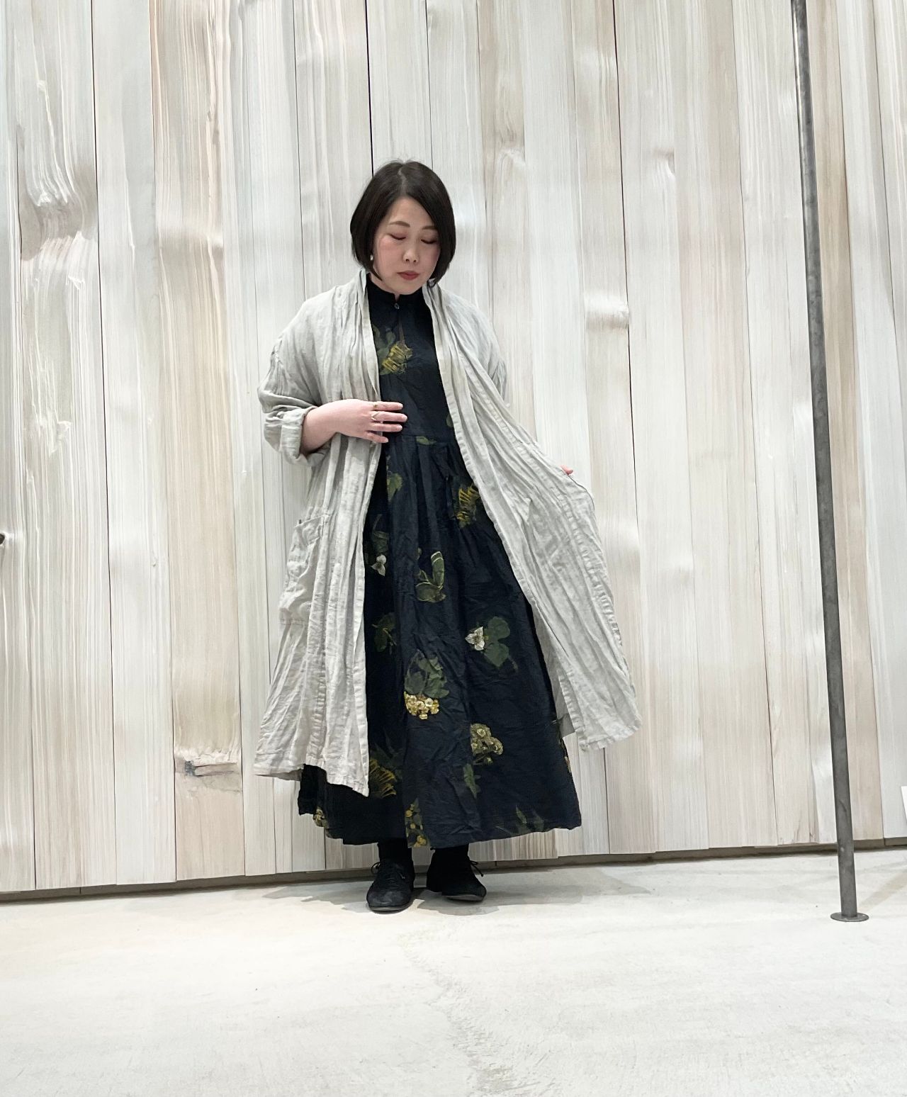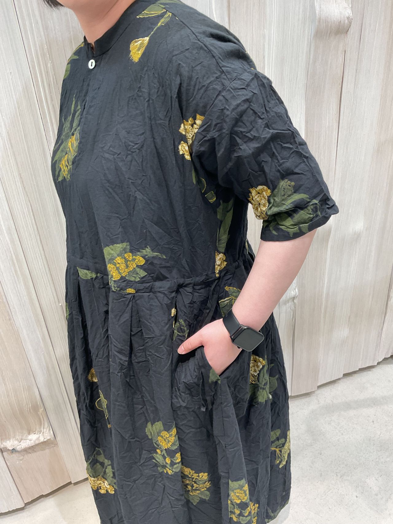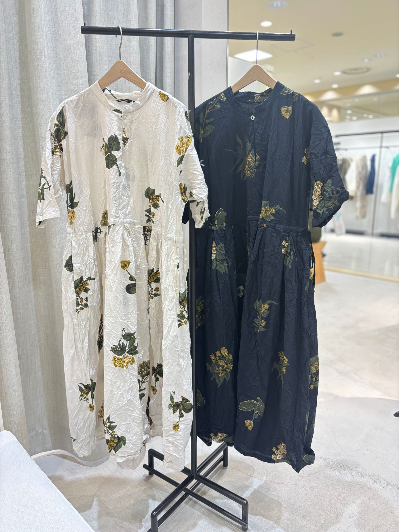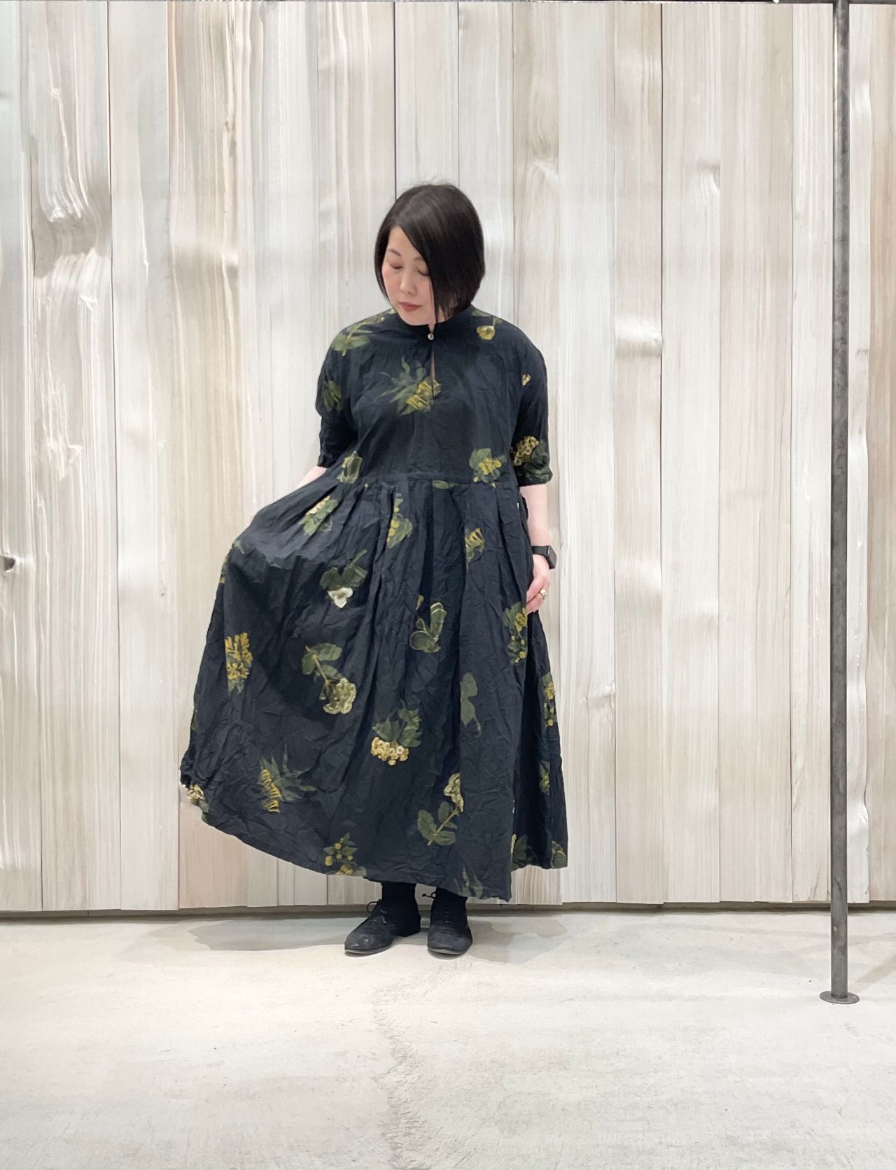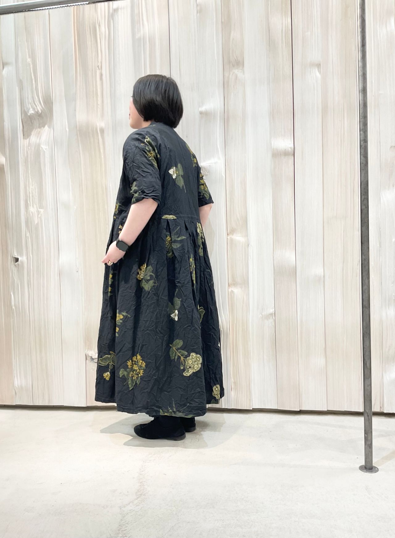 明るい夏の植物が初夏の雰囲気を醸し出して、かっちりしがちなシャツワンピースを柔らかな雰囲気に仕立てています。