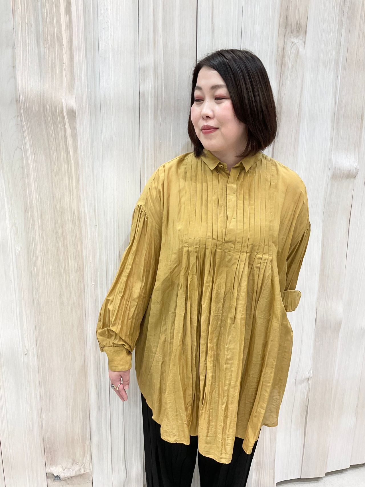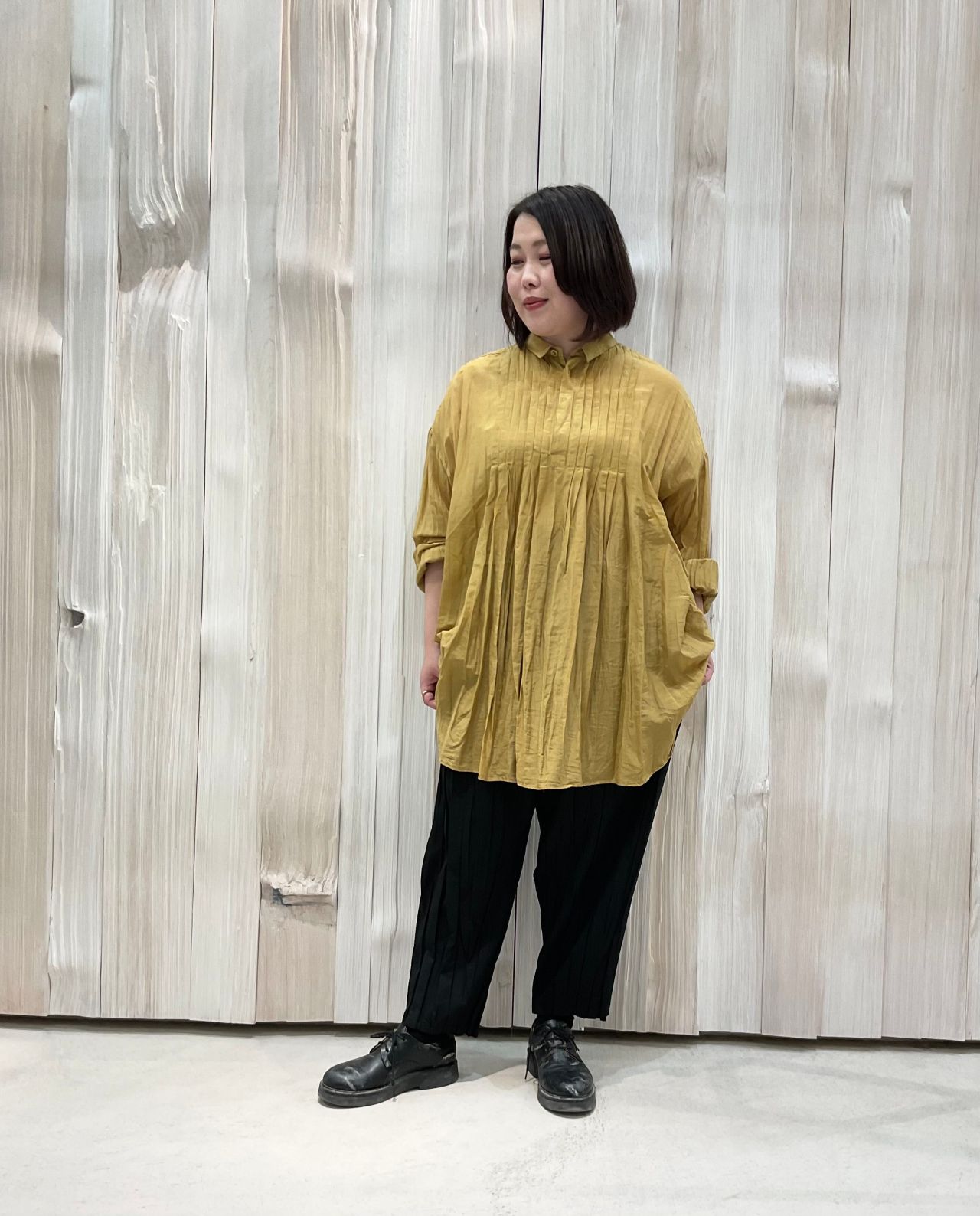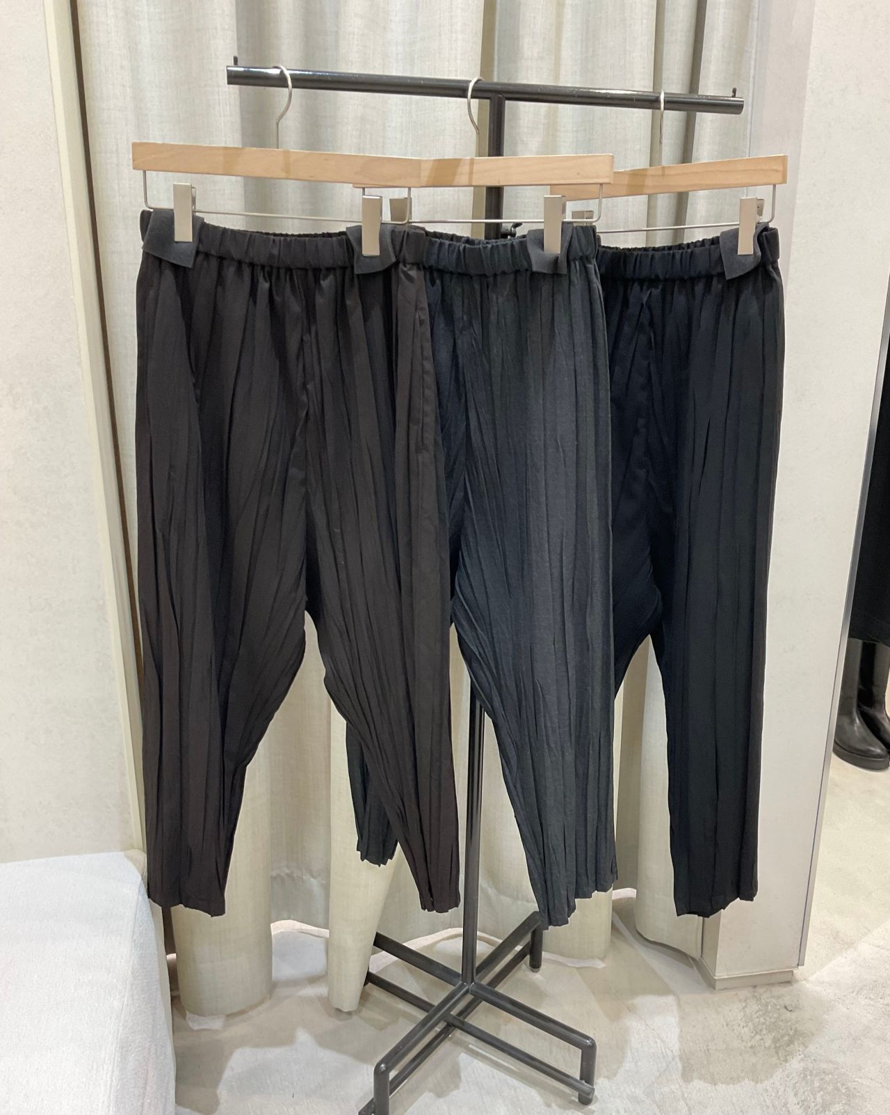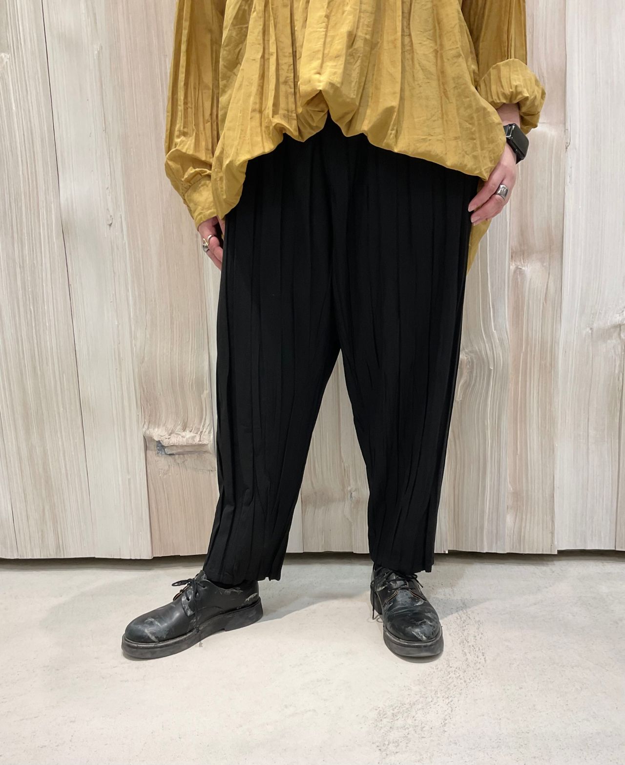 パンツは縦じわが印象的なプリーツパンツ。手で細かく手織り寄せるように折りプリーツをかけています。