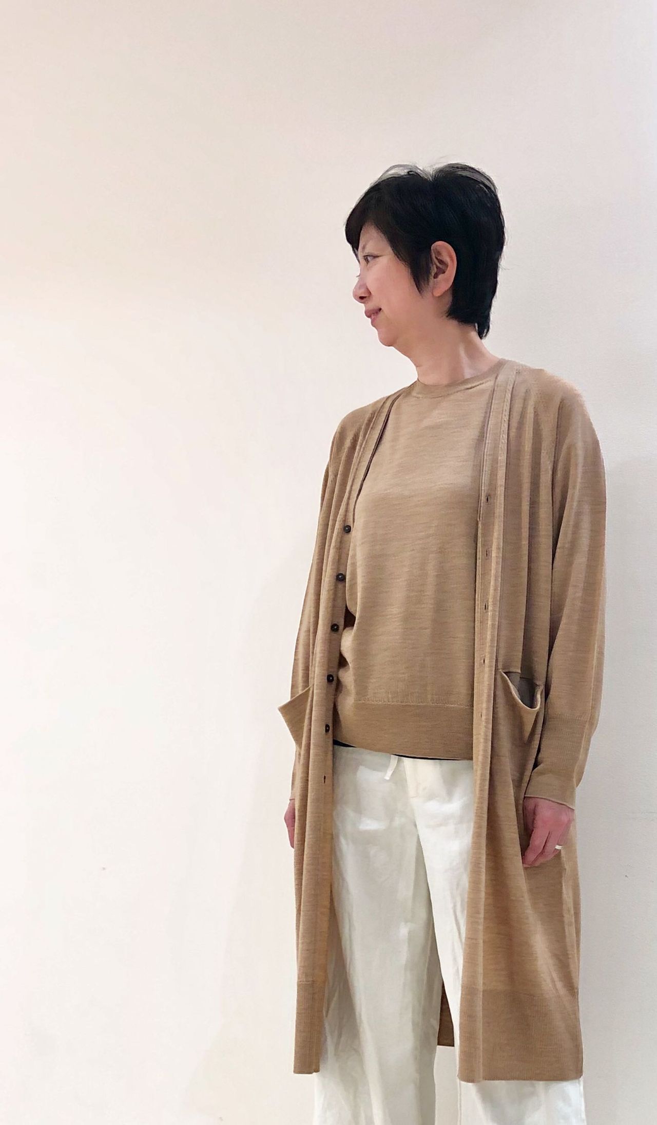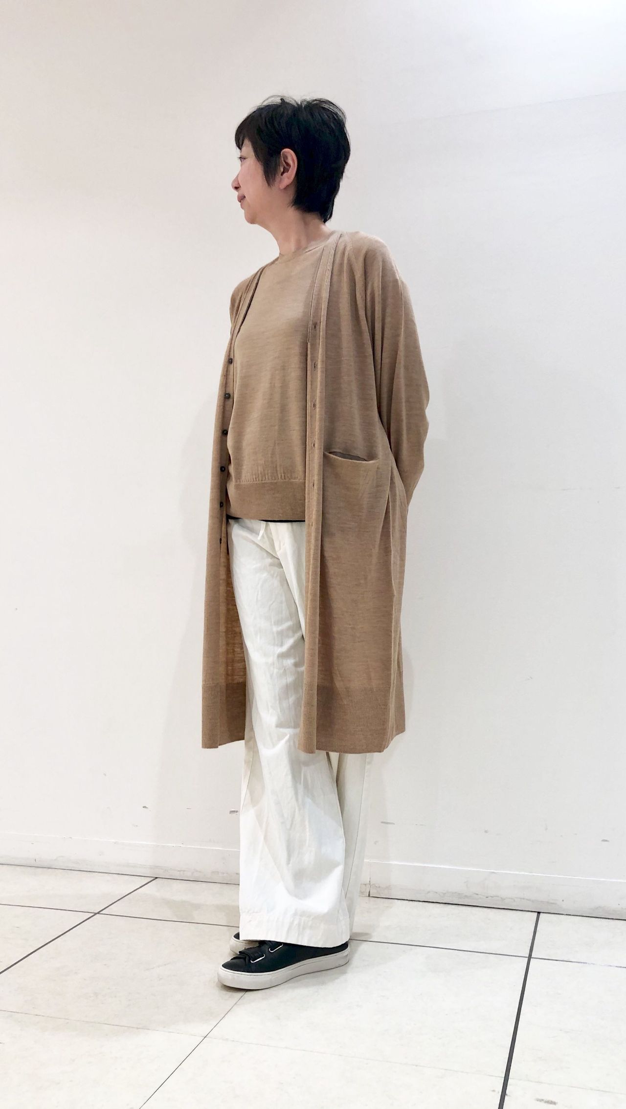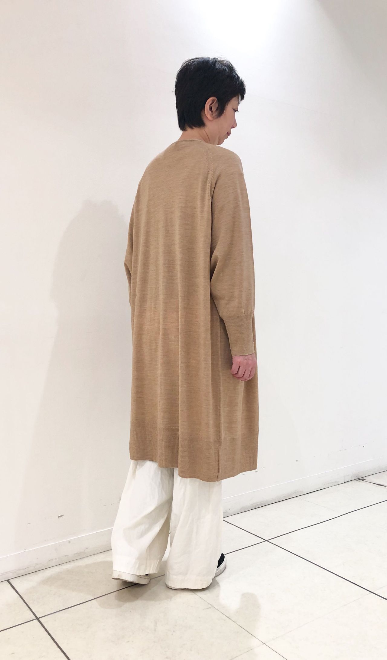 カーディガンはひざ上ロング。
