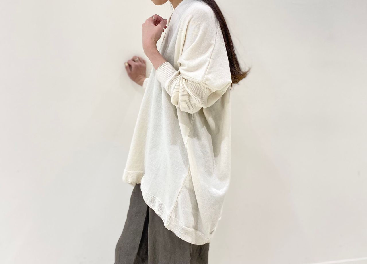 心地良い肌触りと風合いが良いカシミヤブレンドのコットンなので、冬は重ね着で、春先や秋にも着こなせるアイテムです。