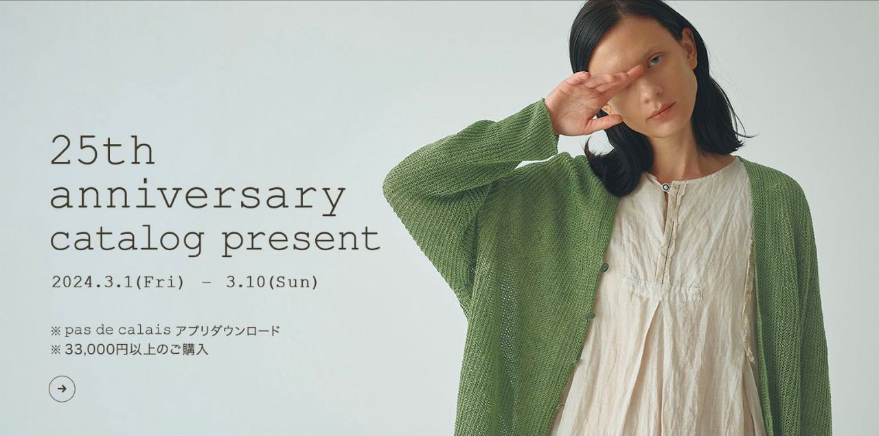 3月1日(金)〜10日(日)の期間中、パドカレ25周年を記念して、¥33,000以上ご購入、公式アプリダウンロードで、「25th Anniversary pas de calais SPRING / SUMMER 2024」カタログをプレゼントします。(無くなり次第、終了となります。)