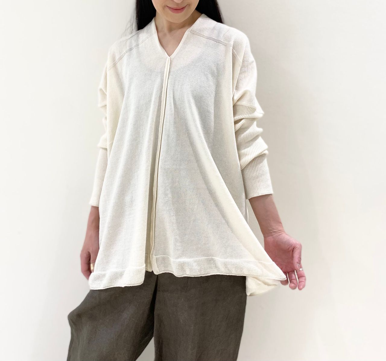 身頃を広げるとスクエア型になるたっぷりしたシルエットに、腕に沿うようなリブをつけました。